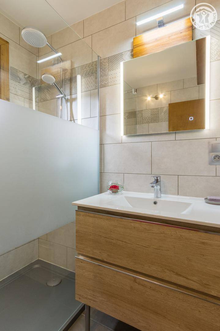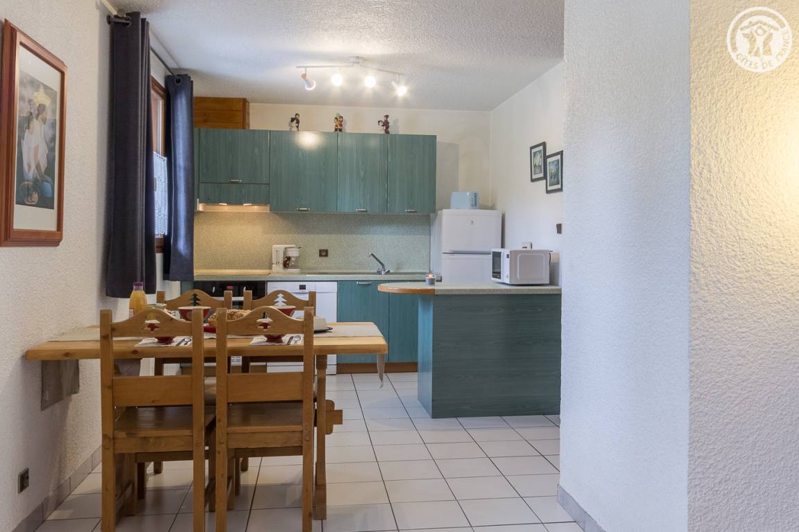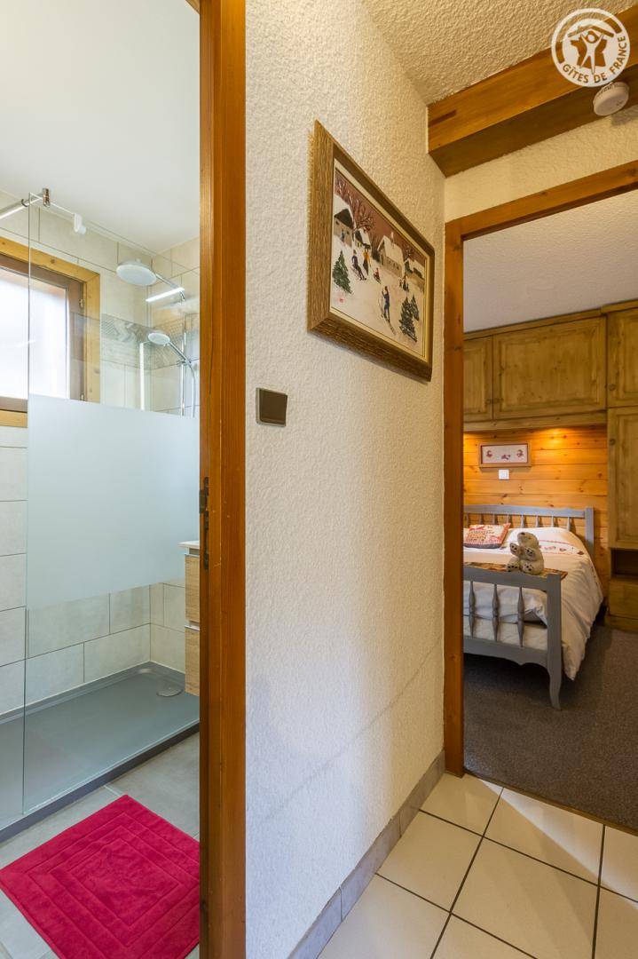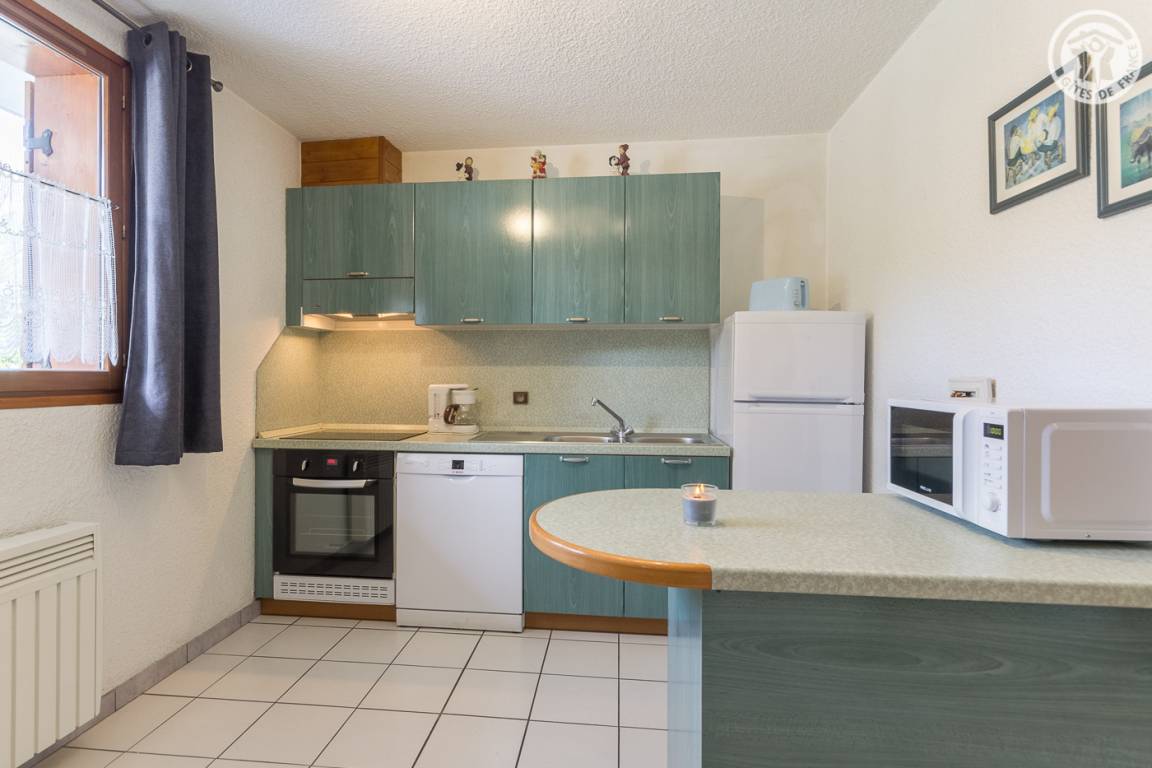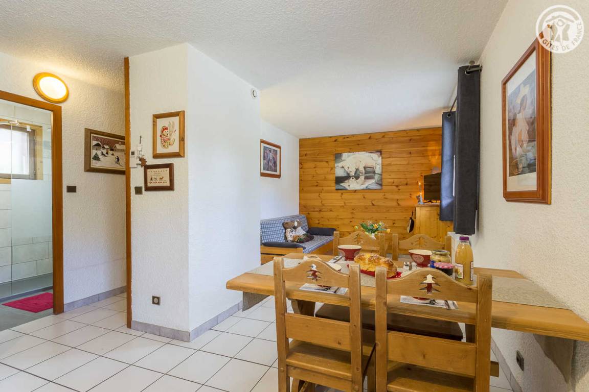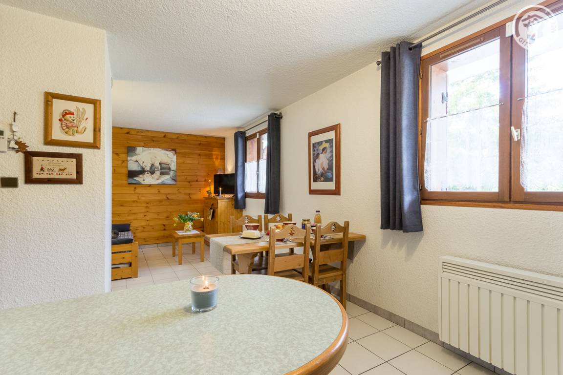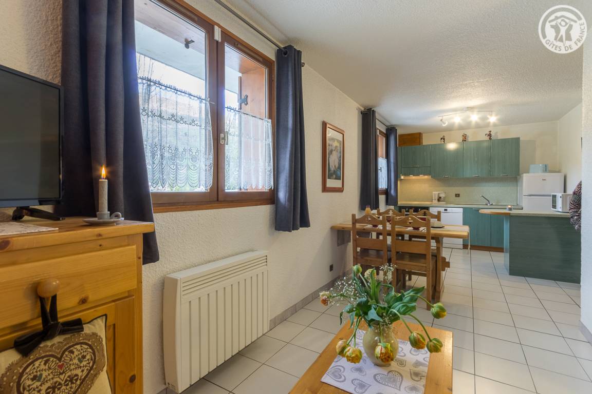 Gite in einem Reihenhaus mit 1 Gite im 1. Stock und einer weiteren Unterkunft. Erdgeschoss bestehend aus Wohnküche, Wohnbereich mit ausziehbarem Sofa (2 Einzelbetten), Schlafzimmer (1 Doppelbett), Badezimmer (begehbare Dusche), separates WC. Gemeinsamer kleiner Außenraum. Gemeinsamer Eingang mit Zugang zur Waschmaschine und der Garage zum Abstellen von Skiern und Fahrrädern.