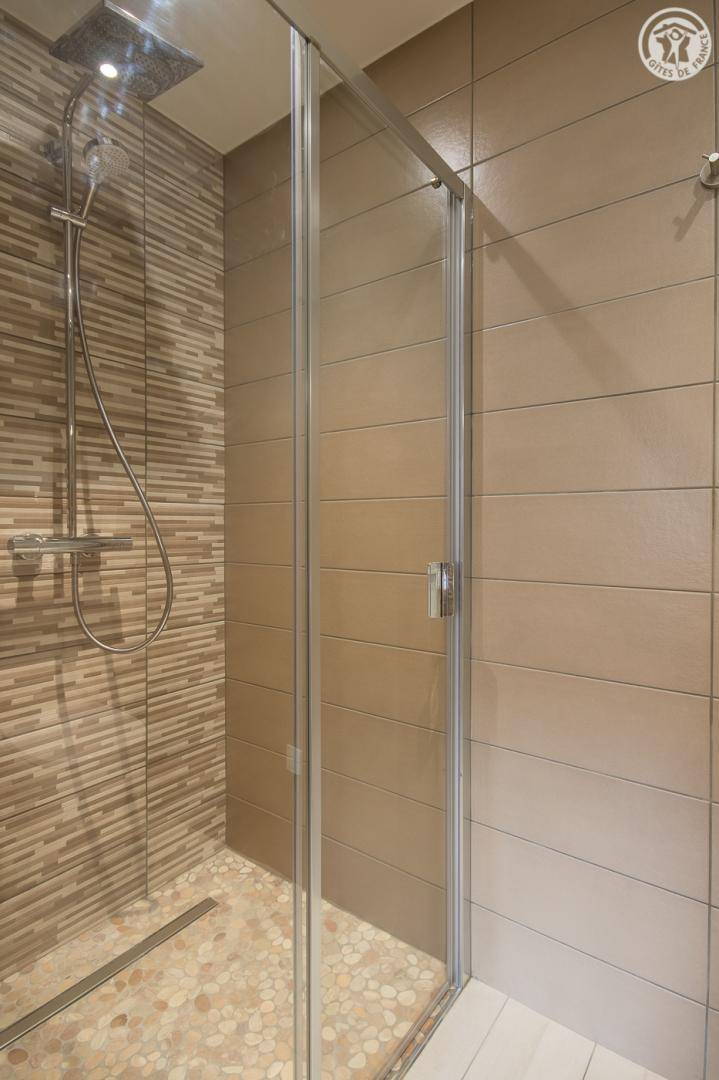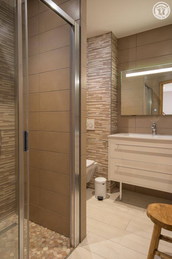 Einfamilienhaus am Hang, auf 3 Ebenen. ebenerdiger Eingang vom Parkplatz (Ebene 0) in die Wohnküche (Hohe Bar für 4 Personen und Tisch für 10 Personen) Loungebereich (CanalSat mit HDMI-Anschluss, Radios), separates WC, Terrasse. 1. Stock: ein Schlafzimmer (1 Doppelbett 160 x 200) mit Bad (Dusche und WC), mit 2 Fenstern, davon 1 am zweiten Tag mit Blick auf das Wohnzimmer. Garten - Ebene (Ebene -1): 2 Schlafzimmer (1 Doppelbett 160 x 200 cm pro Stück) mit Bad (Dusche und WC), 1 Schlafzimmer (1 Bett 160 x 200 cm) mit Dusche, 2 Schlafzimmer , davon 1 ohne Öffnung nach außen (4 Etagenbetten / 1 Doppelbett), ein Badezimmer (Badewanne), separates WC.