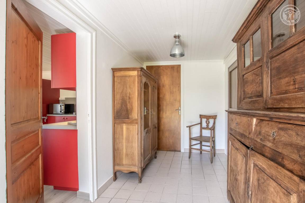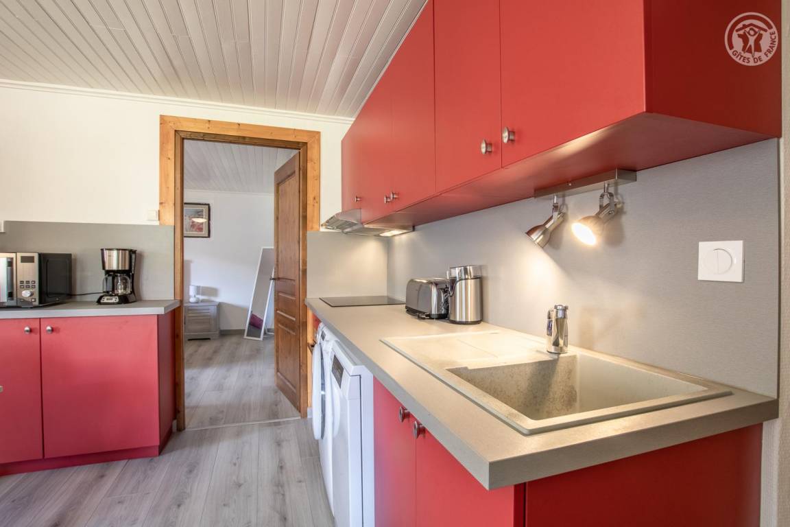 Ferienhaus in einem Einfamilienhaus mit 2 weiteren Unterkünften. Ferienhaus im Erdgeschoss, bestehend aus einem Eingang, einer Wohnküche (Schlafsofa für 2 Personen 140 x 190 cm), einem Schlafzimmer (1 Doppelbett 140 x 190 cm) mit Dusche und separatem WC, einer Waschküche. Terrasse und abgestufter Garten.