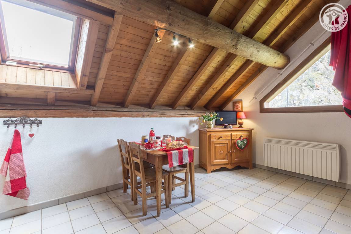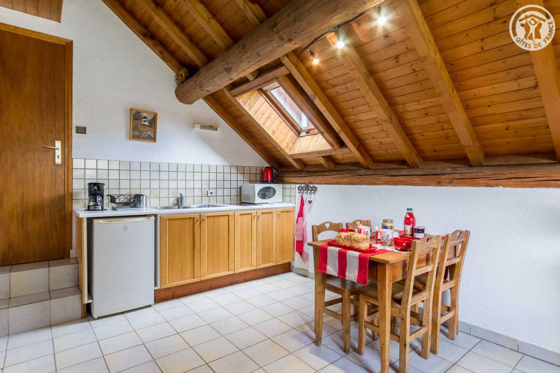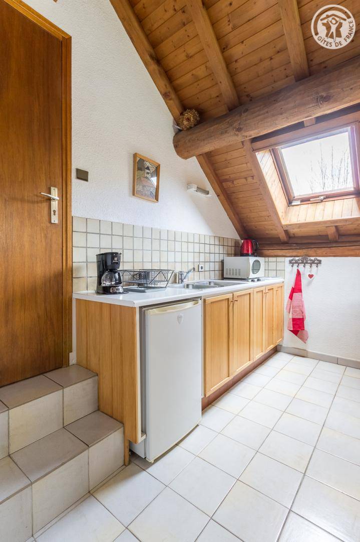 Gite in einem Reihenhaus bestehend aus 1 Gite im Erdgeschoss und einer weiteren Unterkunft. Studio im 1. Stock mit Kochnische, Wohnzimmer mit Doppelbett, Badezimmer (Dusche) mit WC. Gemeinsamer kleiner Außenraum. Gemeinsamer Eingang mit Zugang zur Waschmaschine und der Garage zum Abstellen von Skiern und Fahrrädern.