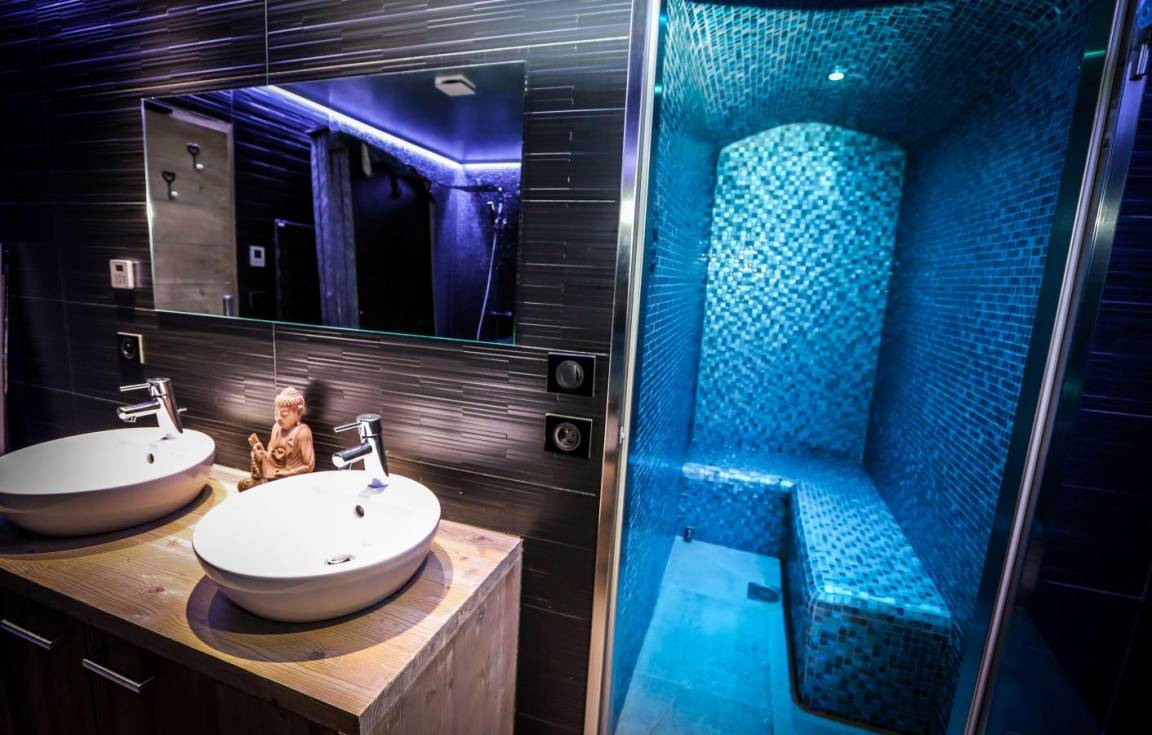 Fläche von ungefähr 100 m². Wohnzimmer. Schlafzimmer mit Doppelbett (160), TV. Schlafzimmer mit Doppelbett (140), TV. 2 Schlafzimmer mit 2 Einzelbetten, TV. Küche mit Raclettegerät, Kaffeemaschine, Backofen, Toaster, Geschirrspülmaschine, Mikrowellenherd, Glaskeramikkochfelder, Kühl-Gefrier-Kombination. Waschküche mit Waschmaschine, Wäschetrockner. Badezimmer mit Badewanne, Haartrockner, WC. Waschräume mit Dusche, Haartrockner. separates WC. Balkon. 2 Terrassen.
