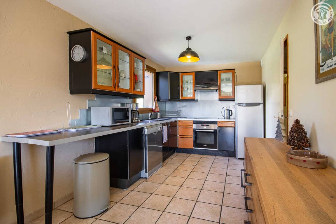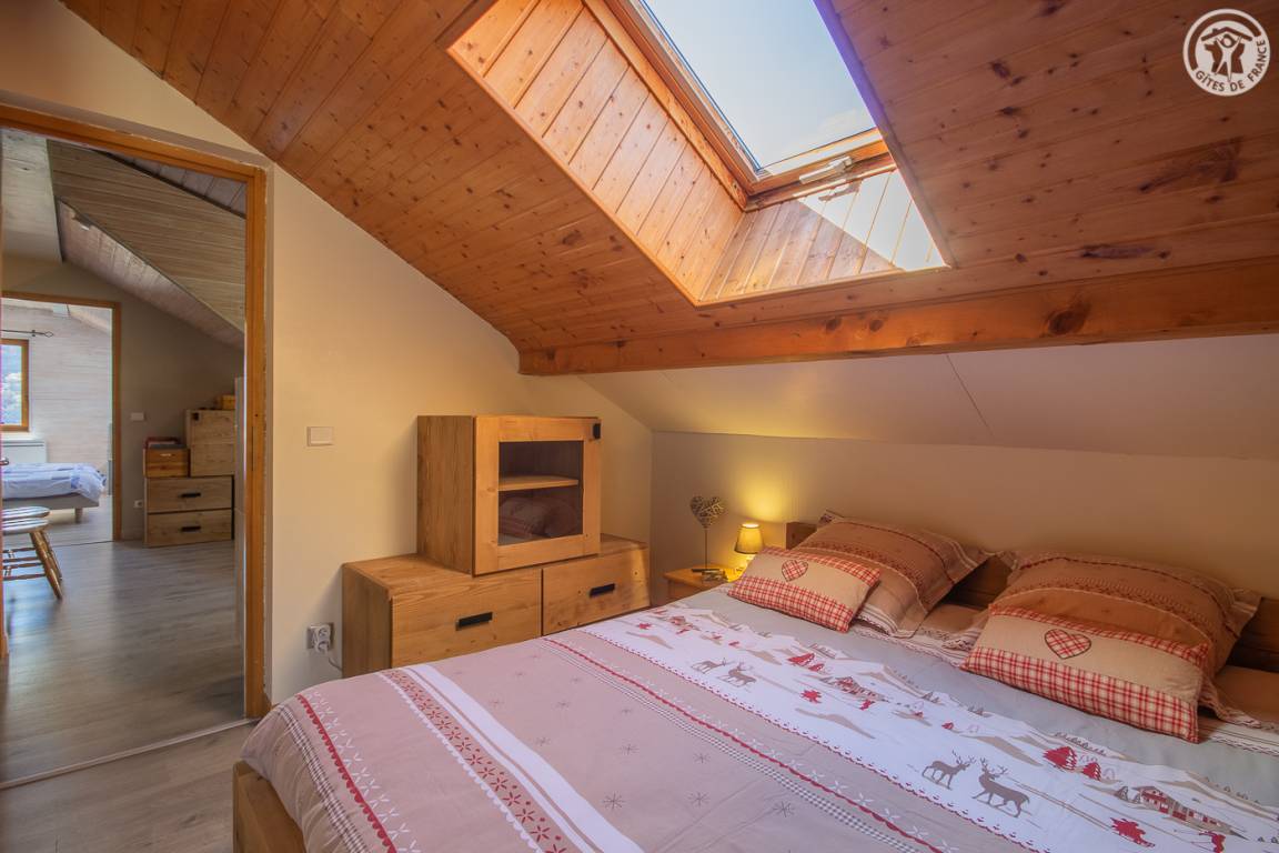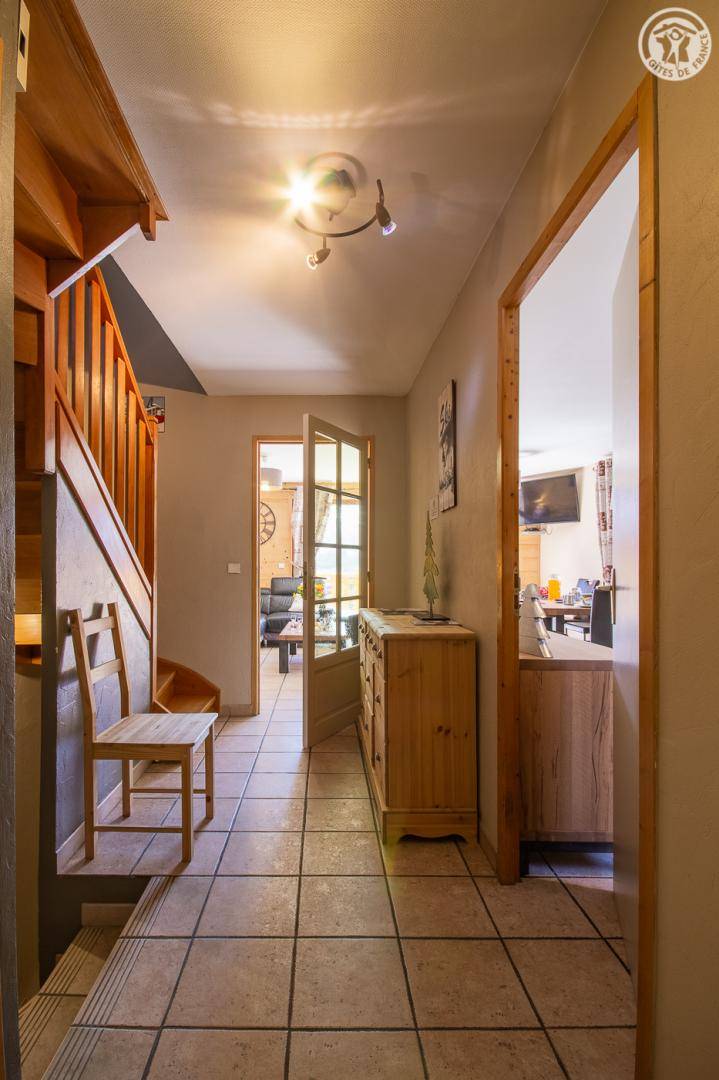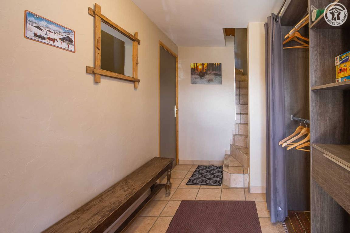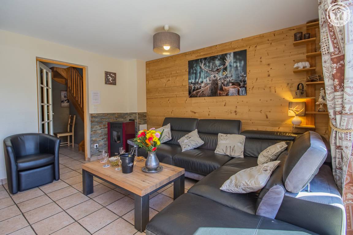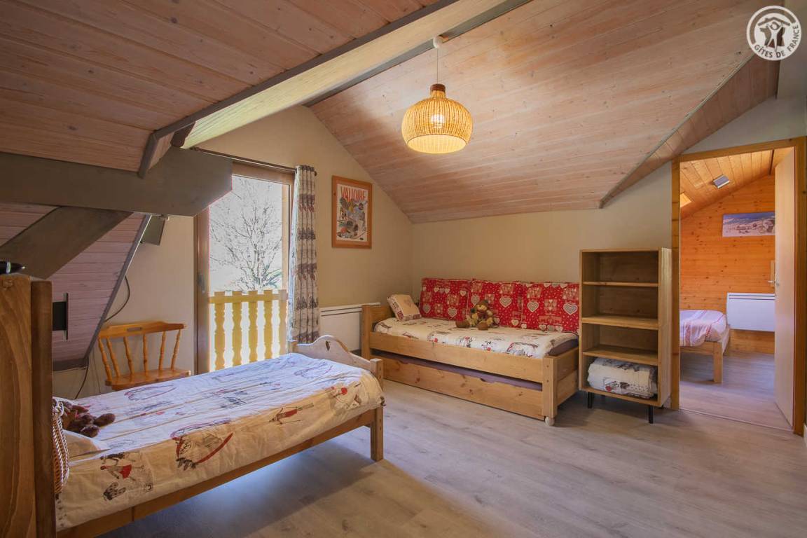 Gite auf 3 Ebenen im Haus mit 2 Unterkünften (Eigentümer und Studio + Schlafzimmer ganzjährig vermietet). Unabhängiger Zugang: Eingangshalle. 1. Stock: Wohnzimmer-Küche (Pelletofen mit manueller Aufladung), Ecke Balkon, ein Schlafzimmer (2 Etagenbetten und 1 Doppelbett 160 x 200 cm) mit einem Badezimmer (Badewanne und 2 Waschbecken), separates WC. 2. Stock: 2 Schlafzimmer im Dachgeschoss (3 Einzelbetten, 2 davon kombinierbar zu 1 Doppelbett 180 x 190 cm / 1 Doppelbett 160 x 200 cm; 1 Einzelbett), ein Zwischengeschoss als Lounge-Bereich mit Fernseher (2 Einzelbetten), ein Badezimmer (Dusche und WC). Gesamtnutzfläche: 109 m² inklusive Dachschrägen. Privater Außenbereich (Tischtennis, Trampolin, Gartenmöbel). Waschmaschine und Trockner in der Garage im Erdgeschoss, in der Sie auch Skier und Fahrräder abstellen können. Privater Parkplatz für 3 Autos.