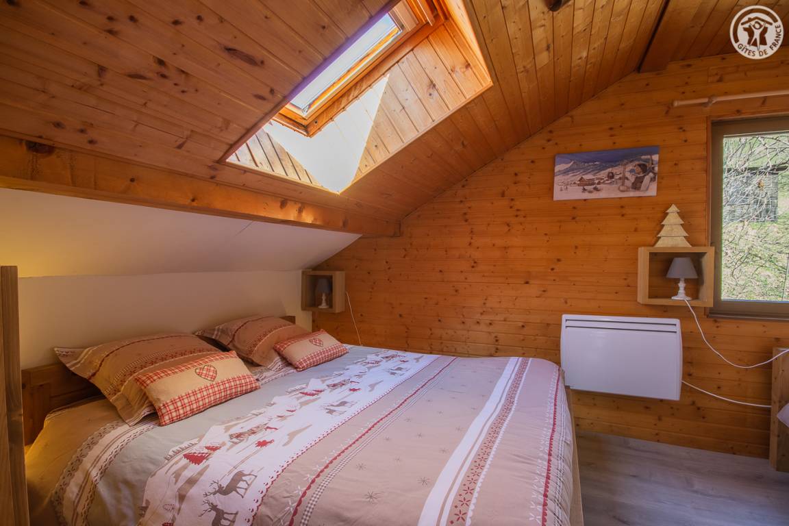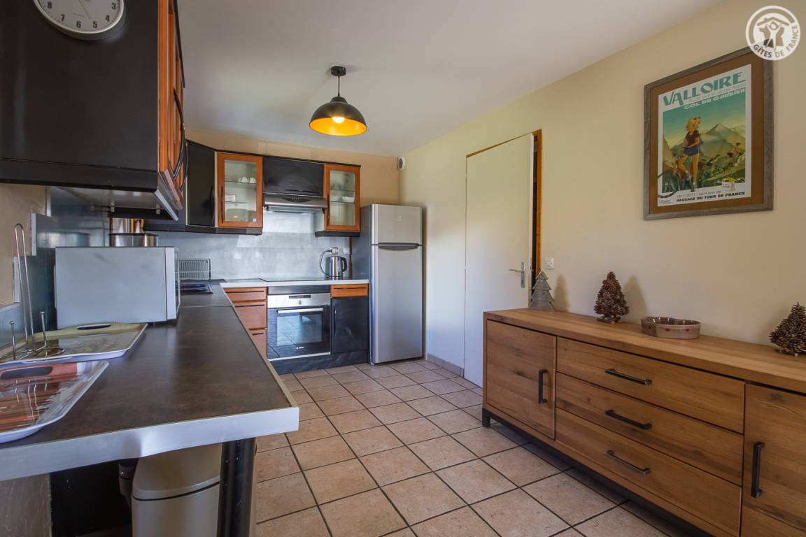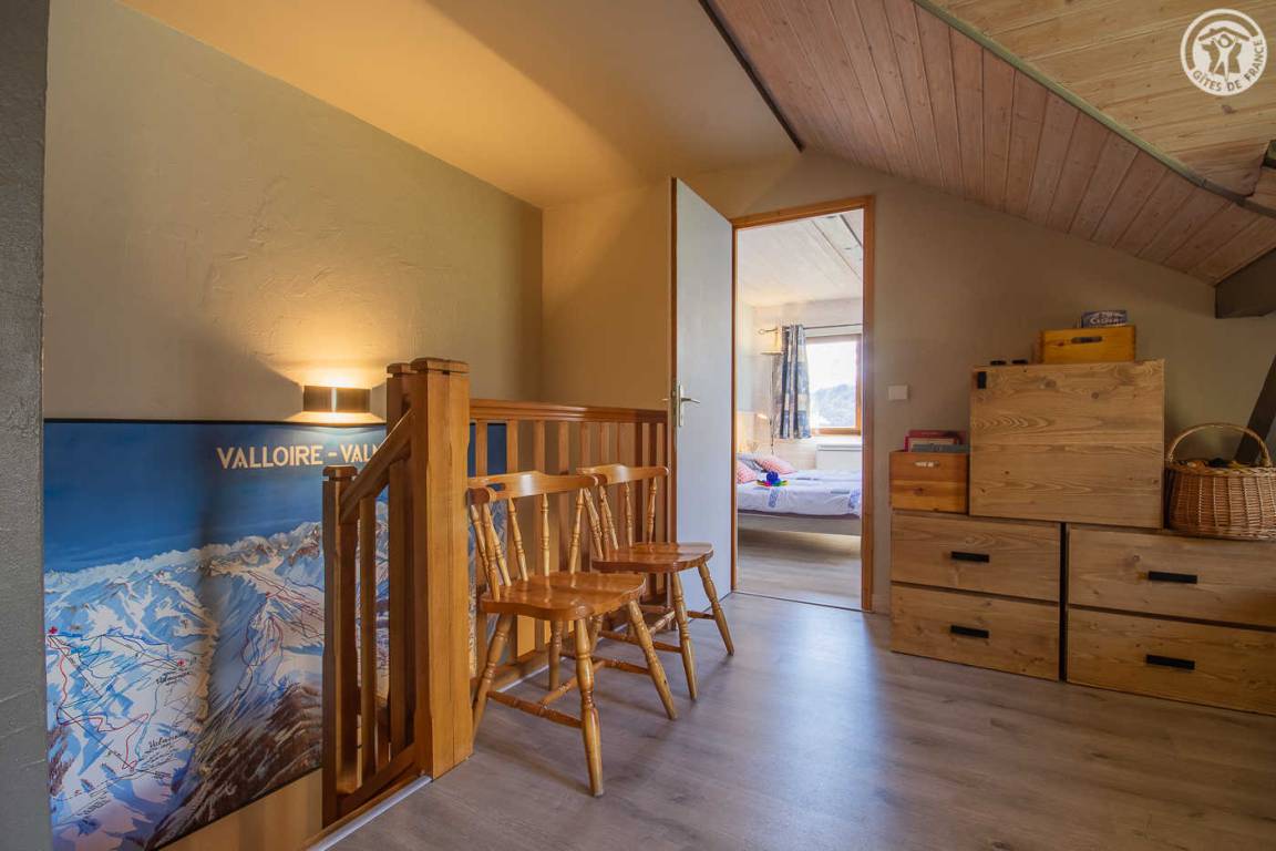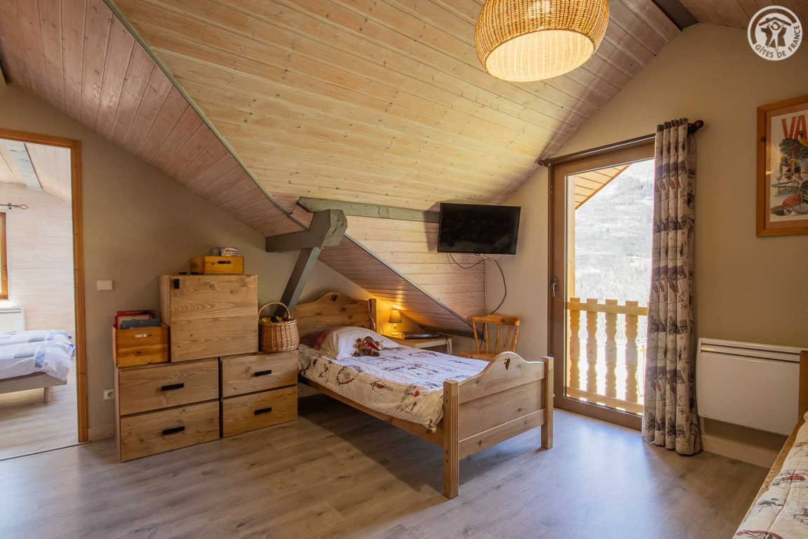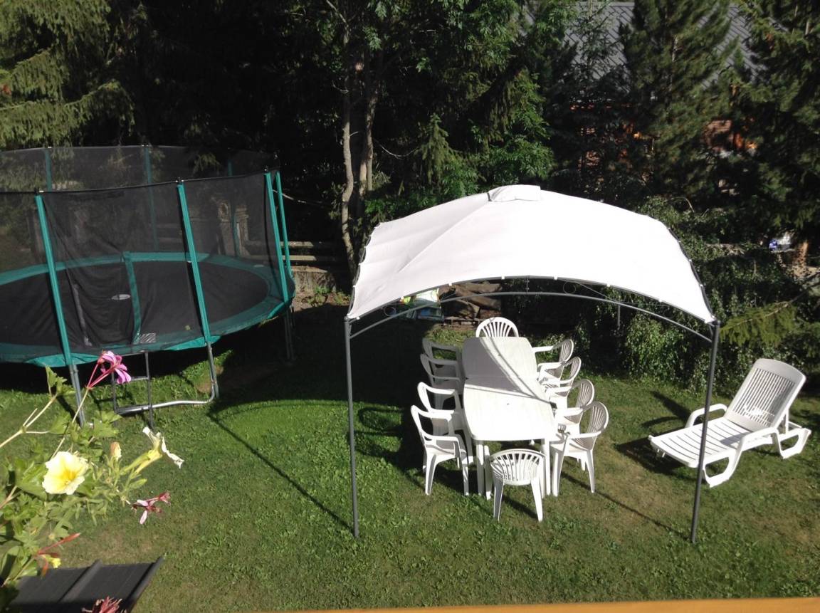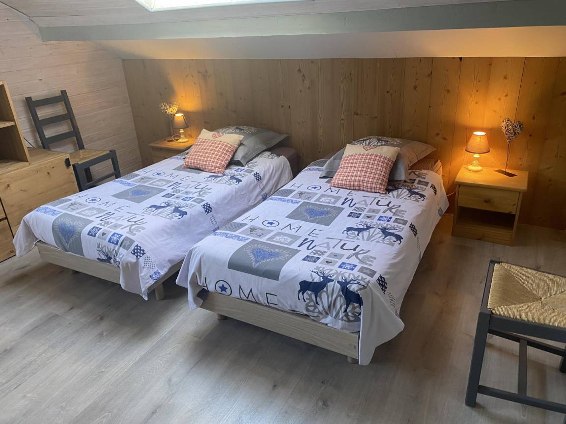 Gite auf 3 Ebenen im Haus mit 2 Unterkünften (Eigentümer und Studio + Schlafzimmer ganzjährig vermietet). Unabhängiger Zugang: Eingangshalle. 1. Stock: Wohnzimmer-Küche (Pelletofen mit manueller Aufladung), Ecke Balkon, ein Schlafzimmer (2 Etagenbetten und 1 Doppelbett 160 x 200 cm) mit einem Badezimmer (Badewanne und 2 Waschbecken), separates WC. 2. Stock: 2 Schlafzimmer im Dachgeschoss (3 Einzelbetten, 2 davon kombinierbar zu 1 Doppelbett 180 x 190 cm / 1 Doppelbett 160 x 200 cm; 1 Einzelbett), ein Zwischengeschoss als Lounge-Bereich mit Fernseher (2 Einzelbetten), ein Badezimmer (Dusche und WC). Gesamtnutzfläche: 109 m² inklusive Dachschrägen. Privater Außenbereich (Tischtennis, Trampolin, Gartenmöbel). Waschmaschine und Trockner in der Garage im Erdgeschoss, in der Sie auch Skier und Fahrräder abstellen können. Privater Parkplatz für 3 Autos.