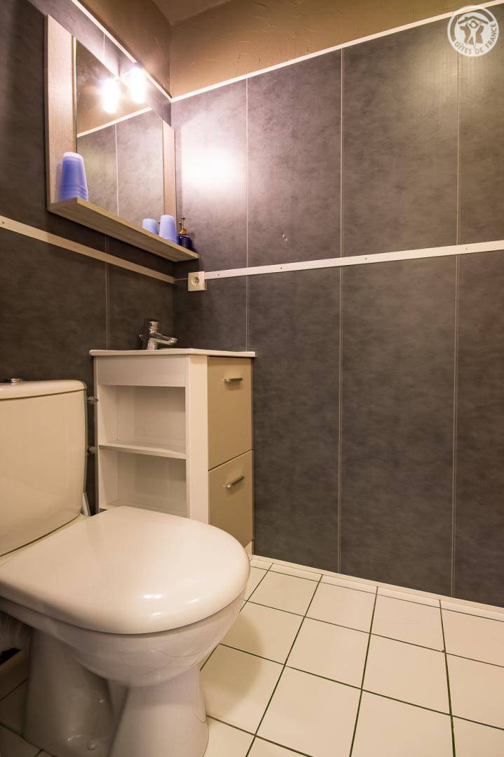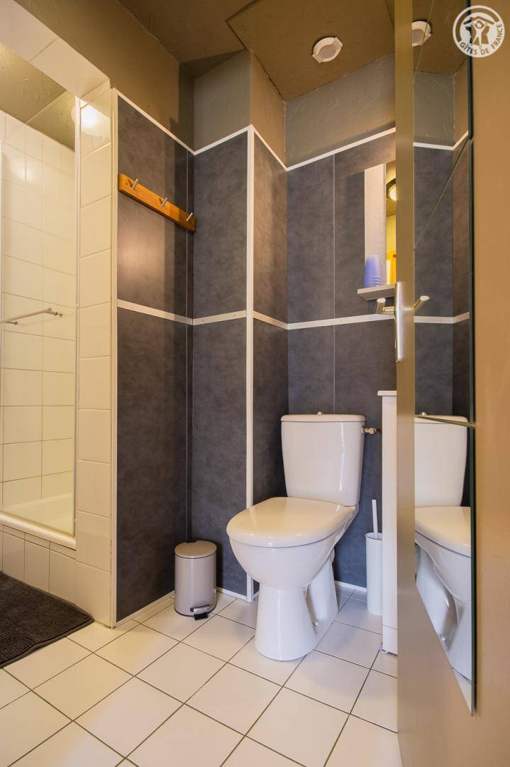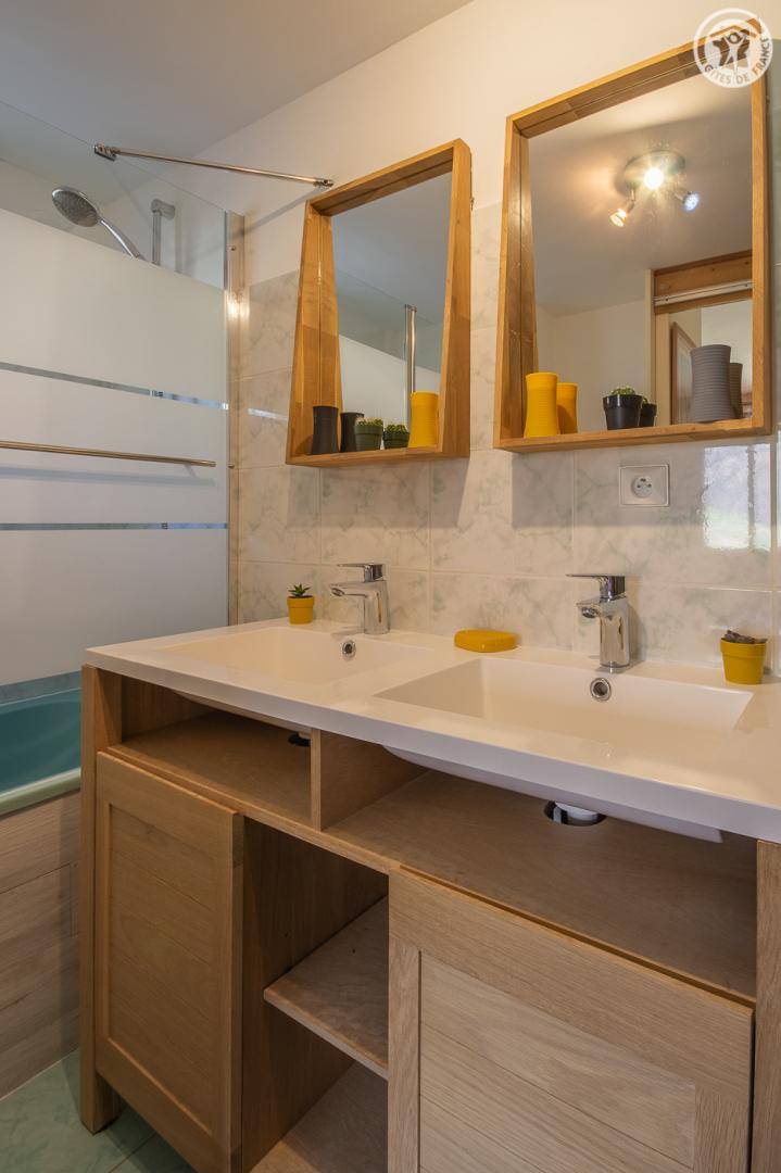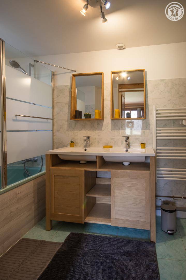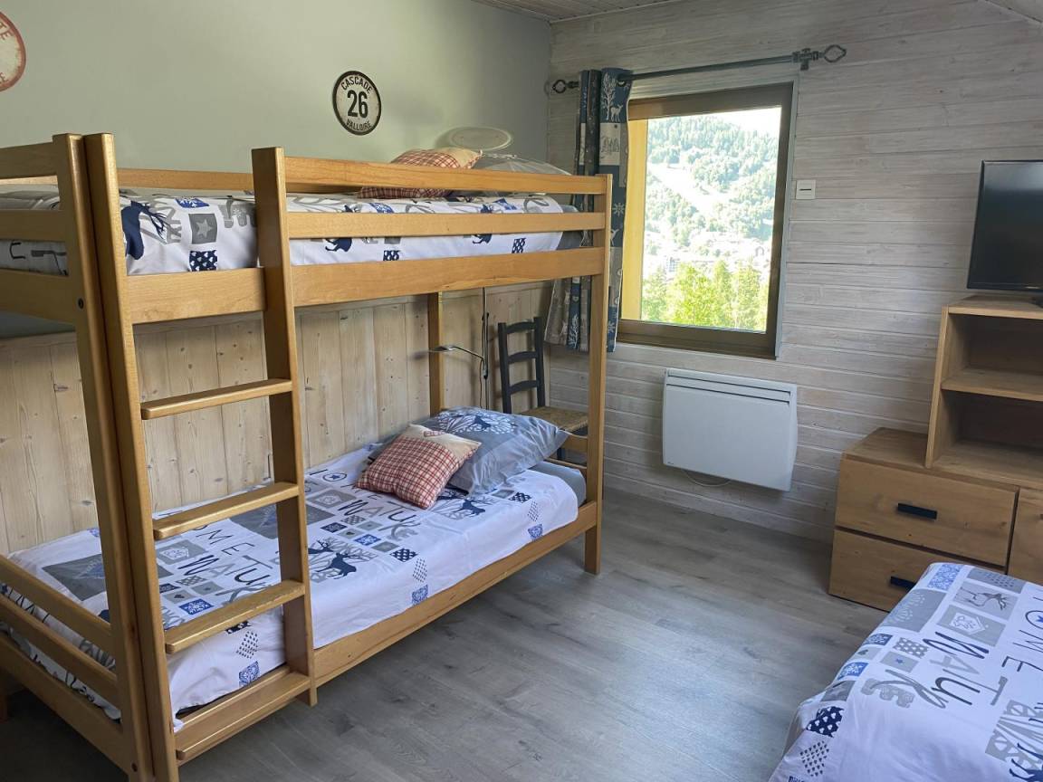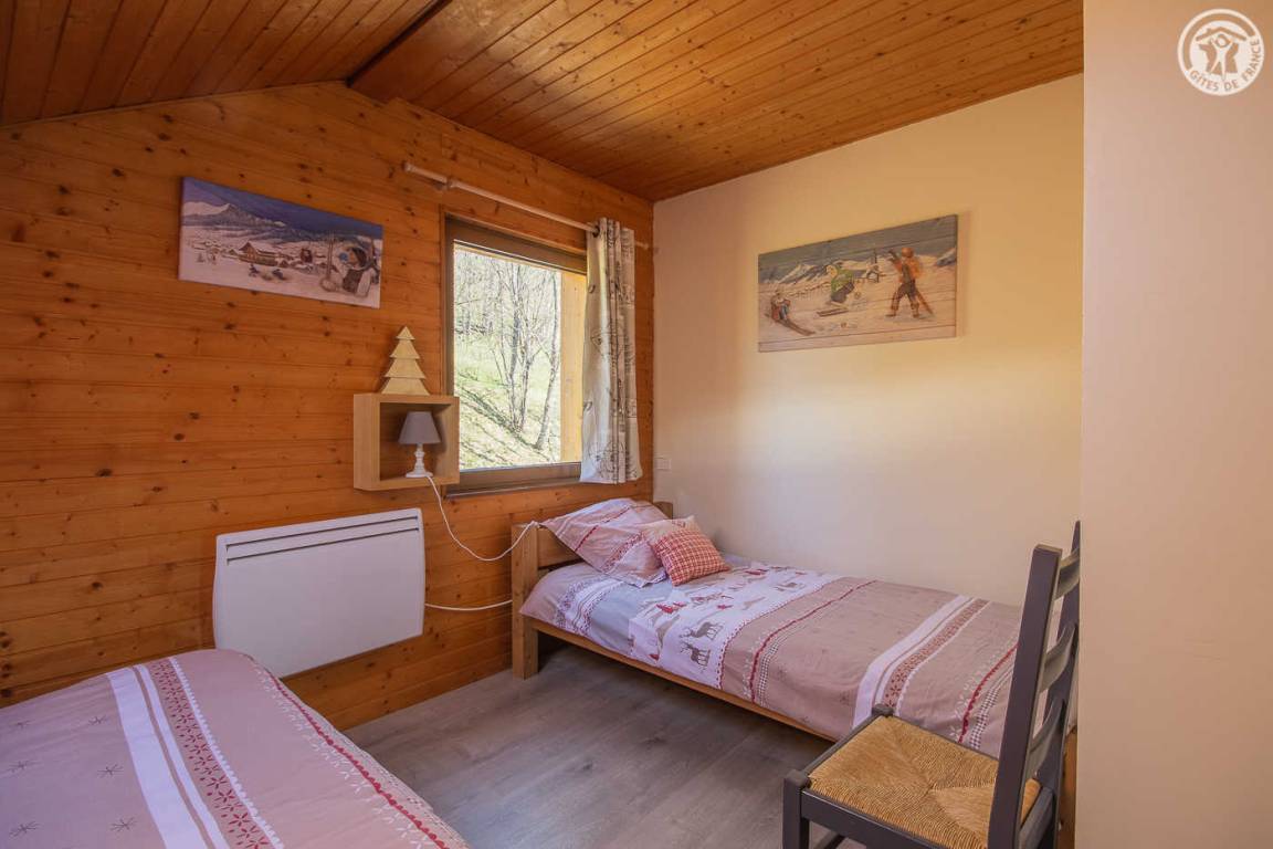 Gite auf 3 Ebenen im Haus mit 2 Unterkünften (Eigentümer und Studio + Schlafzimmer ganzjährig vermietet). Unabhängiger Zugang: Eingangshalle. 1. Stock: Wohnzimmer-Küche (Pelletofen mit manueller Aufladung), Ecke Balkon, ein Schlafzimmer (2 Etagenbetten und 1 Doppelbett 160 x 200 cm) mit einem Badezimmer (Badewanne und 2 Waschbecken), separates WC. 2. Stock: 2 Schlafzimmer im Dachgeschoss (3 Einzelbetten, 2 davon kombinierbar zu 1 Doppelbett 180 x 190 cm / 1 Doppelbett 160 x 200 cm; 1 Einzelbett), ein Zwischengeschoss als Lounge-Bereich mit Fernseher (2 Einzelbetten), ein Badezimmer (Dusche und WC). Gesamtnutzfläche: 109 m² inklusive Dachschrägen. Privater Außenbereich (Tischtennis, Trampolin, Gartenmöbel). Waschmaschine und Trockner in der Garage im Erdgeschoss, in der Sie auch Skier und Fahrräder abstellen können. Privater Parkplatz für 3 Autos.