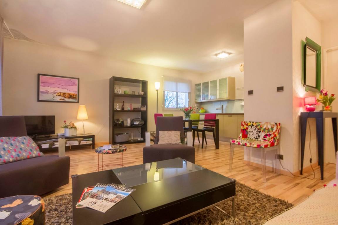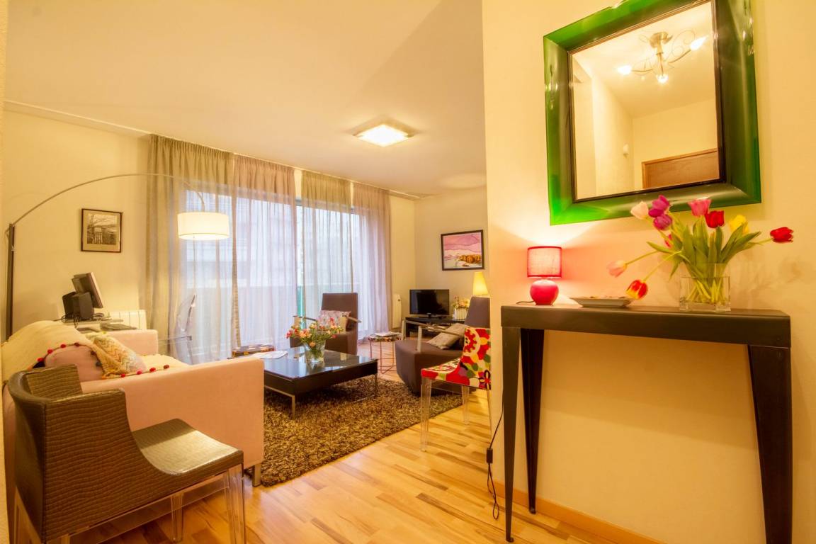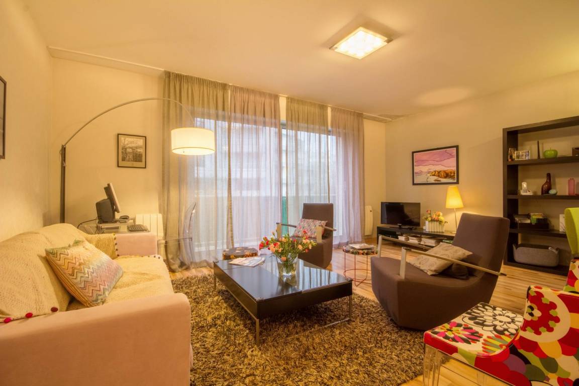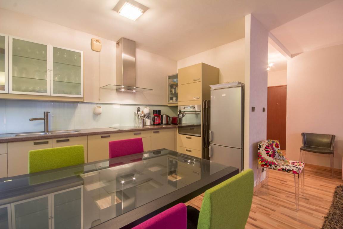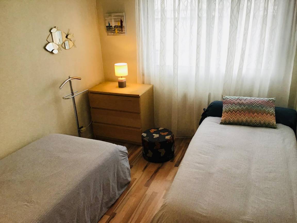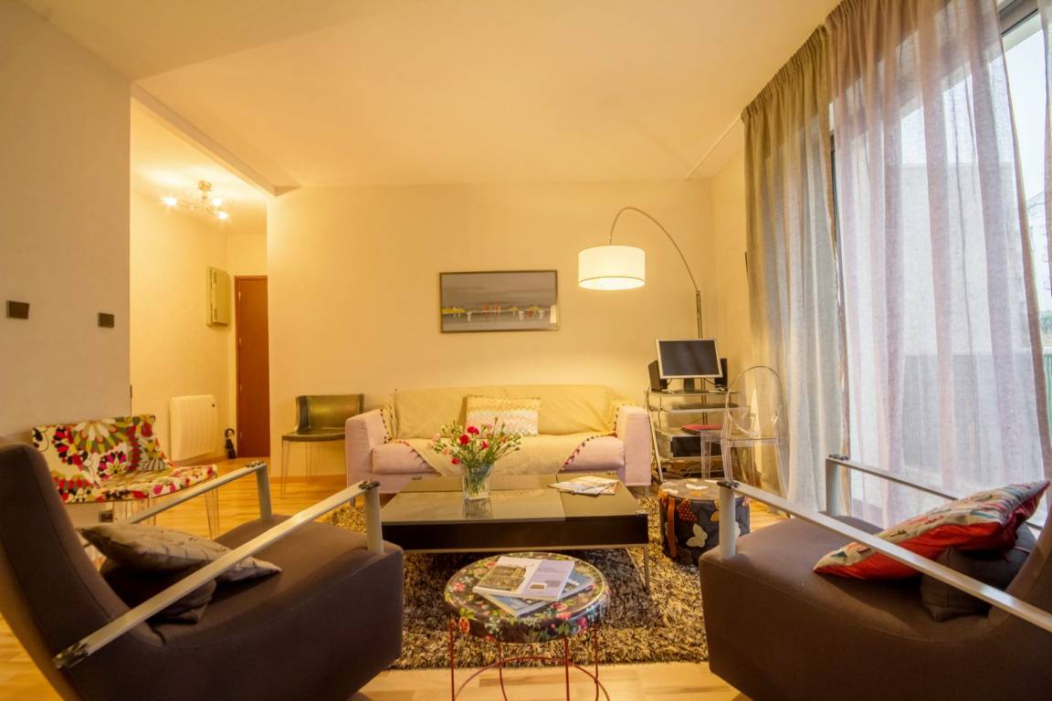 Die Wohnung befindet sich im 2. Stock, mit Aufzug. Es besteht aus einem schönen Wohnzimmer, schön eingerichtet und von sehr gutem Standard mit voll ausgestatteter Küche, einem Wohnzimmer und einer Lounge mit Zugang zu einem Westbalkon. Dann zwei Schlafzimmer (eines mit 1 Doppelbett und das andere mit 1 Doppelbett und 1 Einzelbett), ein Badezimmer, eine separate Toilette.