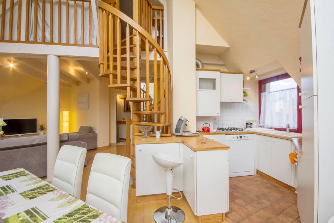 Come to the Art and History Heritage town of Vannes for a seaside holiday at the heart of Morbihan. Explore the Gulf of Morbihan, listed as one of the most beautiful bays in the world, with its ever-changing scenery including coves, headlands, islets and tiny harbours. For seaside fun there is a beach at nearby Conleau (5 minutes) and to discover the treasures of the Gulf, take a cruise around its islands from the harbour (5 minutes) or a day trip to Belle-Ile or Houat off the Atlantic coast - a real change of scenery ! During your stay, don't miss the historic centre of Vannes with its cobbled streets, half-timbered houses and gardens or its bustling harbour. The town is ideally-situated for visiting the region and its landmark sites such as Carnac, Quiberon, Lorient, Sarzeau, Rochefort-en-Terre and Brocéliande. A flat on the first (top) floor of a block of 6 apartments with private exterior steps. Attractively-decorated lounge-diner and open-plan kitchen opening onto small balcony. B
