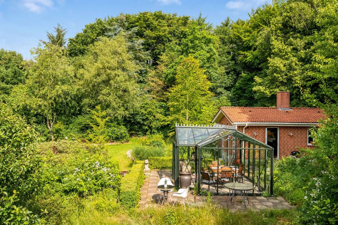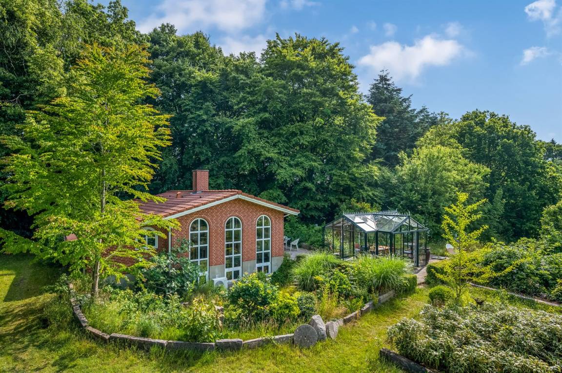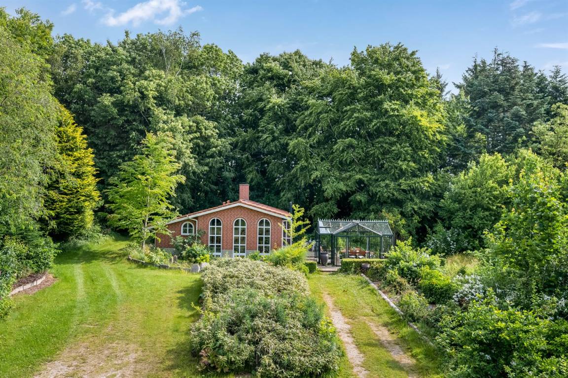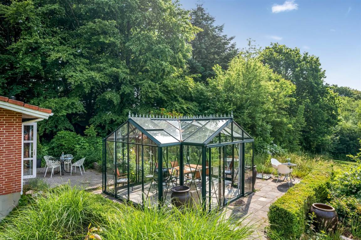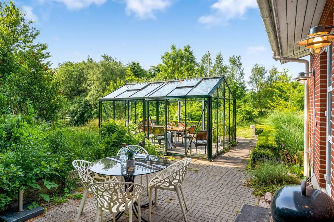 Das Haus liegt auf einem 19.000 m² großen Naturgrundstück, jedoch in unmittelbarer Nähe der kleinen Stadt Næsbjerg. Hier gibt es Ruhe und Natur pur. Man kann die Natur auf der Terrasse und in der Umgebung um das Haus herum genießen, und wenn das Wetter nicht so gut ist, kann man die Ruhe und den Urlaub im Gewächshaus genießen.