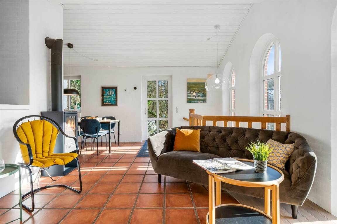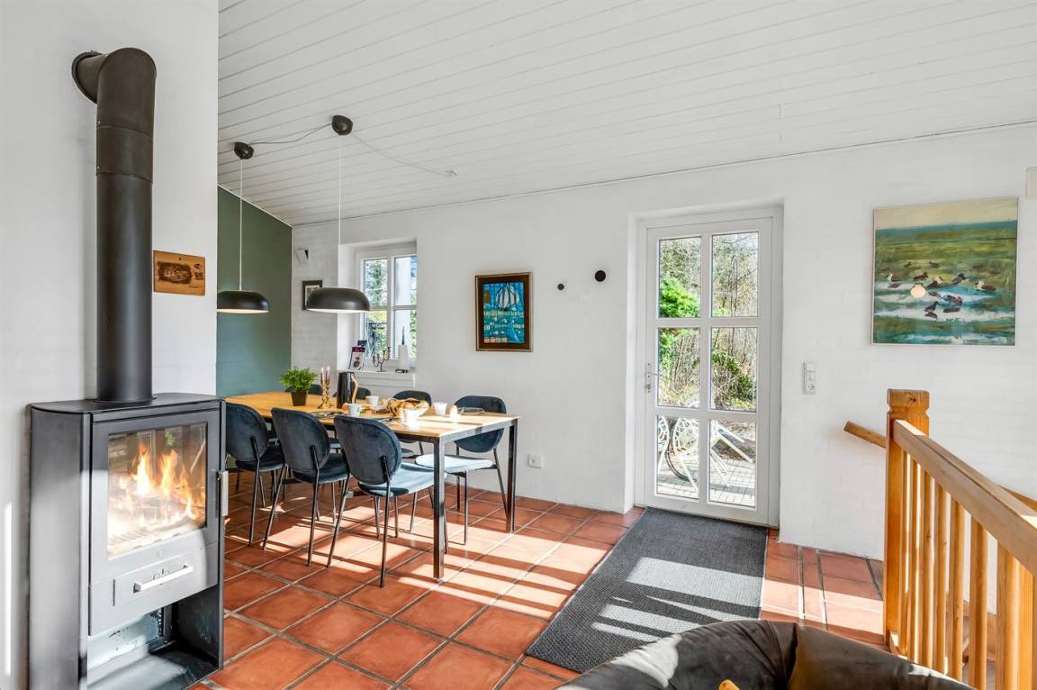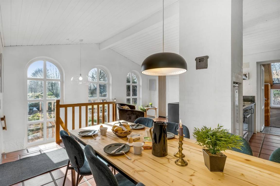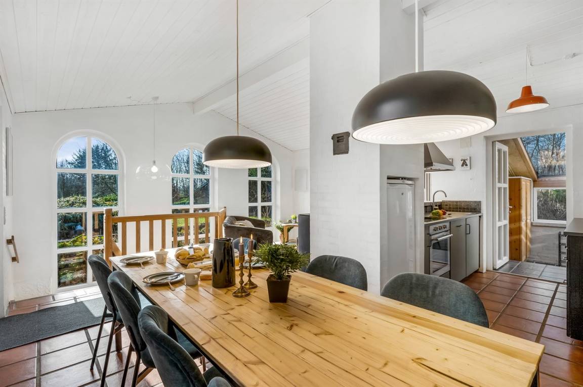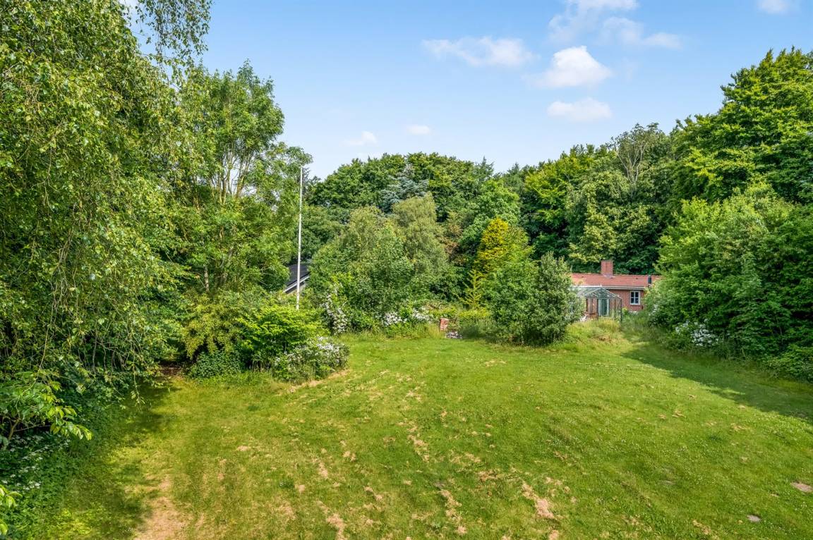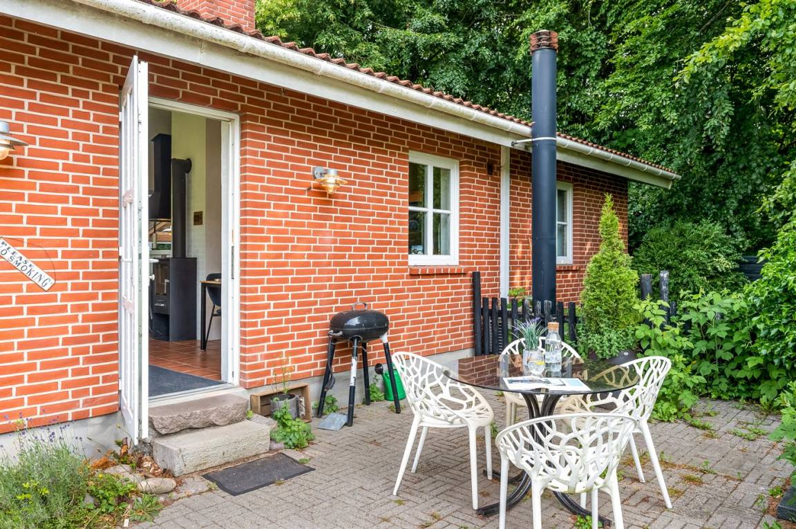 Das Haus liegt auf einem 19.000 m² großen Naturgrundstück, jedoch in unmittelbarer Nähe der kleinen Stadt Næsbjerg. Hier gibt es Ruhe und Natur pur. Man kann die Natur auf der Terrasse und in der Umgebung um das Haus herum genießen, und wenn das Wetter nicht so gut ist, kann man die Ruhe und den Urlaub im Gewächshaus genießen.