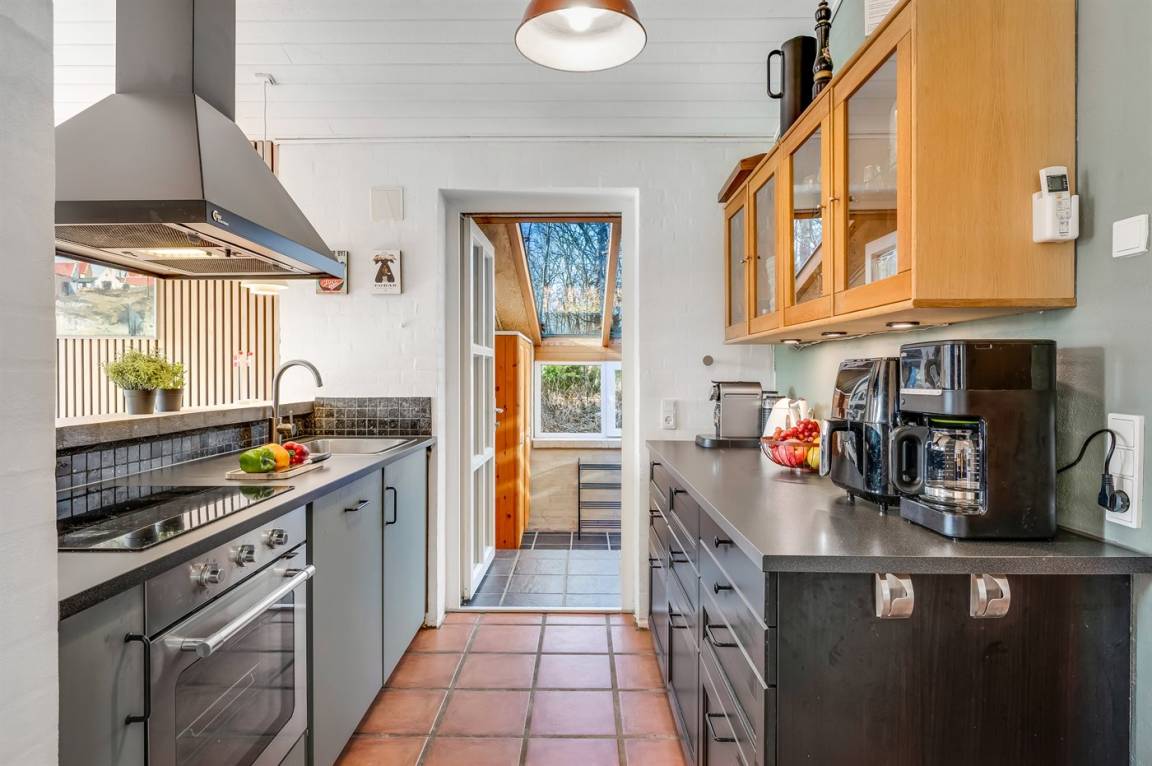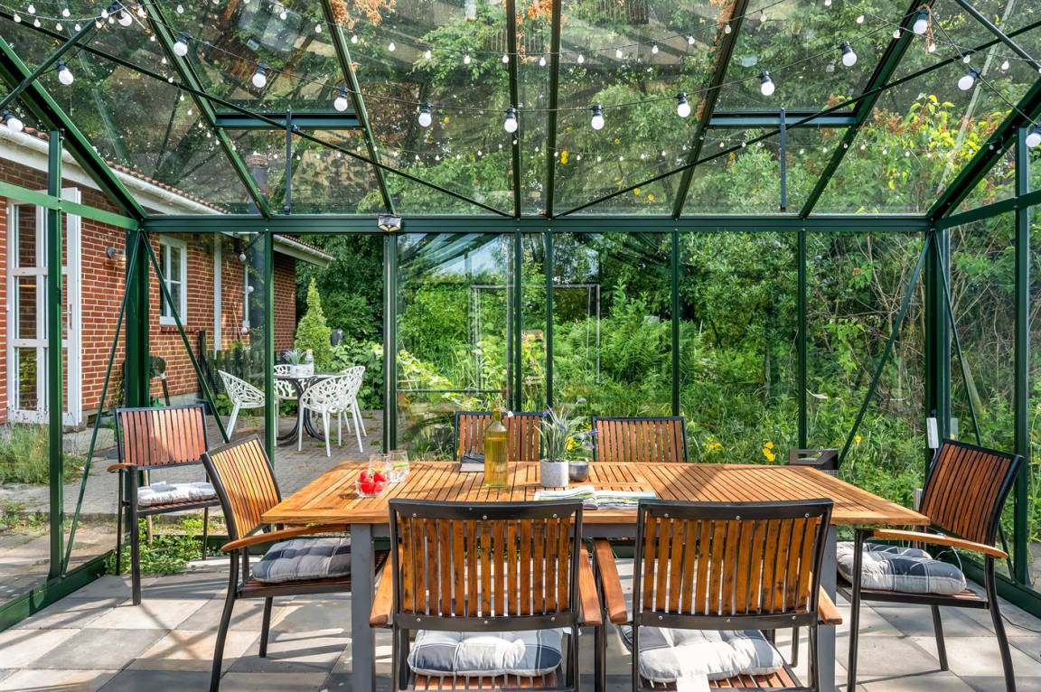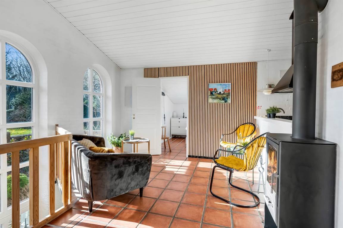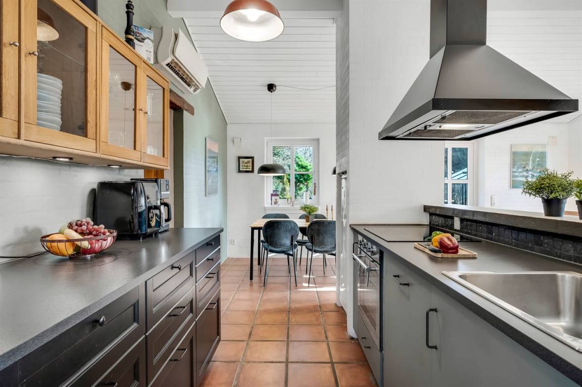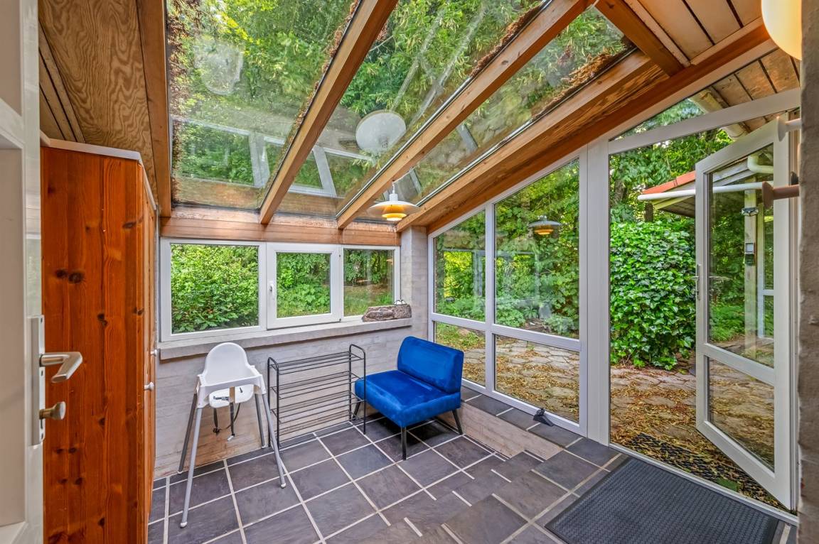 Das Haus liegt auf einem 19.000 m² großen Naturgrundstück, jedoch in unmittelbarer Nähe der kleinen Stadt Næsbjerg. Hier gibt es Ruhe und Natur pur. Man kann die Natur auf der Terrasse und in der Umgebung um das Haus herum genießen, und wenn das Wetter nicht so gut ist, kann man die Ruhe und den Urlaub im Gewächshaus genießen.