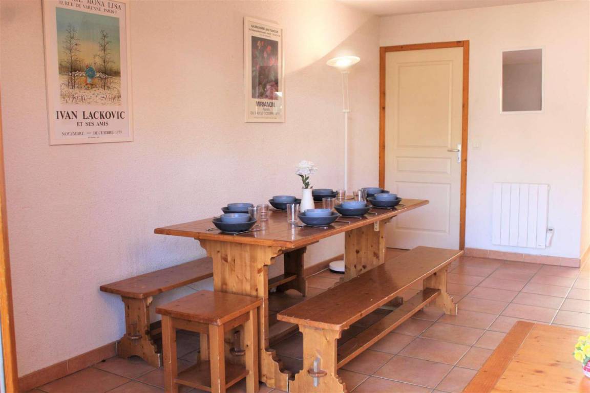 Fläche von ungefähr 72 m². Erdgeschoss. Orientierung : West. Niveau 0 : Wohnzimmer mit Ausziehschlafcouch für 2 Personen (90). Kochnische mit Kaffeemaschine, kleiner Backofen mit Mikrowellenfunktion, Toaster, Geschirrspülmaschine, kleiner Backofen, 2 elektronische Herdplatten, Kühlschrank. Terrasse. Niveau 1 : Schlafzimmer mit Doppelbett (140). Schlafzimmer mit 2 Einzelbetten (80). Badezimmer mit WC. Niveau 2 : Mansardenzimmer mit 2 Einzelbetten (80). mit 2 Einzelbetten (80). Waschräume mit WC.