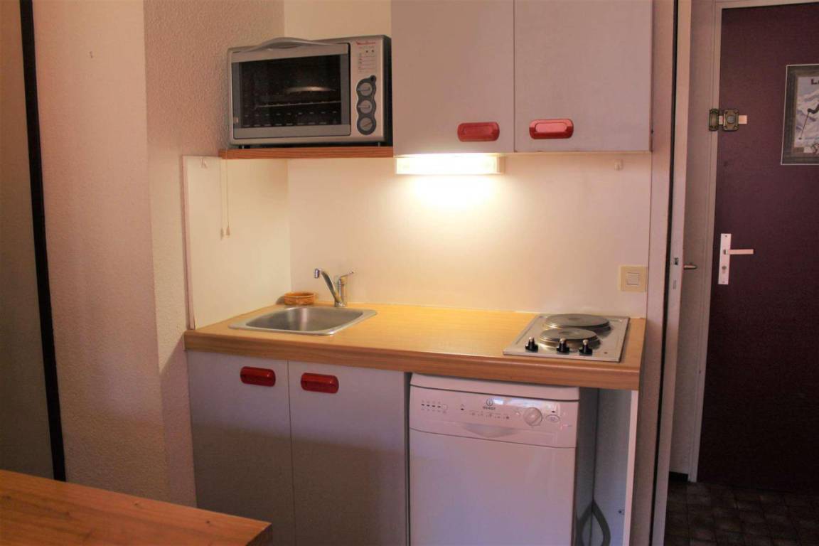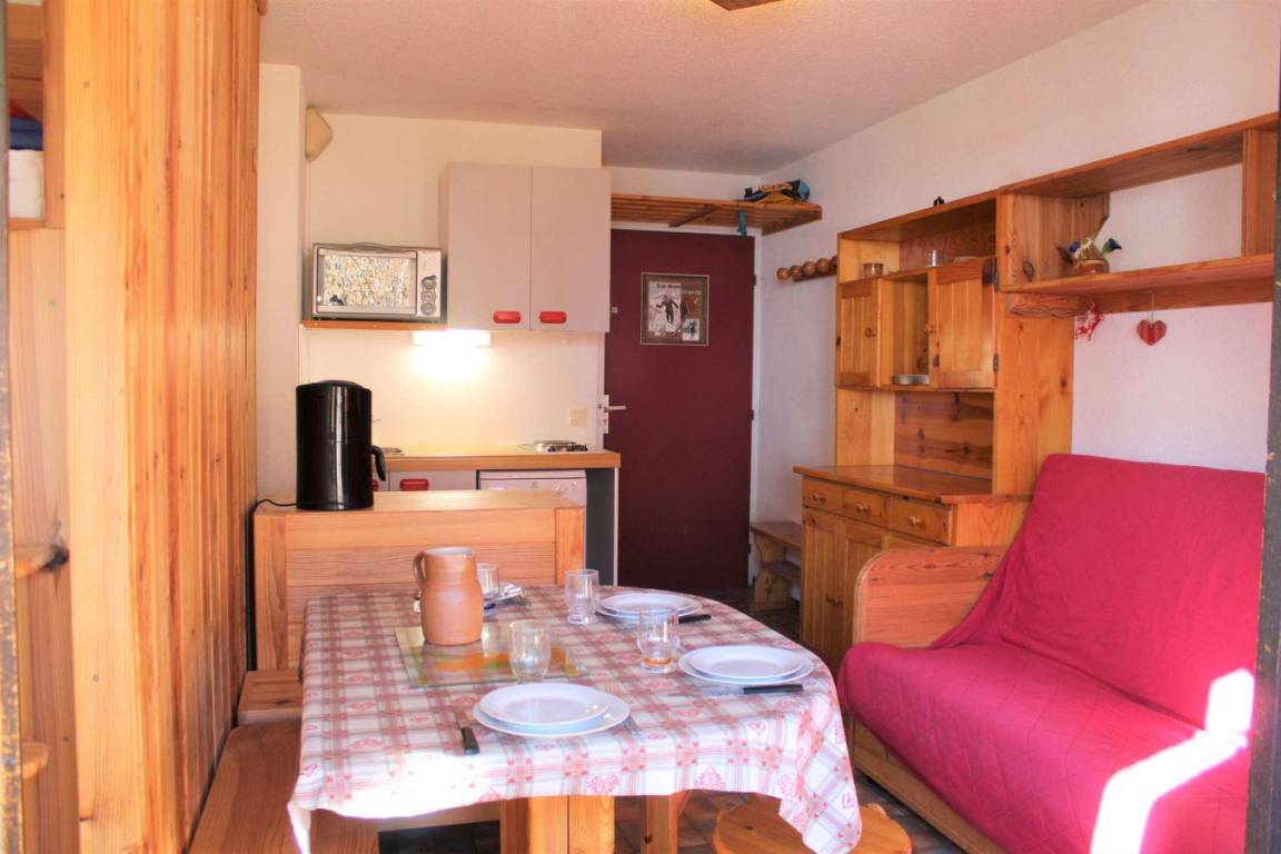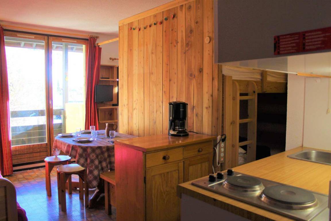 Die Residenz Les Colchiques befindet sich in Vars Sainte Marie. In diesem Weiler liegt die Residenz 3 km vom Ferienortzentrum von Vars entfernt. Die ersten Geschäfte (Bäckerei und Lebensmittelgeschäft) sind 50 m entfernt. Fläche von ungefähr 23 m². 4te Etage. Orientierung : Süd. Wohnzimmer. Schlafbereich mit 2 Stockbetten (90). Schlafbereich mit Doppelbett (140). Kochnische mit Wasserkocher, Kaffeemaschine, Backofen, Geschirrspülmaschine, 2 Herdplatten, Kühlschrank. Badezimmer mit Badewanne. separates WC. Balkon. Die oberen Betten sind nicht für Kinder unter 6 Jahren geeignet.