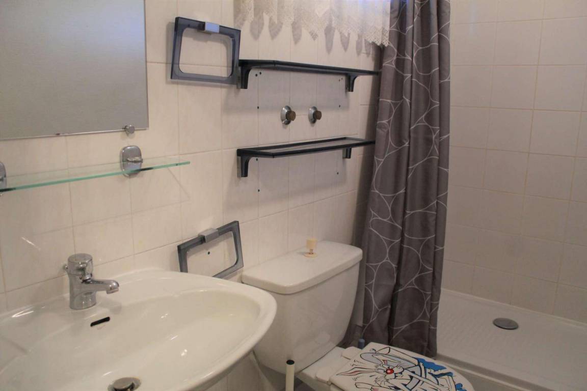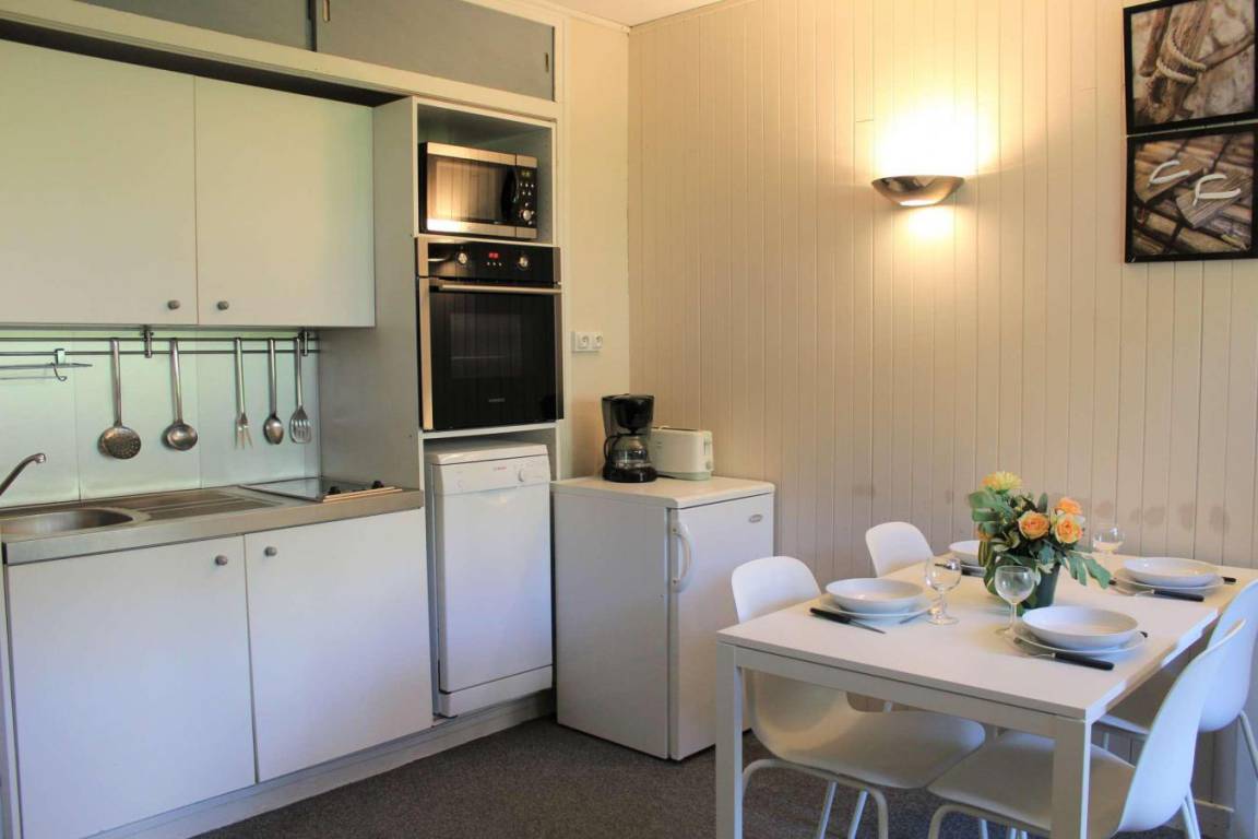 Fläche von ungefähr 23 m². 1te Etage. Orientierung : Süd. Wohnzimmer mit Klappschlafcouch (140). offener Schlafbereich mit 2 Stockbetten (90). Kochnische mit Kaffeemaschine, kleiner Backofen mit Mikrowellenfunktion, Toaster, Geschirrspülmaschine, Mikrowellenherd, 2 Glaskeramikkochfelder, Kühlschrank. Waschräume mit Dusche, Waschbecken, WC. Balkon. Die oberen Betten sind nicht für Kinder unter 6 Jahren geeignet.