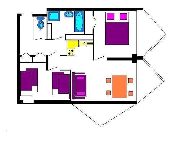Fläche von ungefähr 50 m². 7te Etage. Orientierung : Süd-West. Blick berg und Station. Wohnzimmer mit Klappschlafcouch (140). Schlafzimmer mit Doppelbett (140). Schlafzimmer mit 4 Stockbetten (90). Kochnische mit Kaffeemaschine, Backofen, kleiner Backofen mit Mikrowellenfunktion, Geschirrspülmaschine, 4 elektronische Herdplatten, Kühl-Gefrier-Kombination. Badezimmer mit Badewanne, Dusche. separates WC. Balkon. Die oberen Betten sind nicht für Kinder unter 6 Jahren geeignet.
