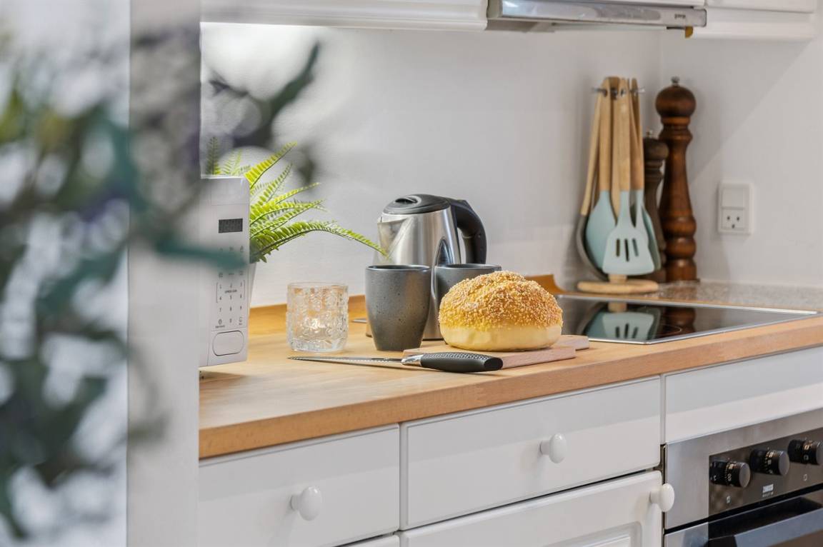 KücheDie Küche ist mit Kühlschrank ausgestattet. Außerdem gibt es 4 Induktions-Kochzonen, Umluftofen, Mikrowelle sowie Geschirrspüler.