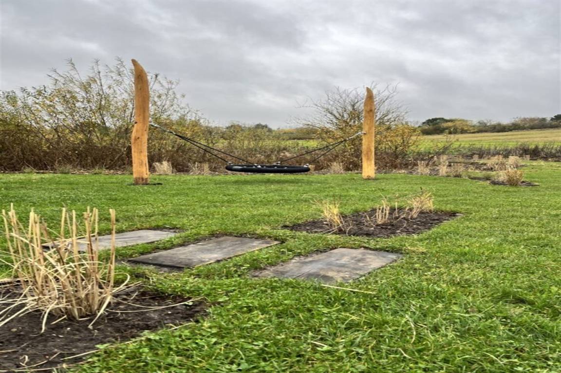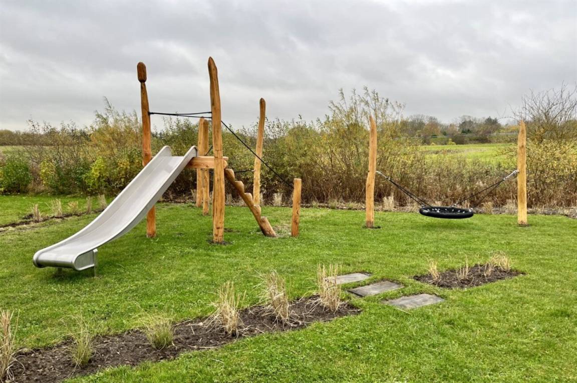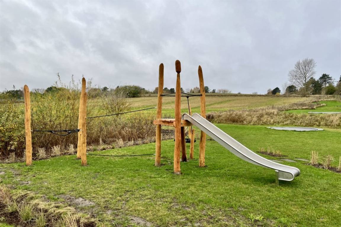 Das Ferienhaus liegt in einem guten und ruhigen Feriengebiet bei Vejby Strand auf einem großen Grundstück mit einem Naturspielplatz für die Kinder – hier findet ihr unter anderem eine Vogelnestschaukel, eine Rutsche, ein Kletternetz und ein Trampolin, die zu stundenlangem Spaß im Freien einladen.