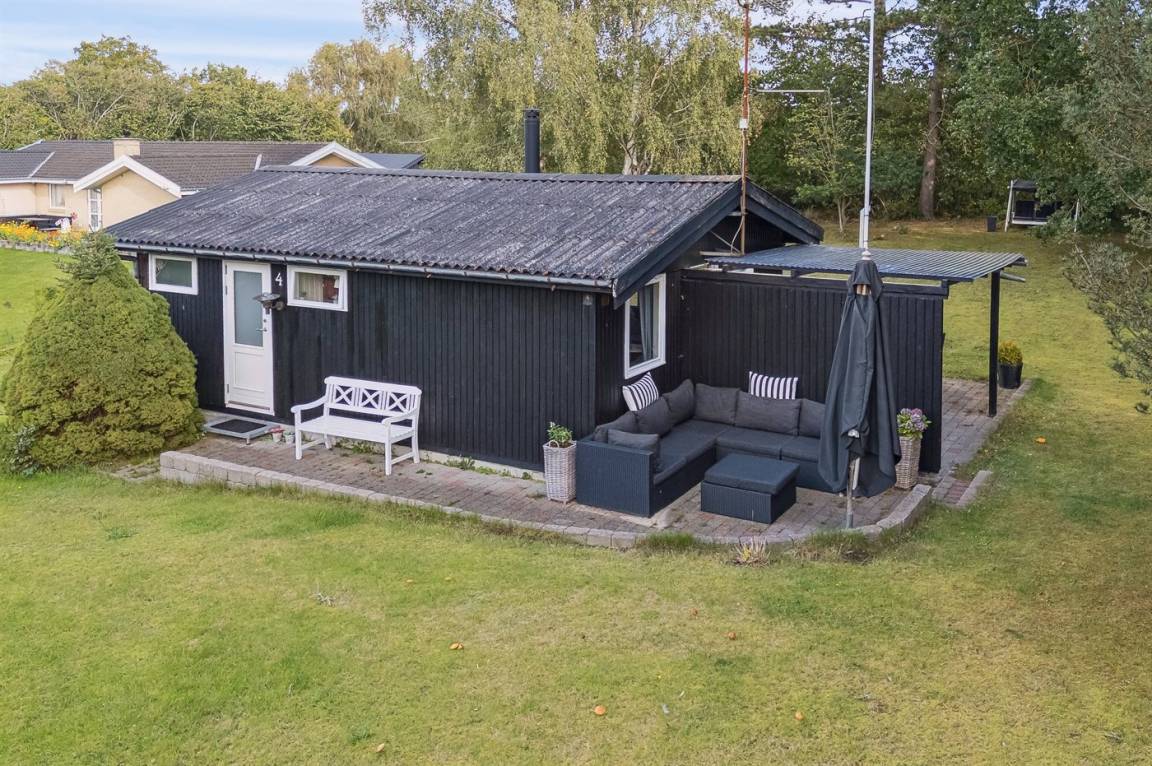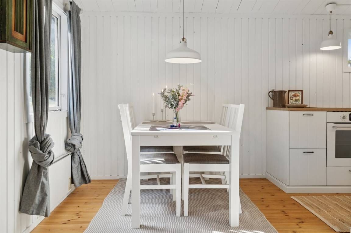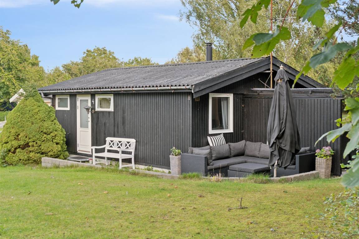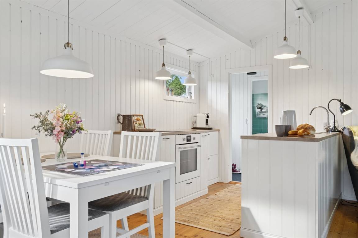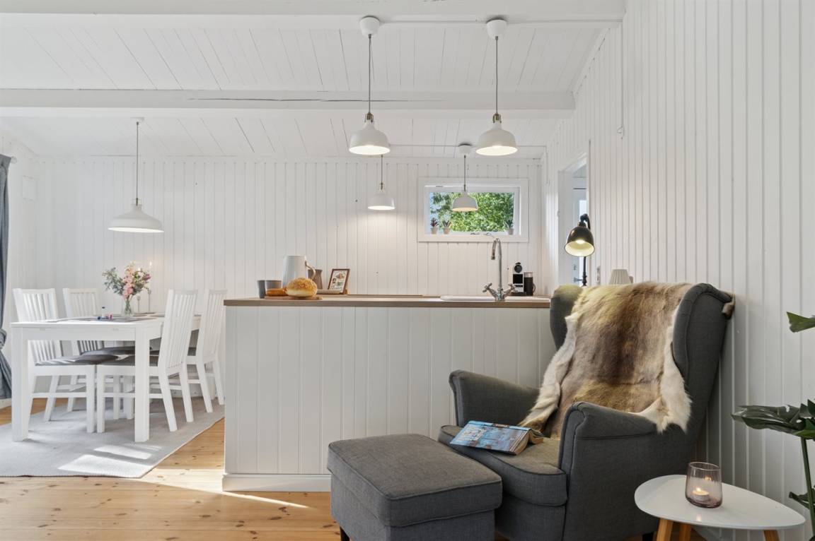 Das Haus ist mit einem hellen Wohnzimmer, das in offener Verbindung zur Küche liegt, zwei Schlafzimmern und einem Badezimmer mit Dusche eingerichtet. Vom Haus aus hast du direkten Zugang zu einer überdachten Terrasse und dem Garten.