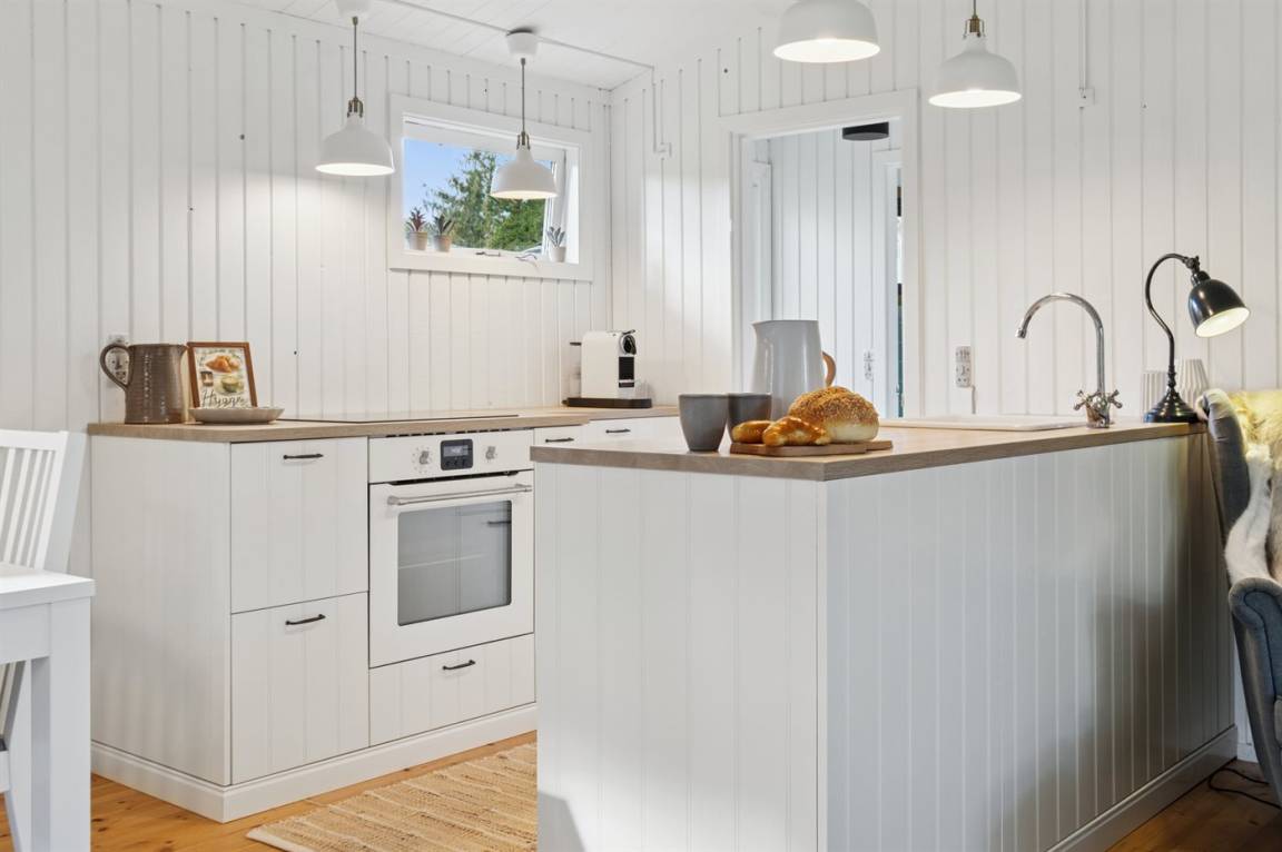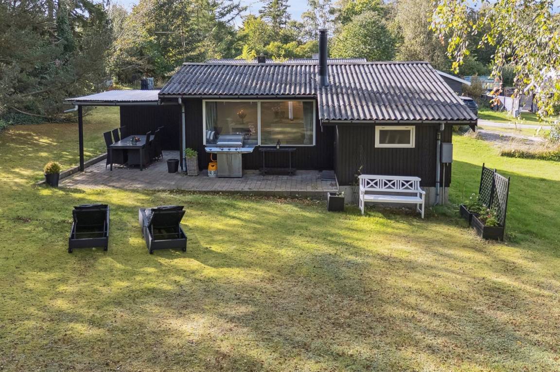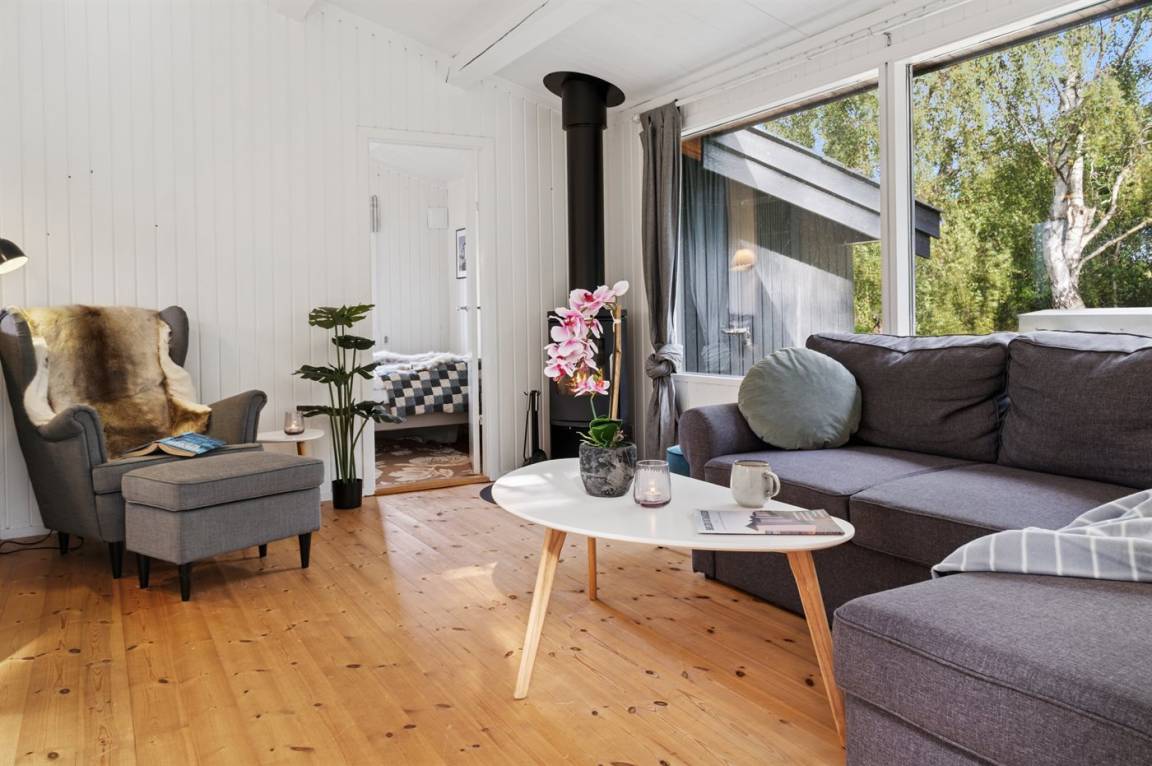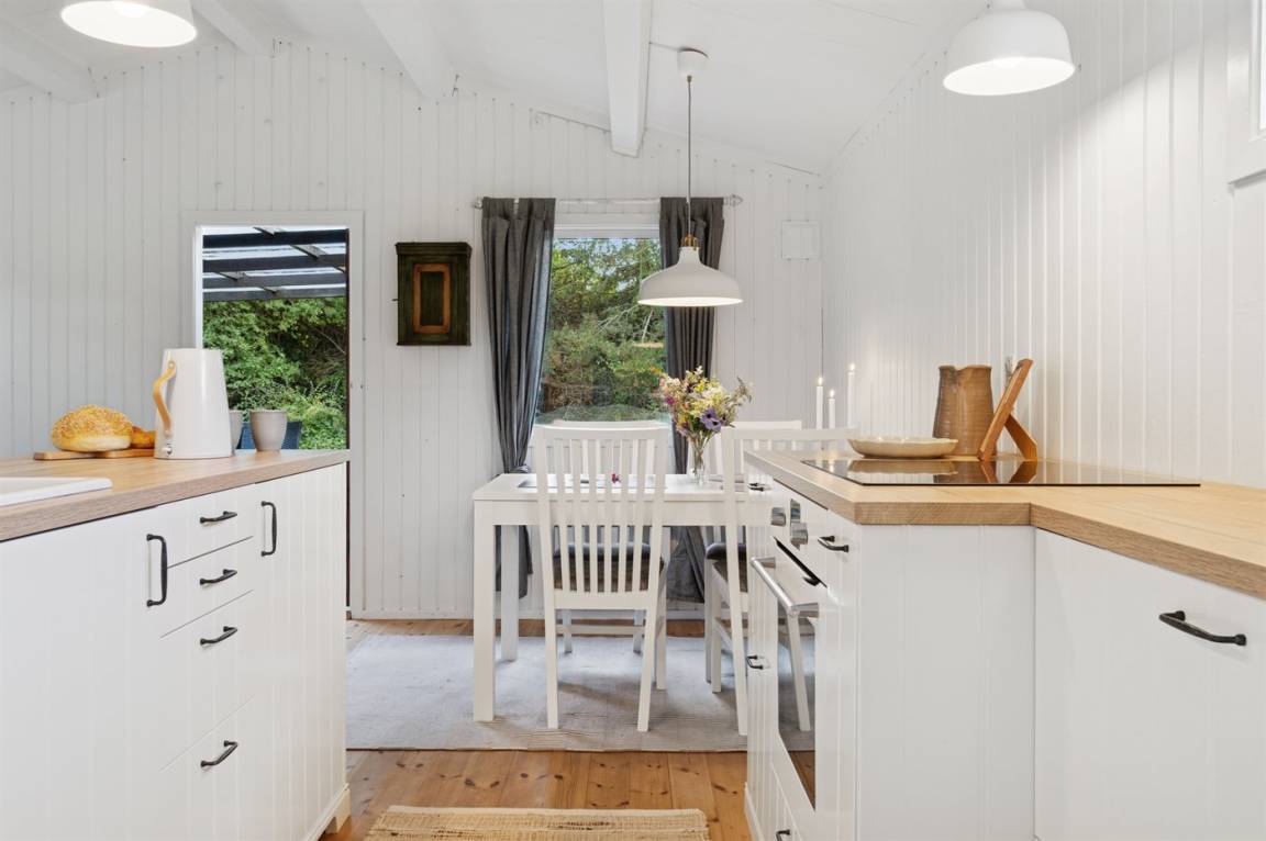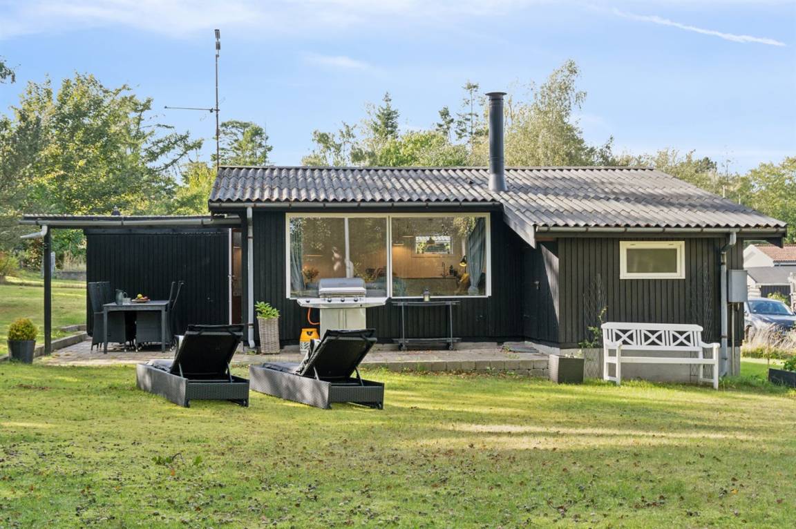Das Haus ist mit einem hellen Wohnzimmer, das in offener Verbindung zur Küche liegt, zwei Schlafzimmern und einem Badezimmer mit Dusche eingerichtet. Vom Haus aus hast du direkten Zugang zu einer überdachten Terrasse und dem Garten.