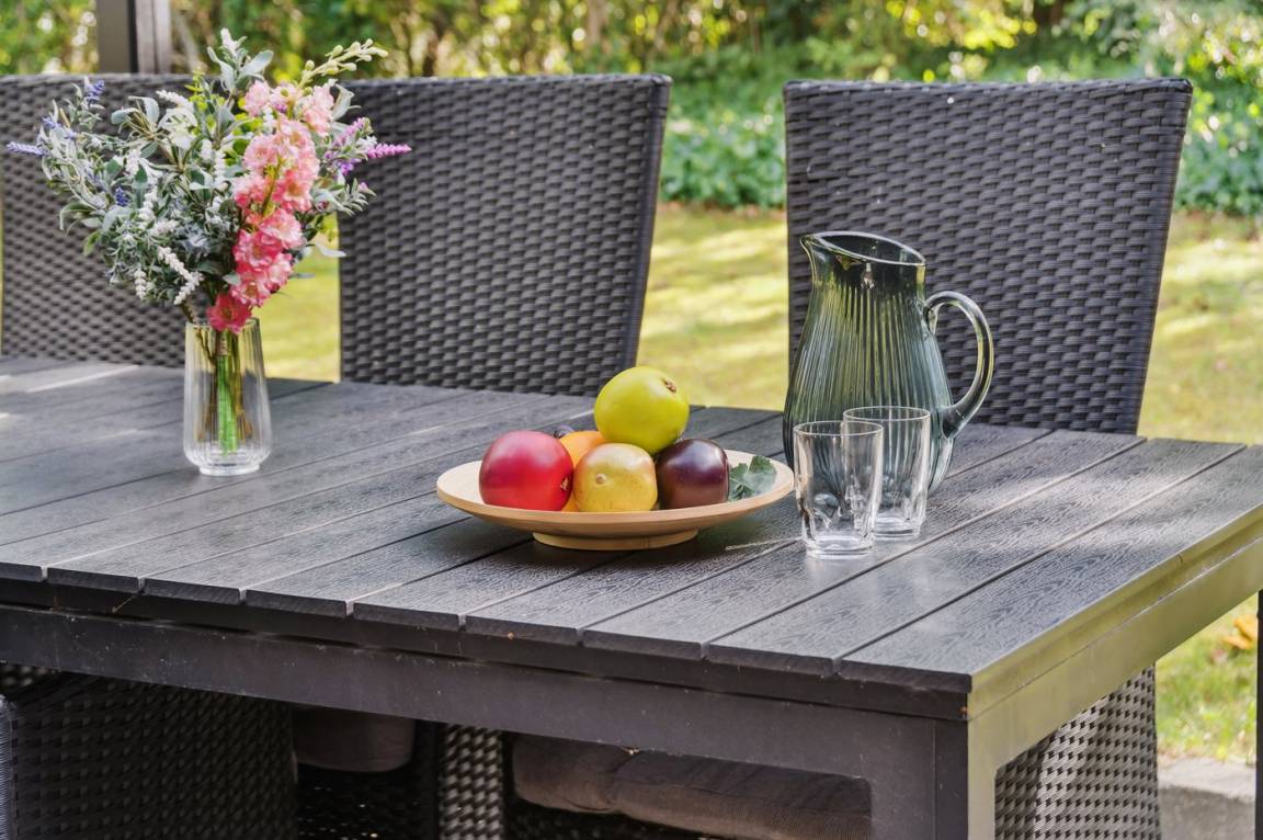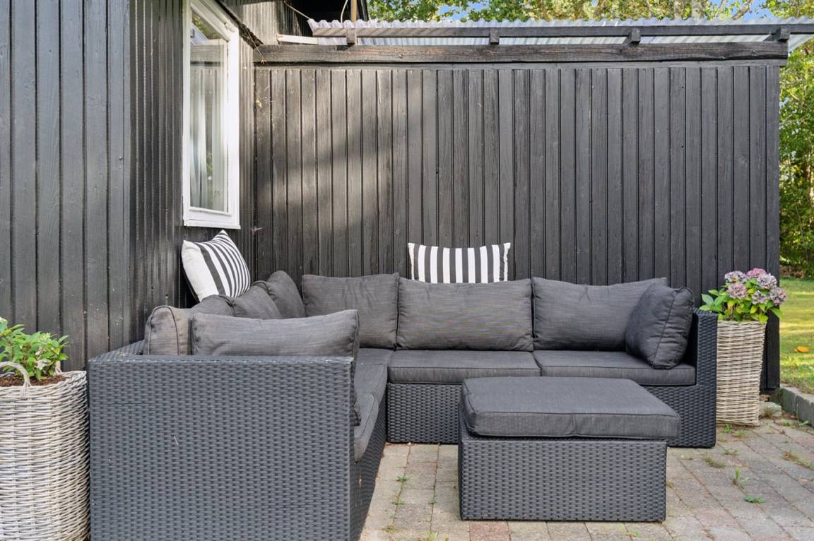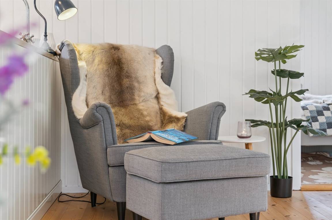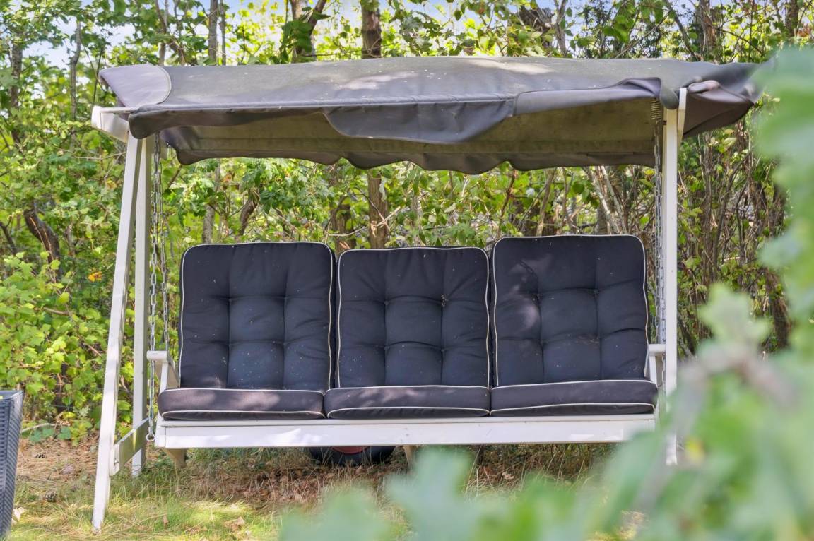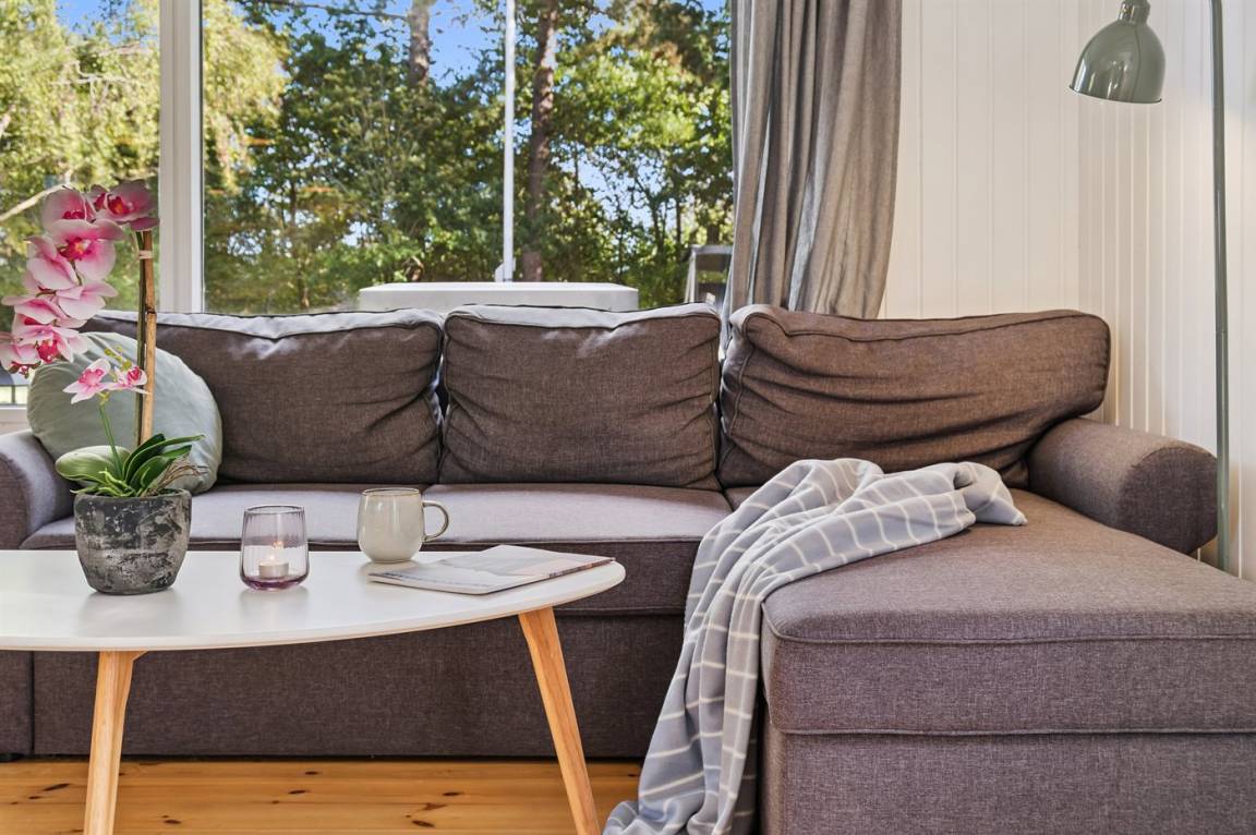 Das Haus ist mit einem hellen Wohnzimmer, das in offener Verbindung zur Küche liegt, zwei Schlafzimmern und einem Badezimmer mit Dusche eingerichtet. Vom Haus aus hast du direkten Zugang zu einer überdachten Terrasse und dem Garten.