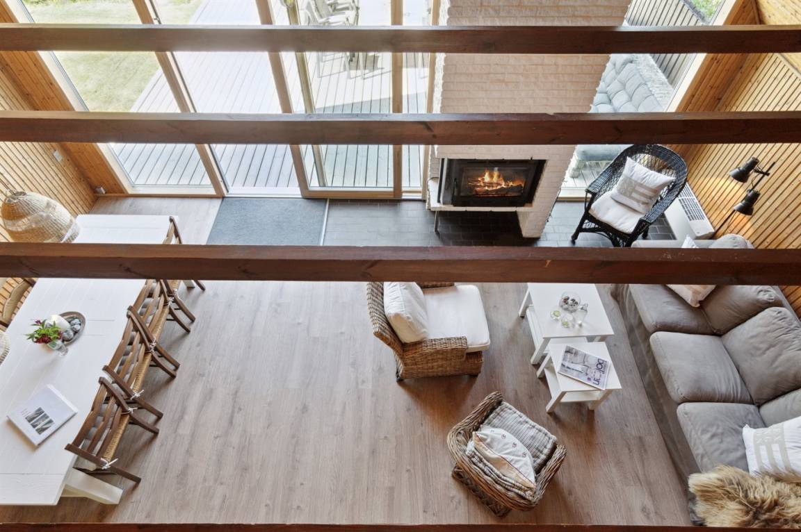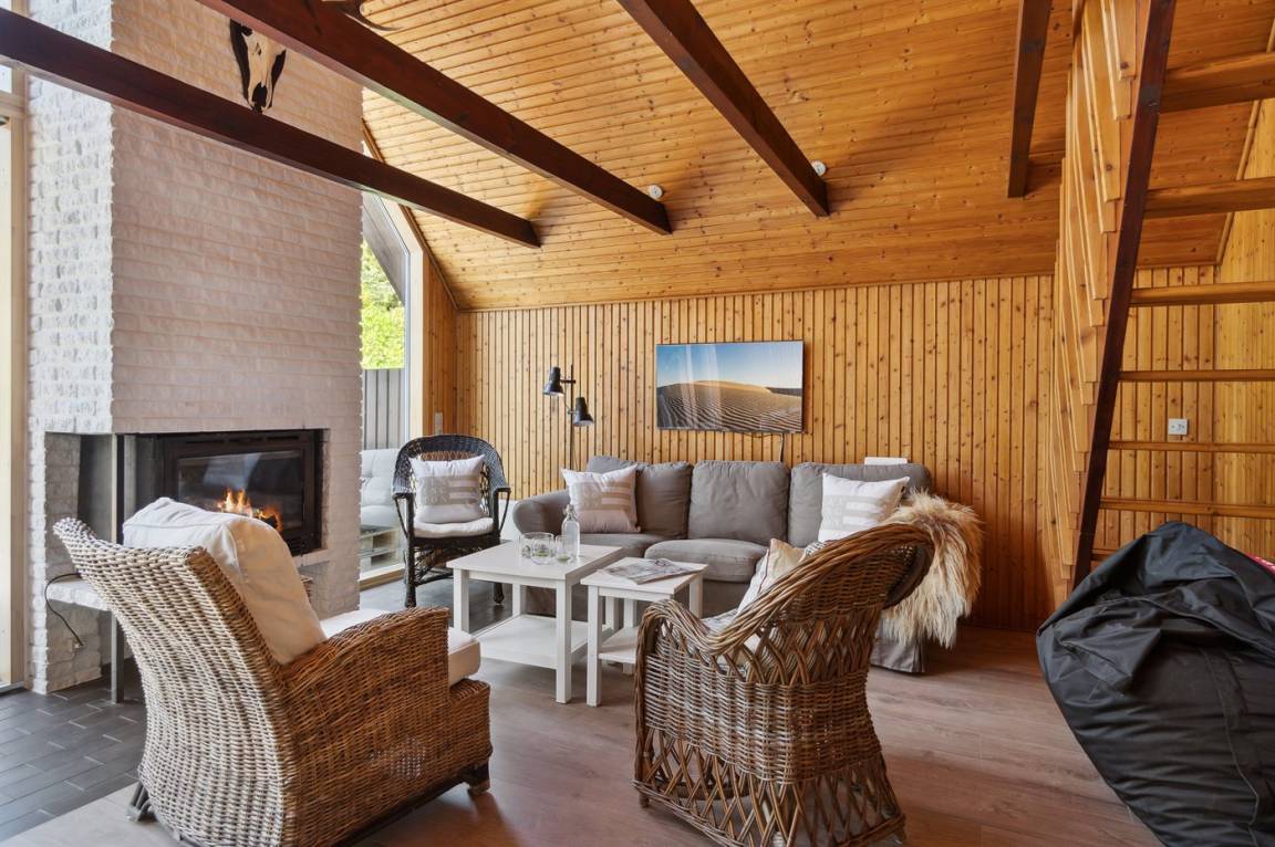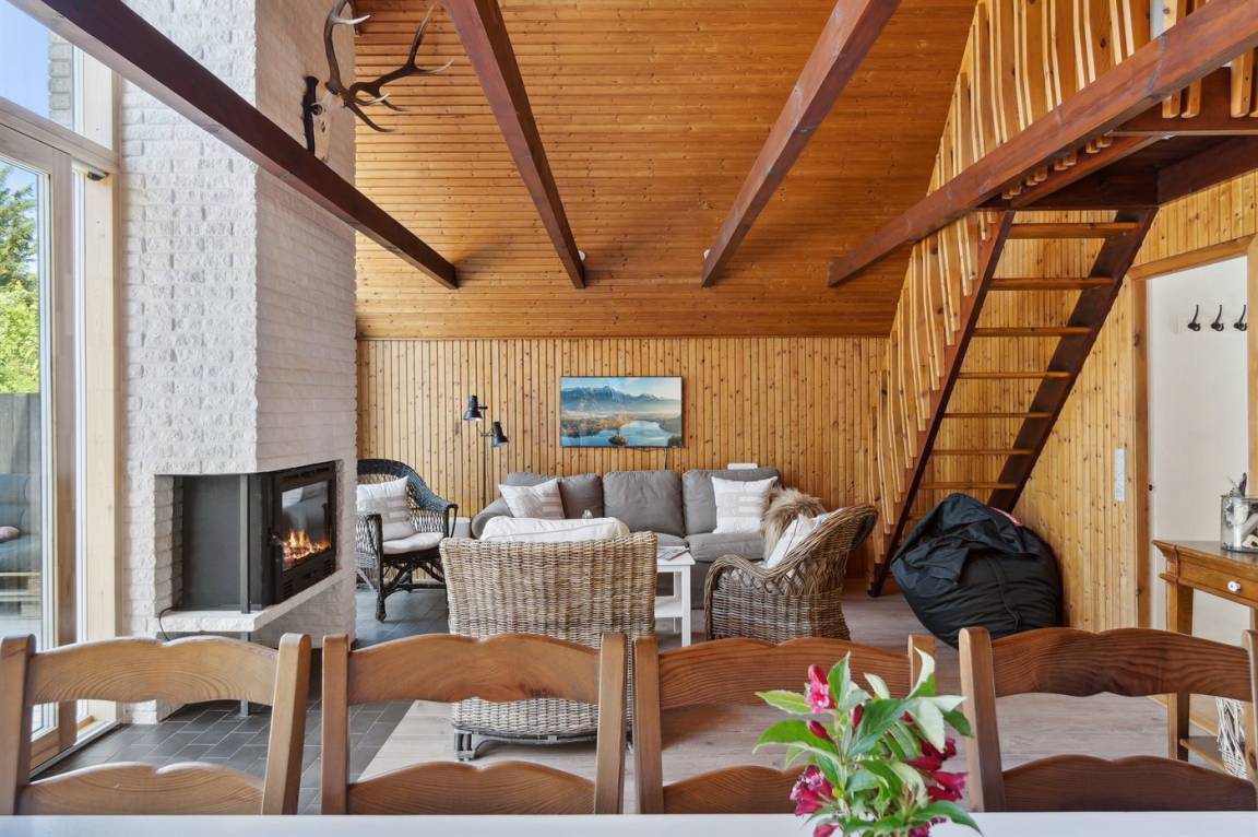 Deckenkonstruktion mit Kronleuchter sowie gemütliche Möbel für die ganze Familie. Zudem gibt es einen Kamin. Für die Kleinen steht ein Trip-Trap-Kinderstuhl bereit. Zur Küchenausstattung gehören 4 keramische Kochplatten, ein Umluftofen, eine Mikrowelle und eine Geschirrspülmaschine.