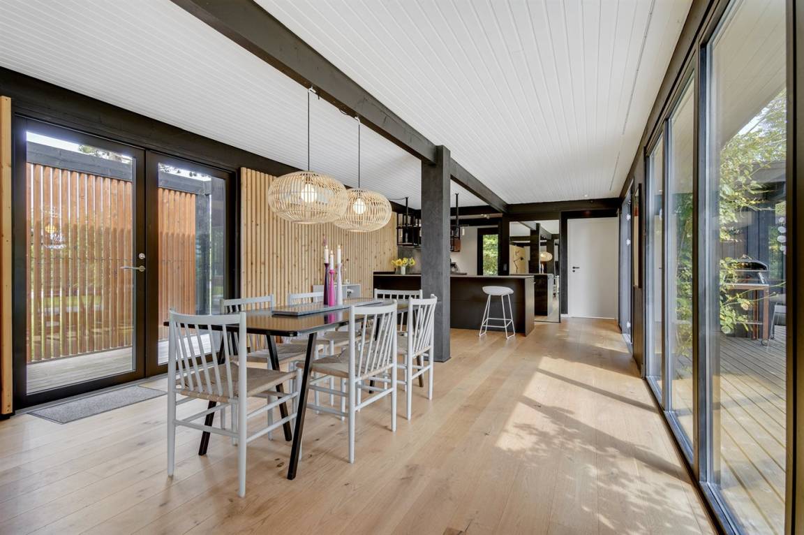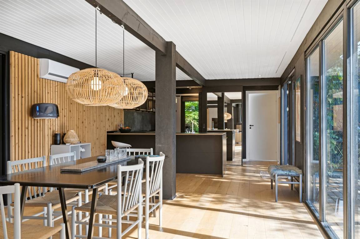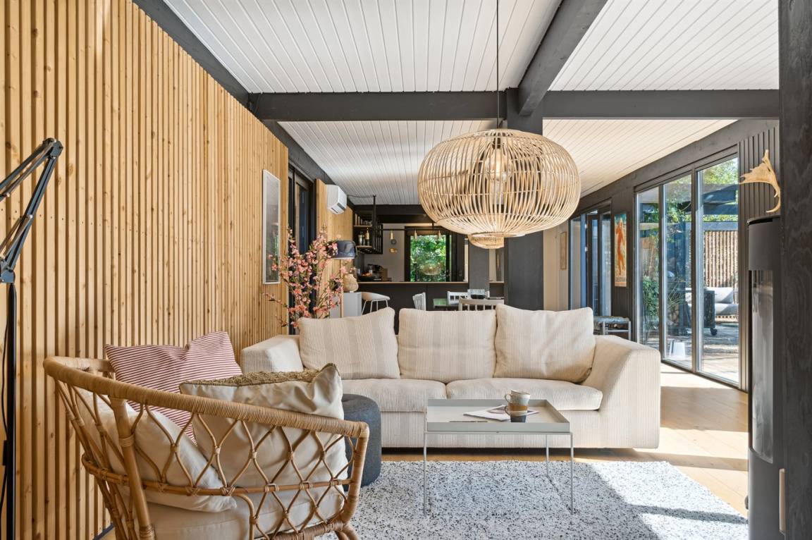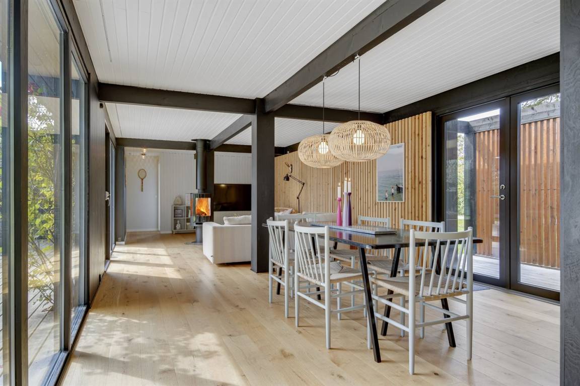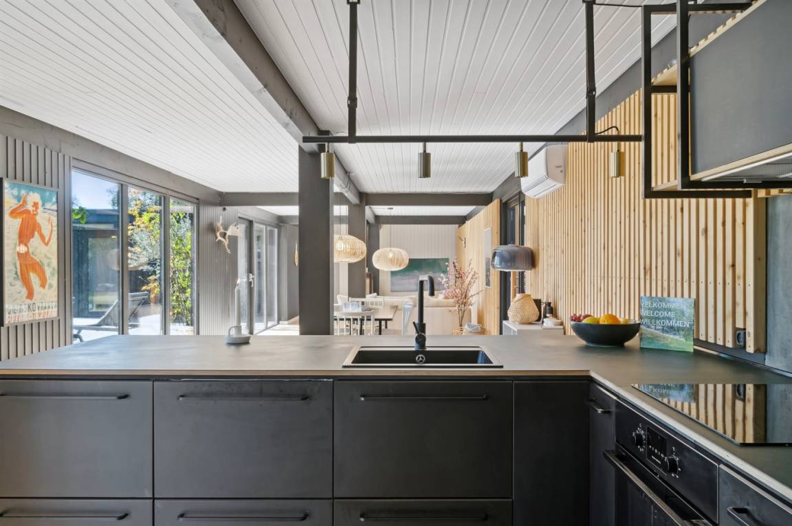Das Ferienhaus ist komplett mit hochwertigen Materialien renoviert, präsentiert sich modern und mit viel Tageslicht durch die großen Fensterfronten. Küche, Essbereich und Wohnzimmer sind offen verbunden – zusammen mit der 130 m² großen Holzterrasse bildet es den natürlichen Mittelpunkt für gemütliches Beisammensein mit Familie und Freunden.