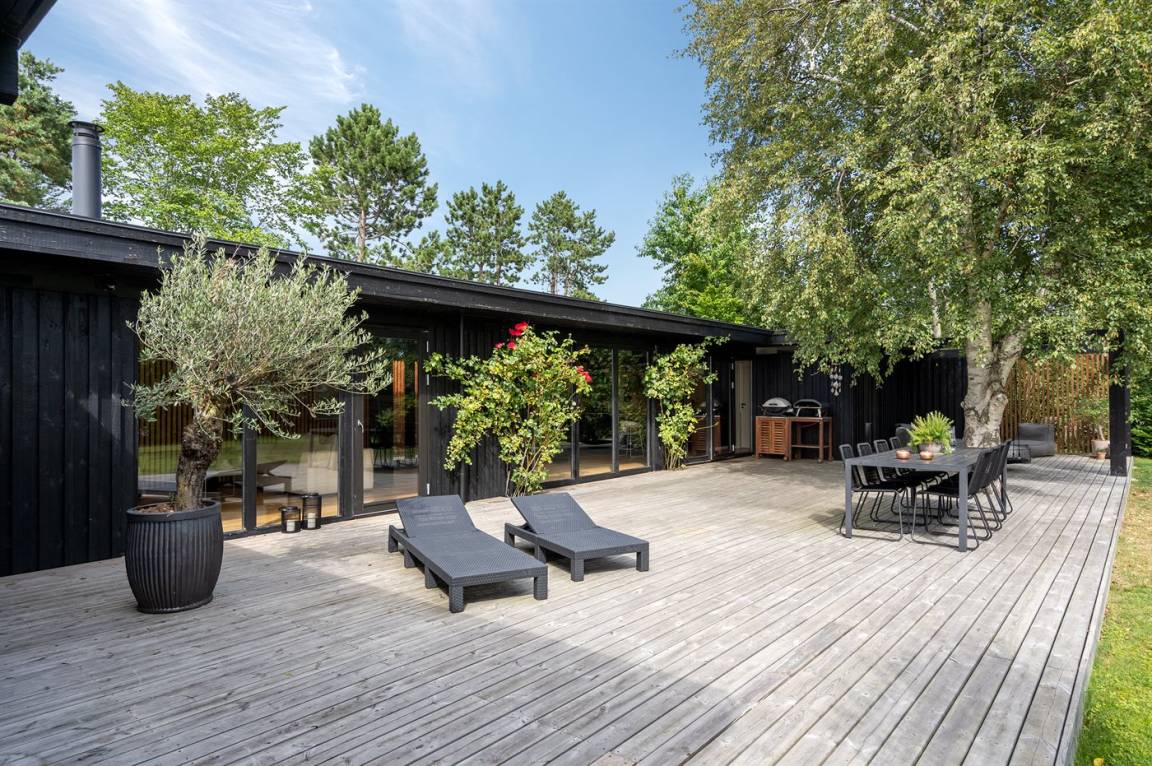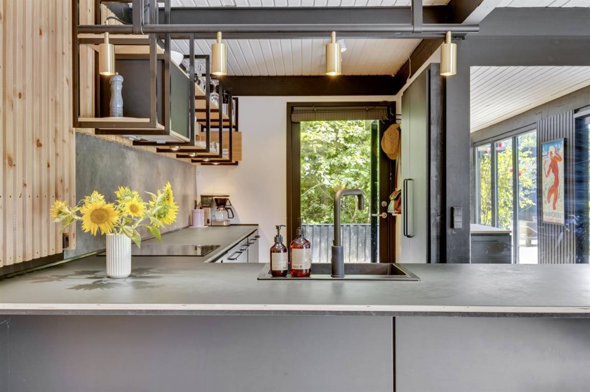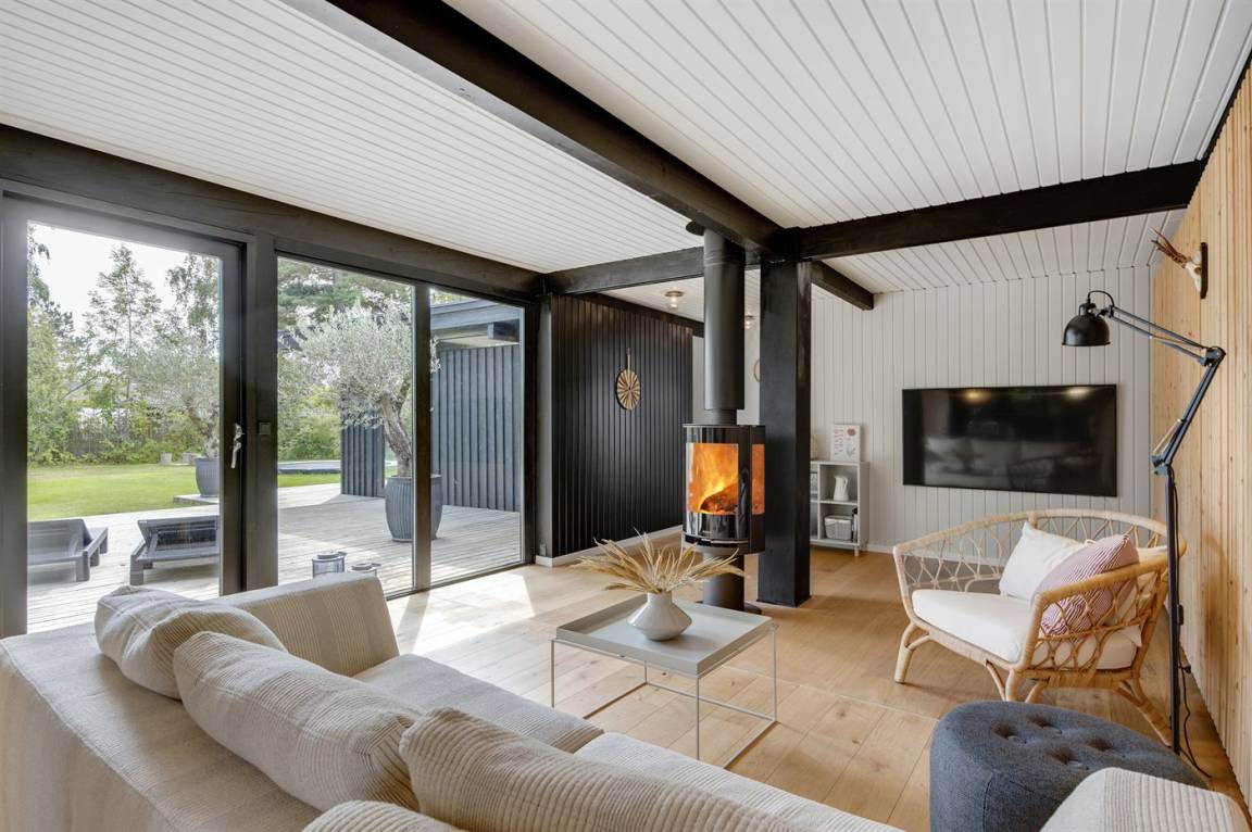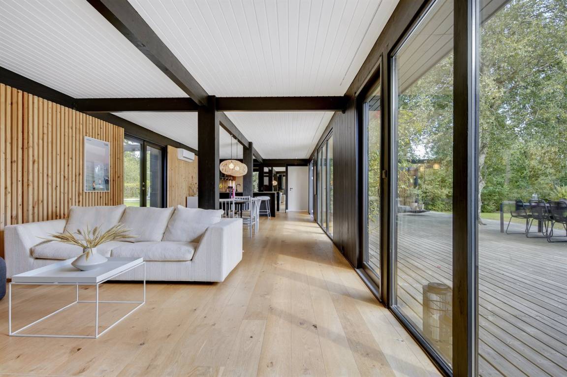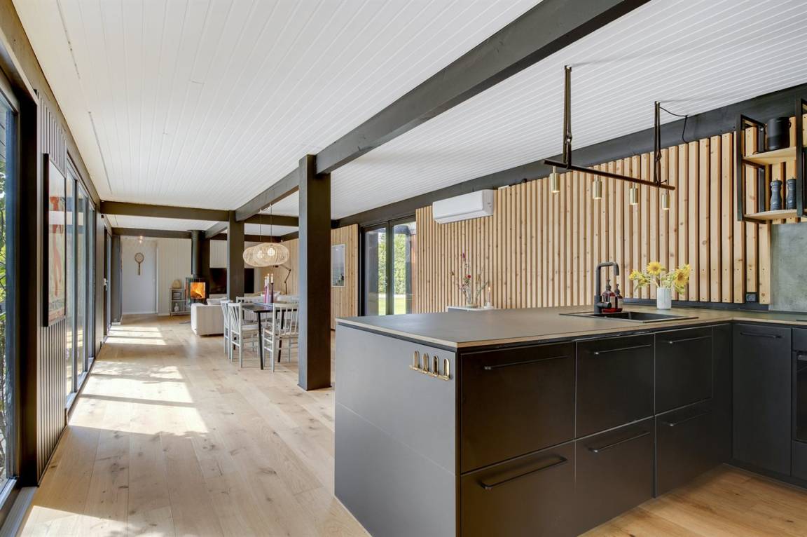 Das Ferienhaus ist komplett mit hochwertigen Materialien renoviert, präsentiert sich modern und mit viel Tageslicht durch die großen Fensterfronten. Küche, Essbereich und Wohnzimmer sind offen verbunden – zusammen mit der 130 m² großen Holzterrasse bildet es den natürlichen Mittelpunkt für gemütliches Beisammensein mit Familie und Freunden.