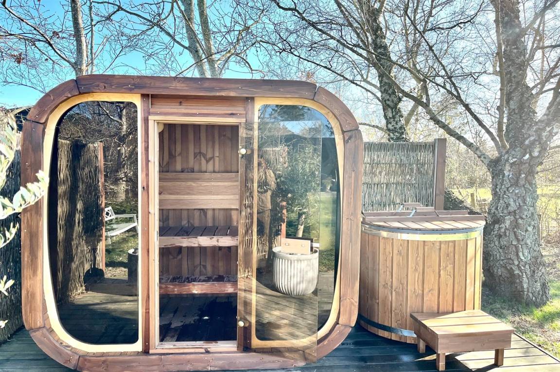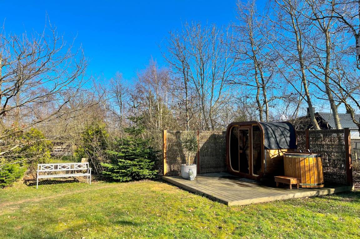 Wellnessbereich im Garten – eine Außensauna und ein Cold water tub – für Entspannung und Genuss. Im Garten gibt es eine Minigolfbahn. Es handelt sich um eine Bahn mit mehreren lustigen Hindernissen, die man nach Belieben wechseln kann.