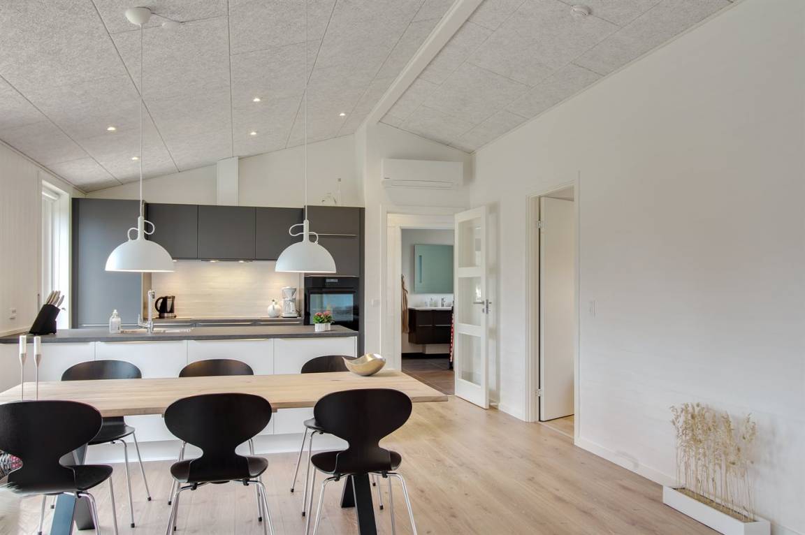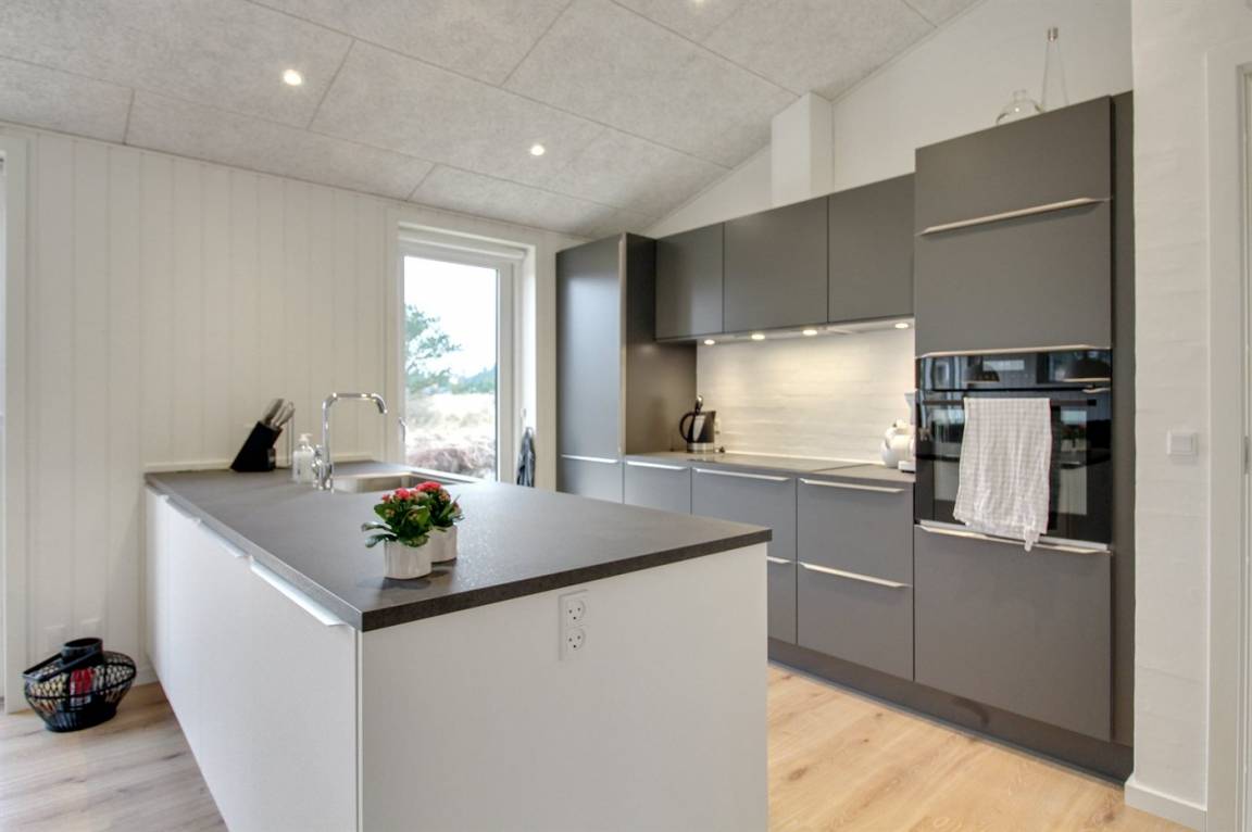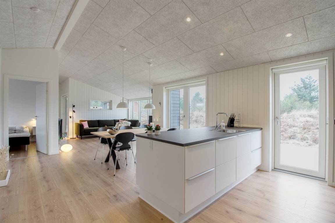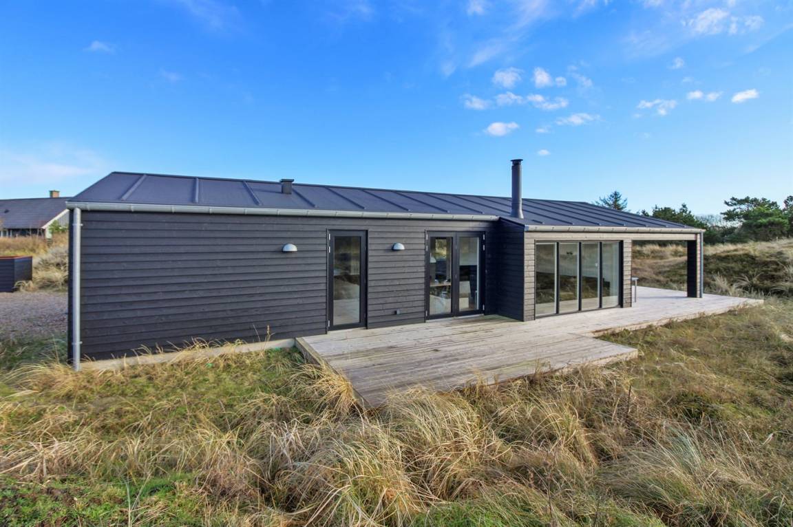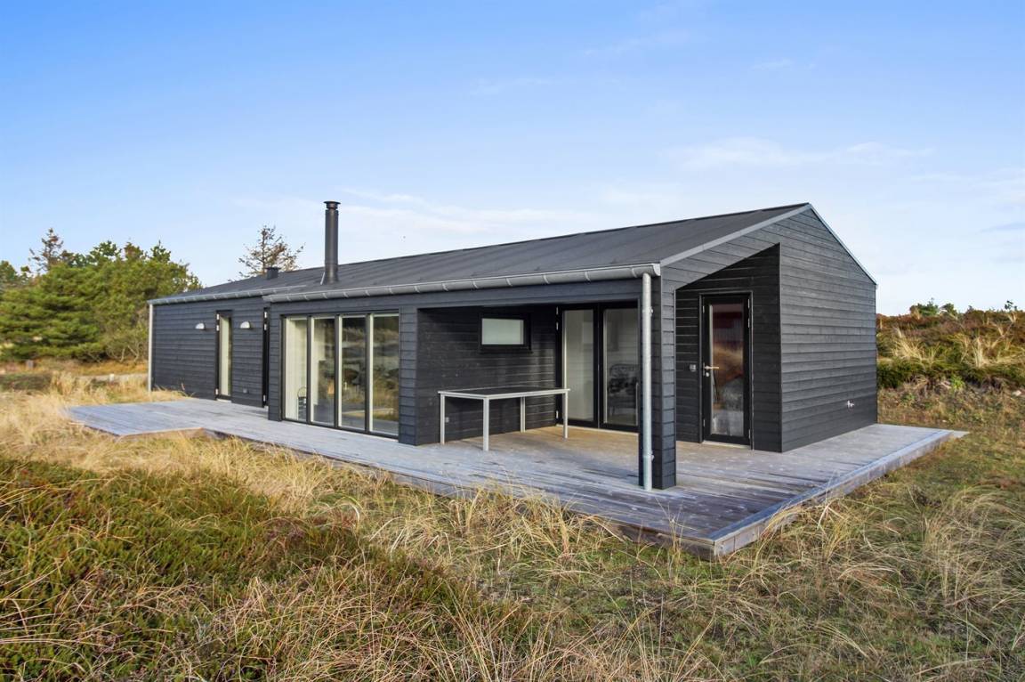 Ein schönes neues Ferienhaus aus Qualitätsmaterialien gebaut und mit einer geräumigen Einrichtung. Es stehen u. a. ein mit der Küche kombiniertes Wohnzimmer, 2 voll ausgestattete Badezimmer und eine schöne große Terrasse, zu der von mehreren Räumen des Hauses Zugang besteht, zur Verfügung. Außerdem ist eine Sauna vorhanden – hier erfolgt der Zugang von der überdachten Terrasse aus. Alles in allem ein schönes Ferienhaus für einen enspannenden Urlaub – nicht weit vom herrlichen Badestrand entfernt.