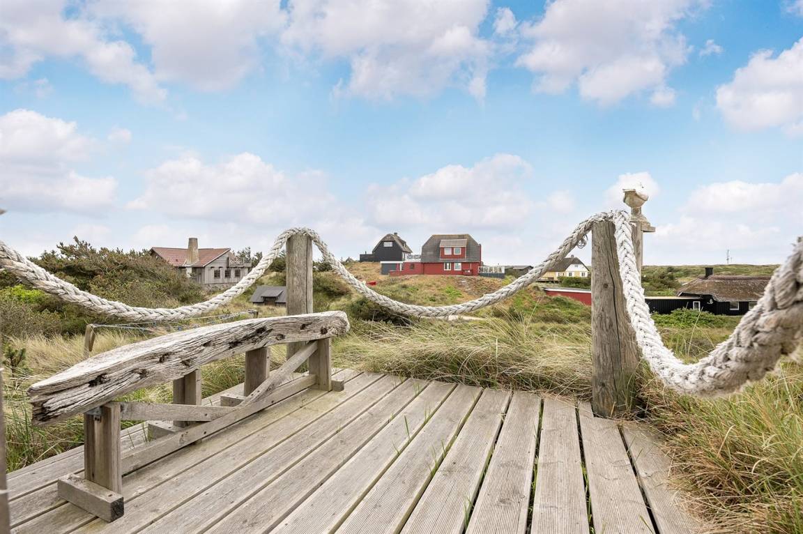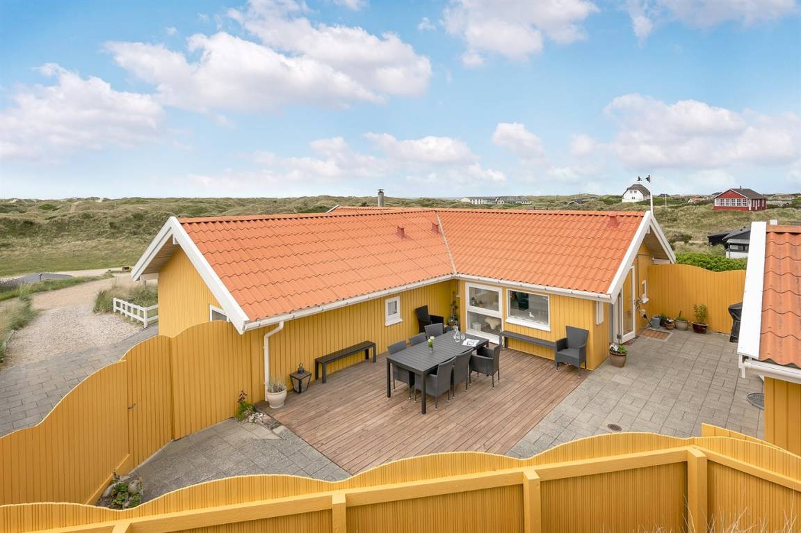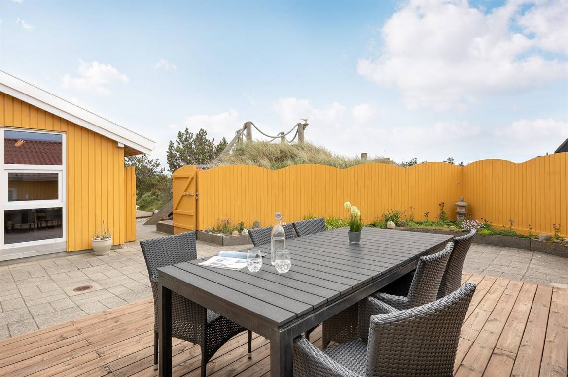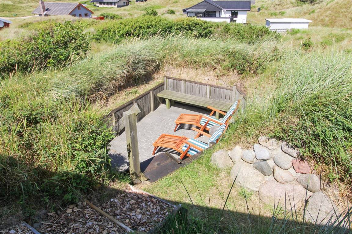 Draußen erwartet dich eine 128 m² große, komplett geschlossene Terrasse/Innenhof mit Gartenmöbeln und einem Gasgrill. Zusätzlich gibt es eine schöne 30 m² große Sonnenterrasse hinter dem Haus mit Gartenmöbeln und Liegestühlen. Vor dem Haus befindet sich eine besonders schöne Abendterrasse mit Tisch und Stühlen, von der aus du den Sonnenuntergang über den Dünen genießen kannst. Auf der linken Seite des Hauses gibt es eine weitere windgeschützte Sitzecke, die in die Dünen eingebettet ist – perfekt, um die Ruhe und Natur zu genießen. Auf einem Hügel des Grundstücks gibt es zudem einen Aussichtspunkt mit einem fantastischen Blick über die Dünen und hin zum Meer.