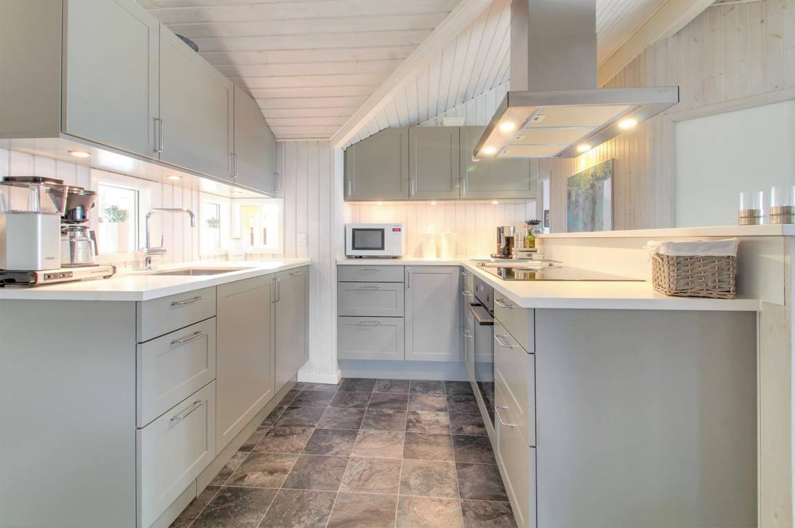 Die Küche ist mit einem Kühlschrank, einem Herd mit Cerankochfeld, einer Mikrowelle und einer Geschirrspülmaschine ausgestattet.