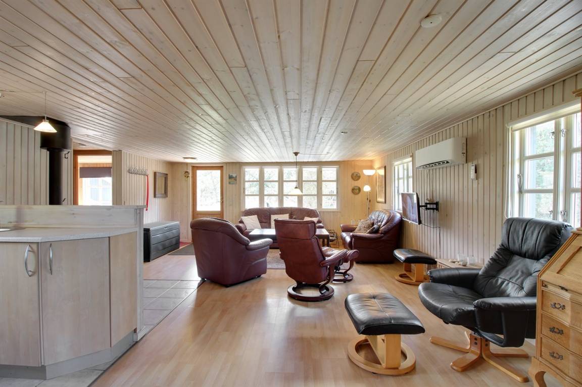 Ferienhaus mit guter Ausstattung, auf ungestörtem Naturgrundstück, umgeben von Bäumen an einer ruhigen Straße. Wohnzimmer mit hellem Buchen-Laminatboden und Holzofen.