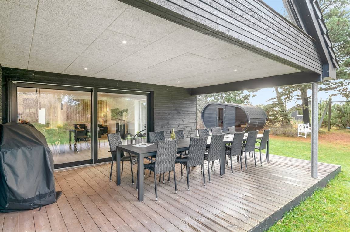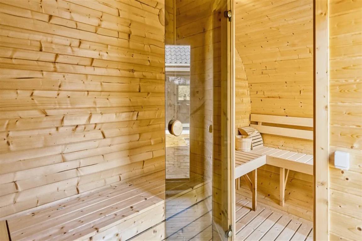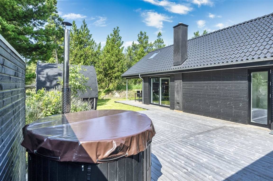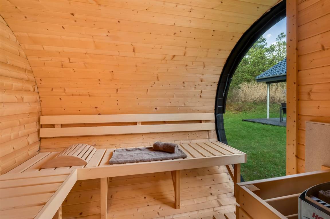 Draußen erwartet euch eine große, teilweise überdachte Holzterrasse mit Windschutz, Sonne und viel Platz zum Entspannen. Hier findet ihr einen Außen-Whirlpool, eine Saunatonne und eine Außendusche – ideal für die Entspannung nach einem Tag am Strand oder in der Umgebung. Innen findet ihr außerdem einen Whirlpool für zwei Personen, perfekt für ruhige Momente.