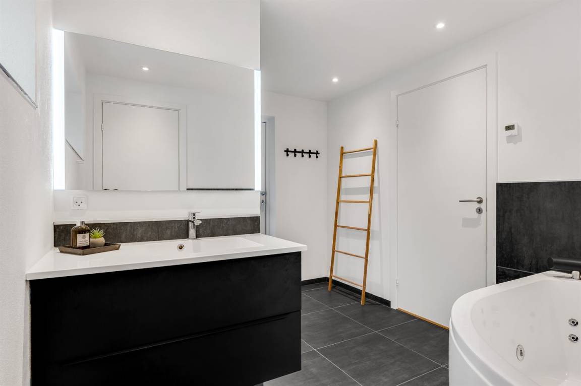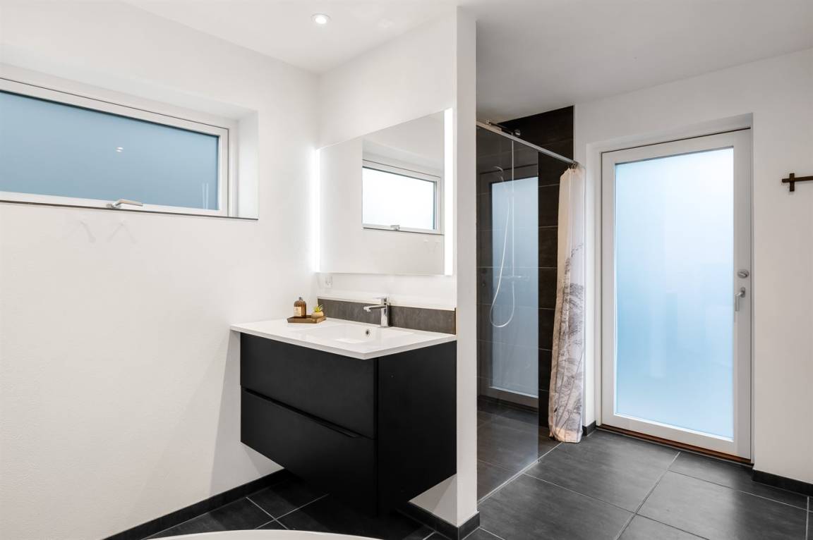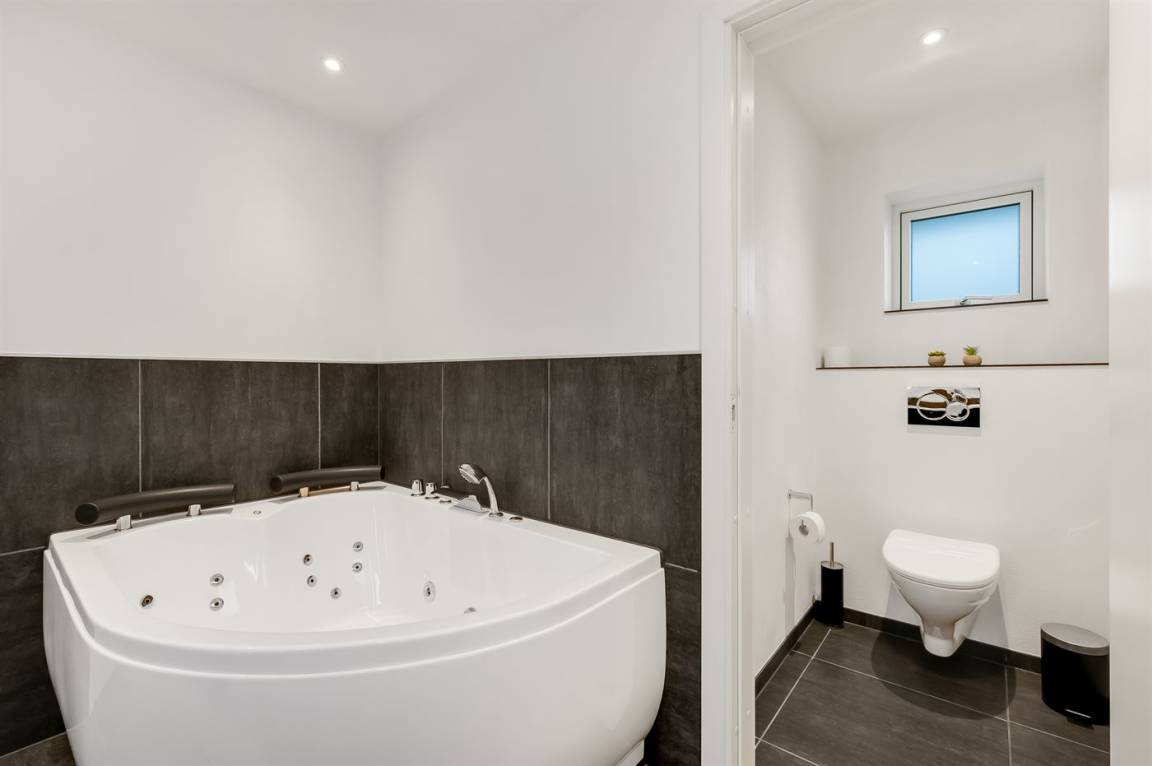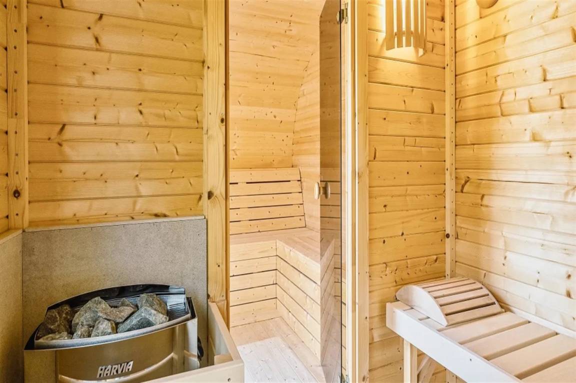 Draußen erwartet euch eine große, teilweise überdachte Holzterrasse mit Windschutz, Sonne und viel Platz zum Entspannen. Hier findet ihr einen Außen-Whirlpool, eine Saunatonne und eine Außendusche – ideal für die Entspannung nach einem Tag am Strand oder in der Umgebung. Innen findet ihr außerdem einen Whirlpool für zwei Personen, perfekt für ruhige Momente.