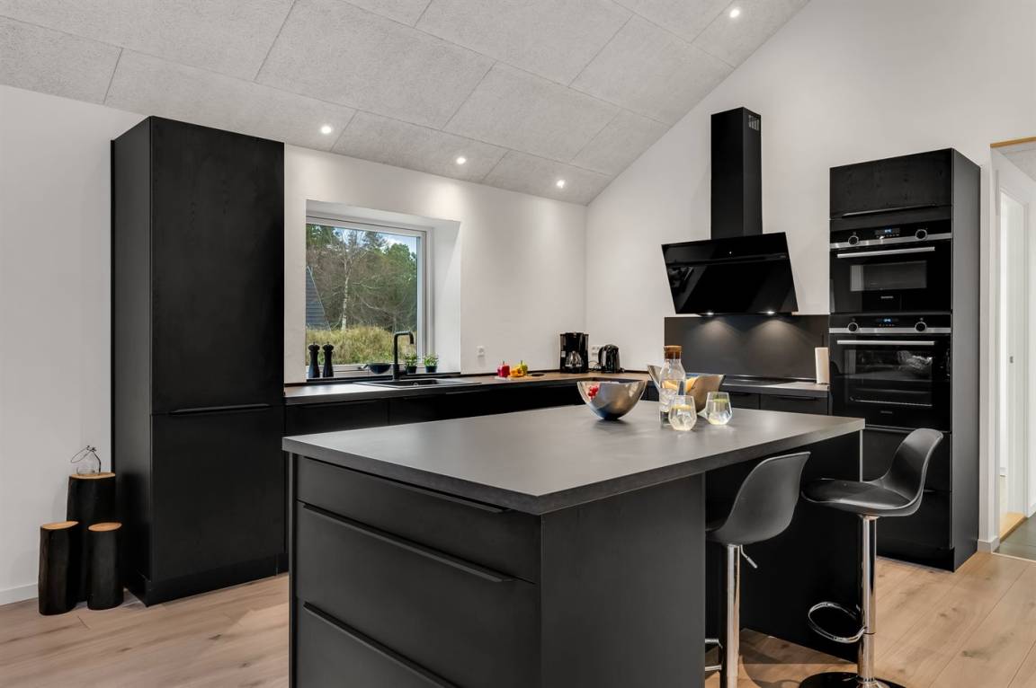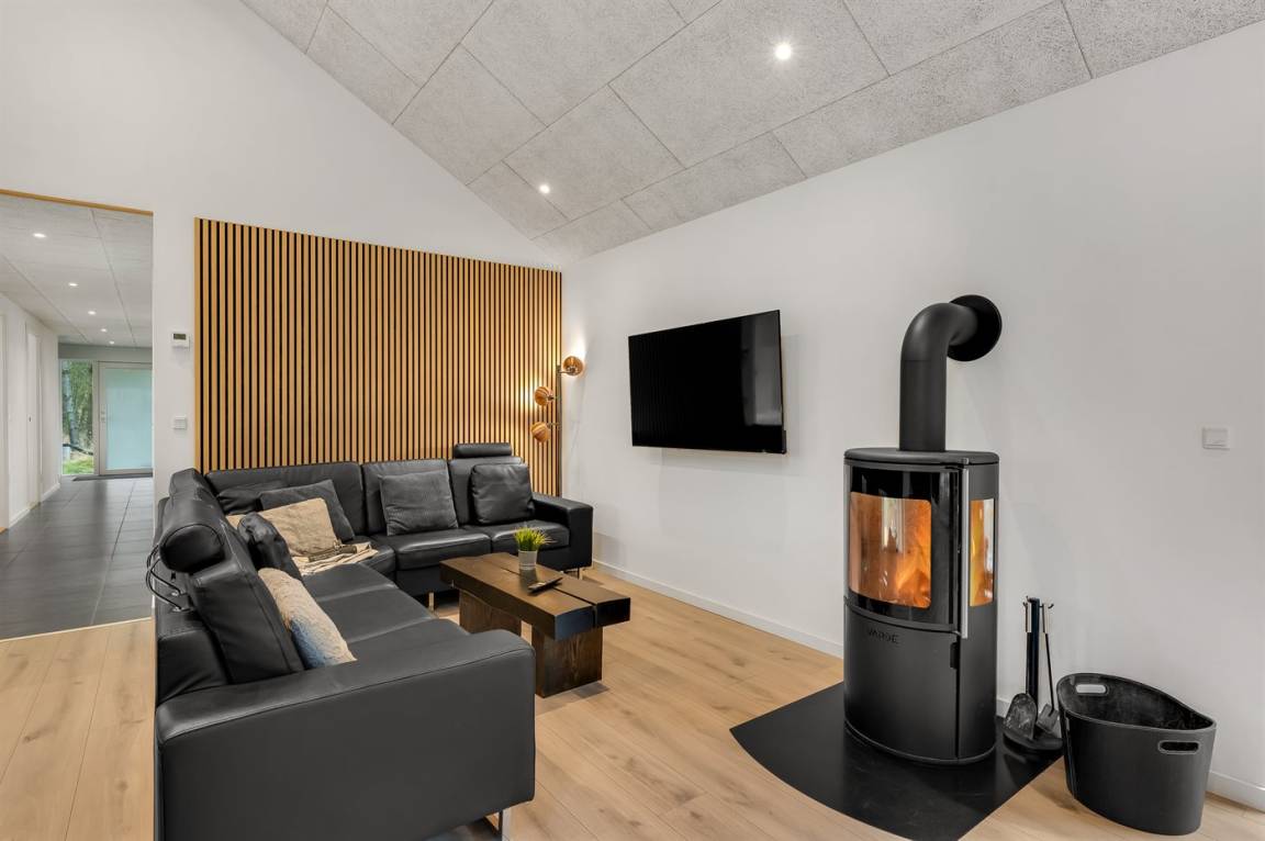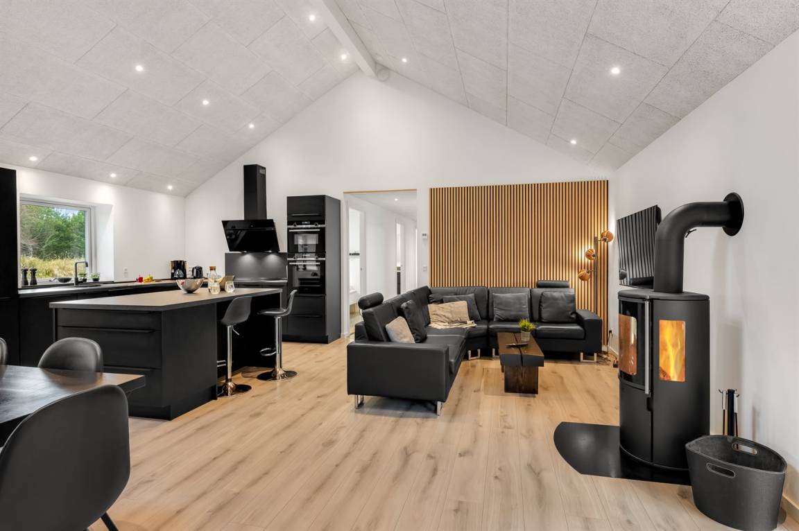 Das geräumige Ferienhaus verfügt über einen hellen und einladenden Küchen-Wohnbereich mit Essplatz und Kaminofen, der das perfekte Sommerhaus-Ambiente schafft – egal zu welcher Jahreszeit.