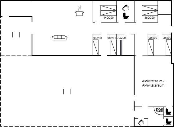 SchlafverhältnisseDie Schlafplätze verteilen sich auf 5 Schlafräume. 6 Schlafplätze in Doppelbetten. 4 Schlafplätze in Einzelbetten. 2 Schlafplätze in einem Etagenbett. 2 von diesen Schlafplätzen befinden sich im offenen Obergeschoss.