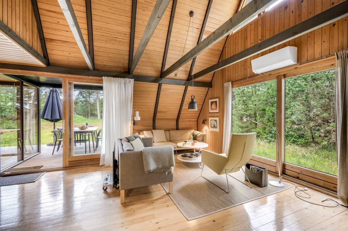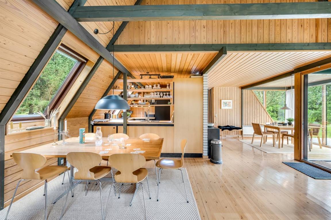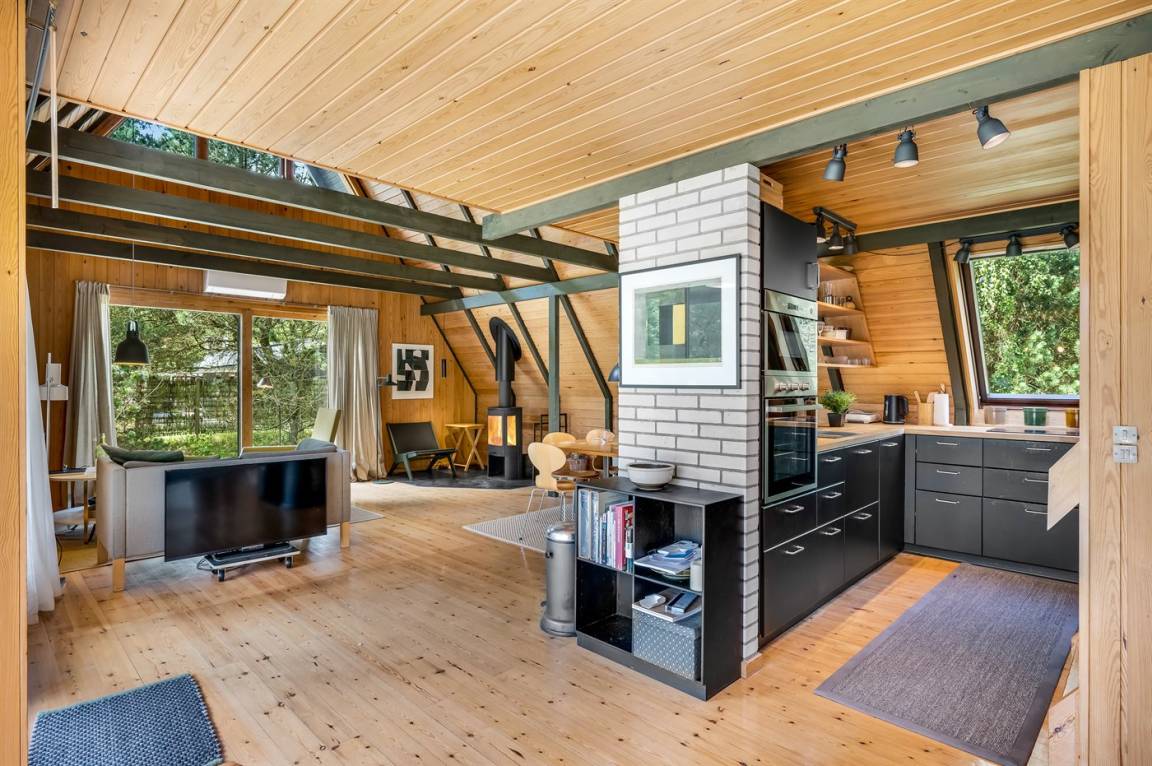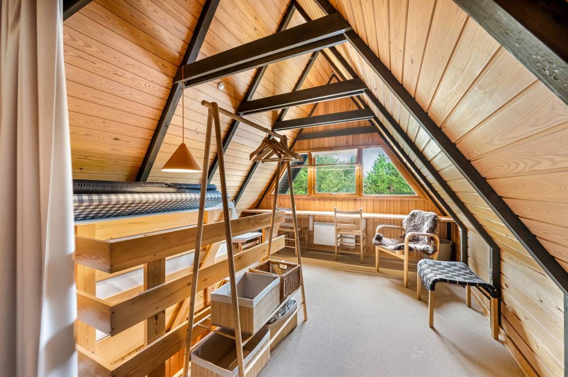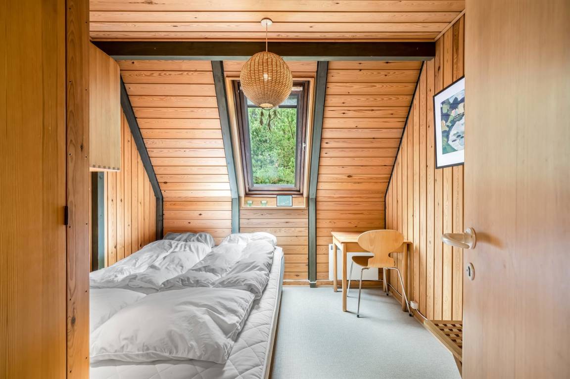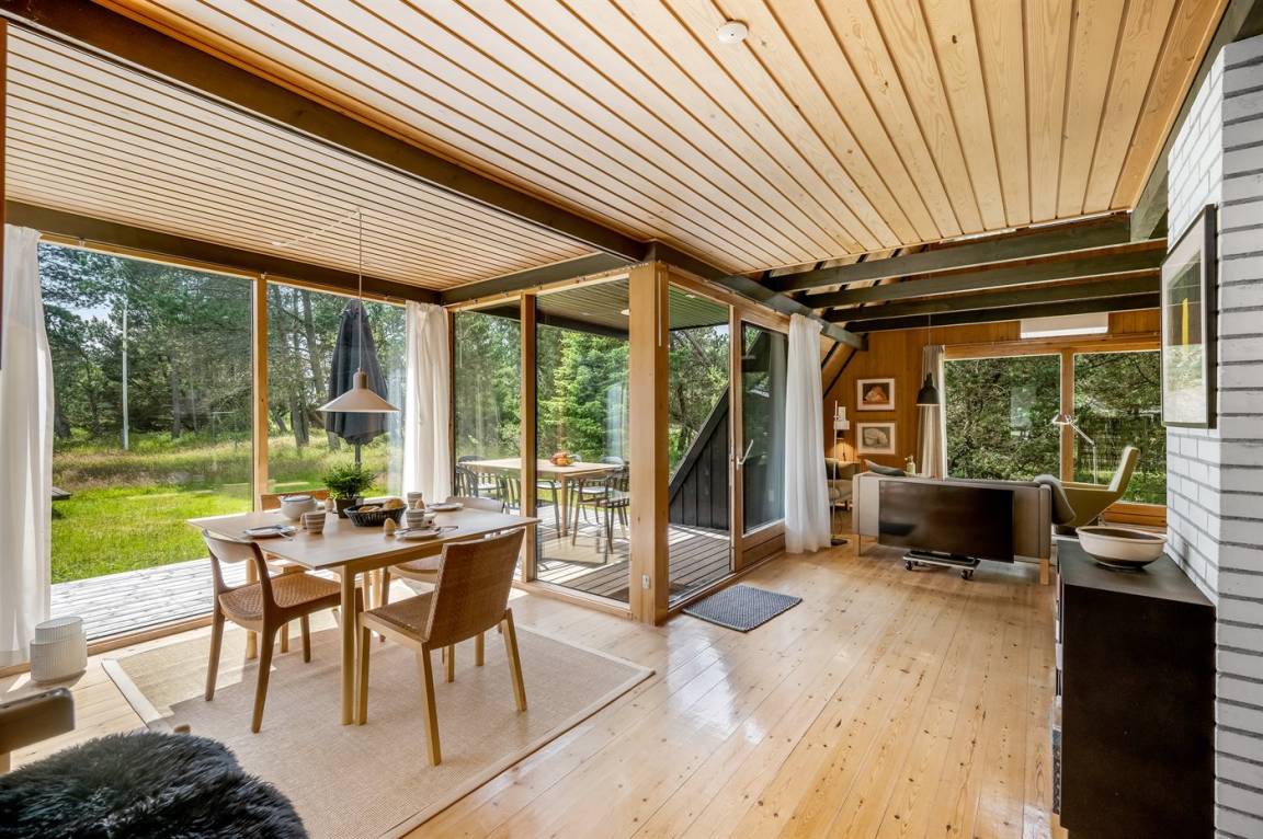 Ein gemütliches Ferienhaus, das an einer ruhigen Straße mitten in der Natur liegt. Das Ferienhaus ist in zwei Bereiche aufgeteilt - das Haupthaus, in 2 Etagen gebaut, mit zwei Schlafzimmern, einem Badezimmer, einem Wohnzimmer und einer Küche, sowie das Nebengebäude mit zwei großen Schlafzimmern und einem Badezimmer. Zwischen den beiden Gebäuden befindet sich eine große Holzterrasse, die zur Straßenseite hin abgeschirmt ist, sodass du dich ungestört auf dem Grundstück hinter dem Haus aufhalten kannst.