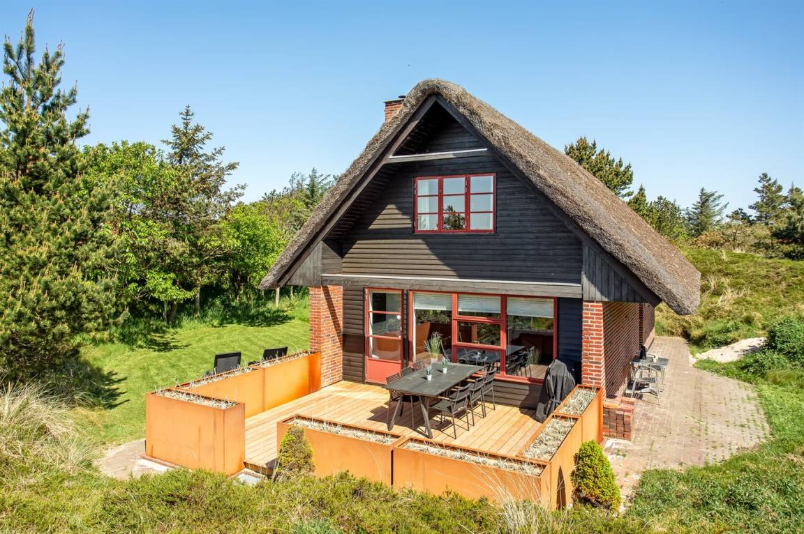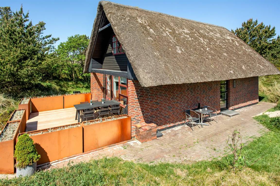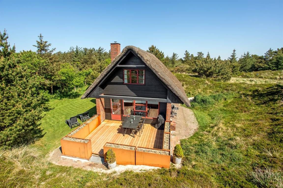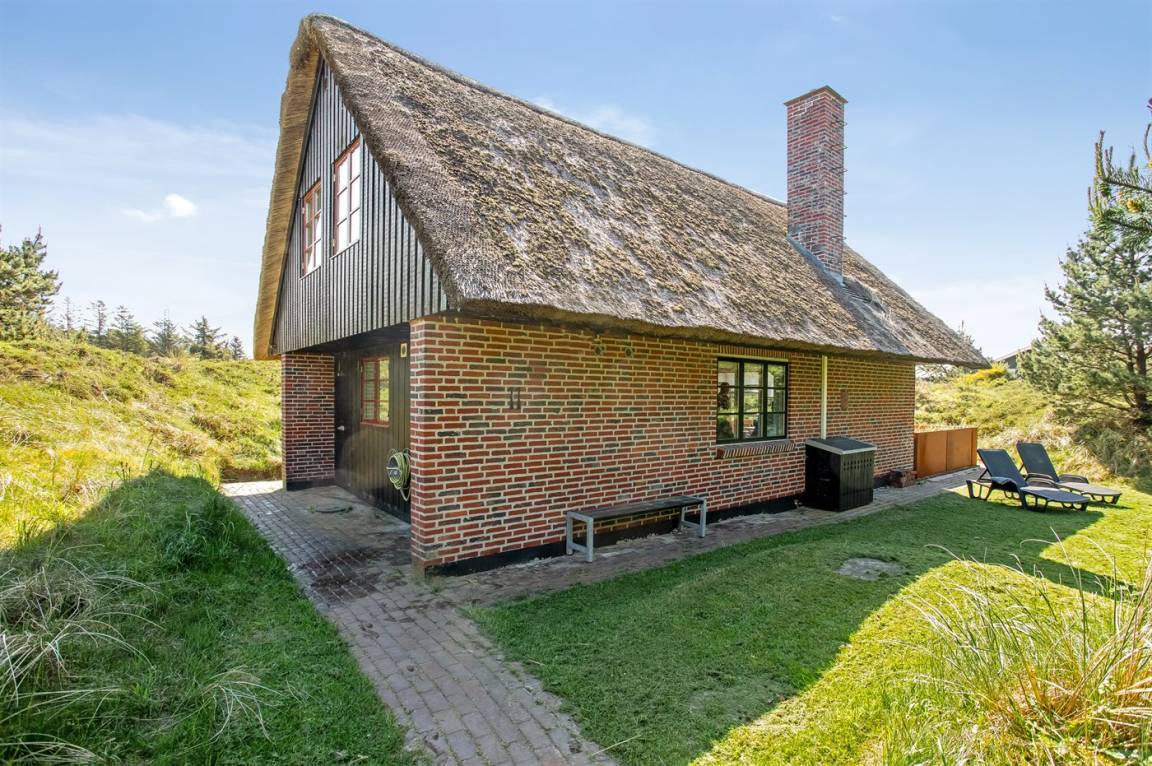 Dieses gemütliche Ferienhaus mit Reetdach liegt auf einem 2.857 m² großen und mit Heidekraut bewachsenen Dünengrundstück, wo Sie vom höchsten Punkt aus das Meer sehen können. Das Meer und Einkaufsmöglichkeiten liegen etwa 500 m entfernt.