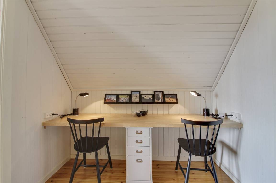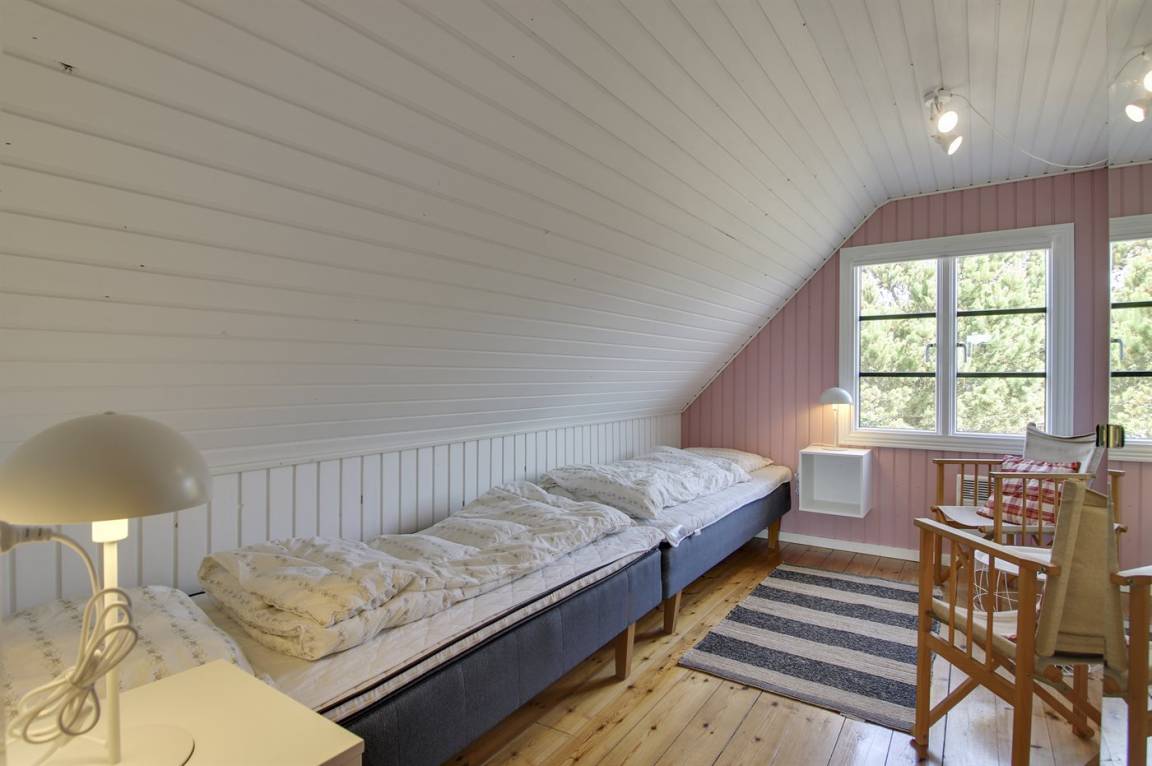 Im Obergeschoss, wo die Böden aus massiven Kieferndielen bestehen, gibt es einen Vorraum mit einem Arbeitstisch und 3 Schlafzimmer; 2 mit Doppelbett und 1 mit je 2 Einzelbetten.