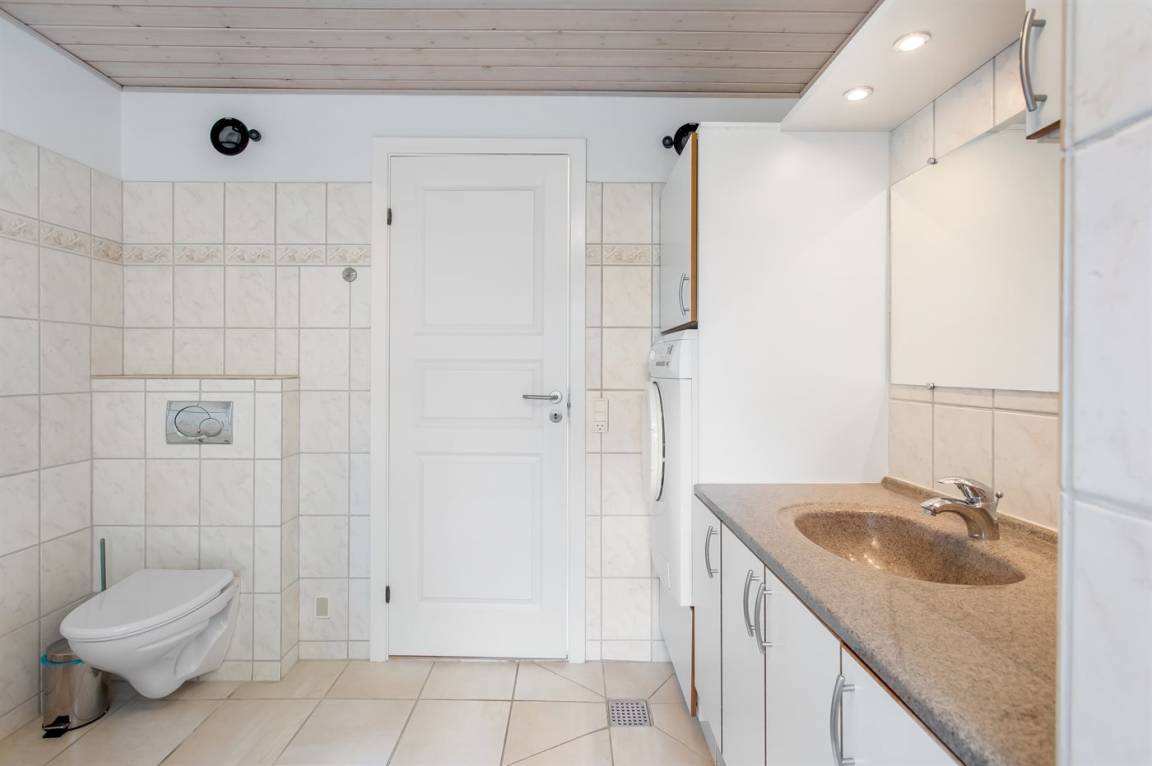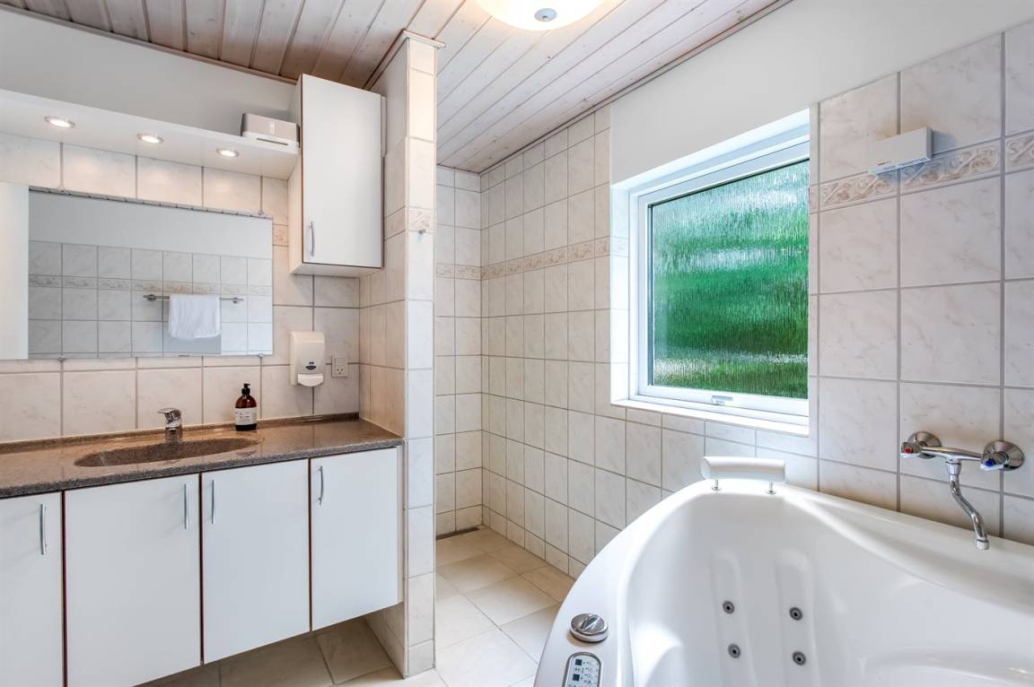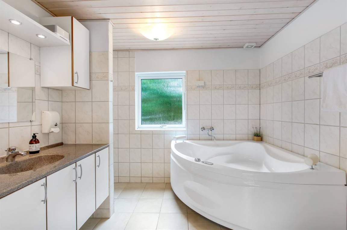Das große Badezimmer ist mit Fußbodenheizung, Duschnische, Innen-Durchlauf-Whirlpool, Toilette, Waschmaschine und Wäschetrockner ausgestattet. Darüber hinaus gibt es eine zusätzliche Gäste-Toilette. Der Innen-Durchlauf-Whirlpool bietet Platz für 2 Personen – perfekt zum Entspannen nach einem Tag am Strand.