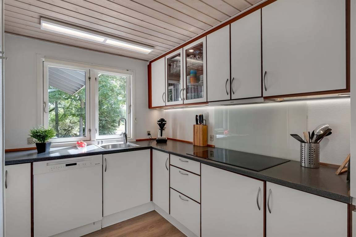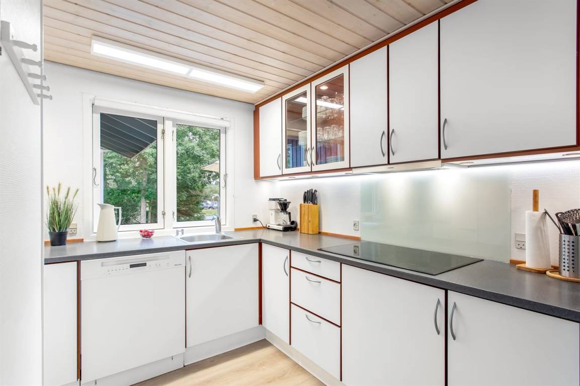 Die gut ausgestattete Küche verfügt über Induktions-Kochzonen, Umluftofen, Mikrowelle, Geschirrspüler sowie einen Kühlschrank mit Gefrierfach.