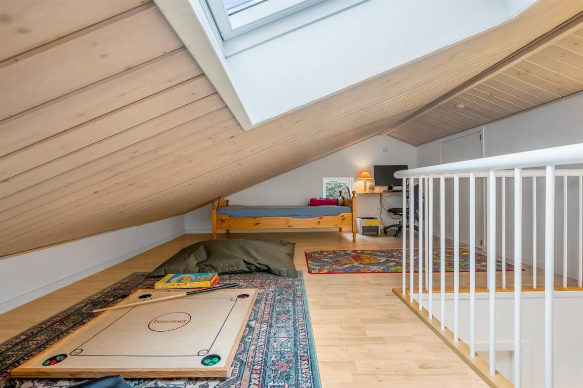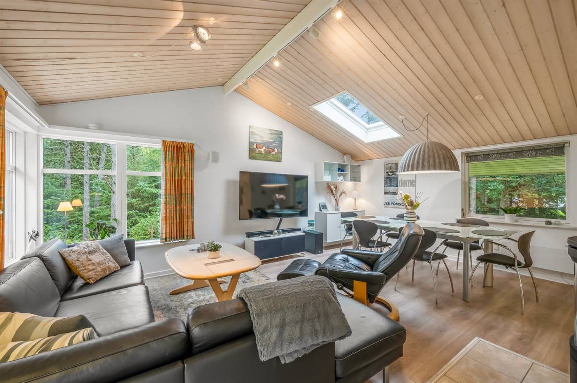 Das Haus verfügt über ein helles Wohnzimmer mit offenem Dach bis zum First, einem elektrisch bedienbaren Dachfenster und einem neuen Kaminofen aus dem Jahr 2024. Auf dem offenen Obergeschoss findest du einen kleinen Aufenthaltsbereich mit Sitzsäcken und Spielen – ideal für Kinder oder eine ruhige Lesestunde.