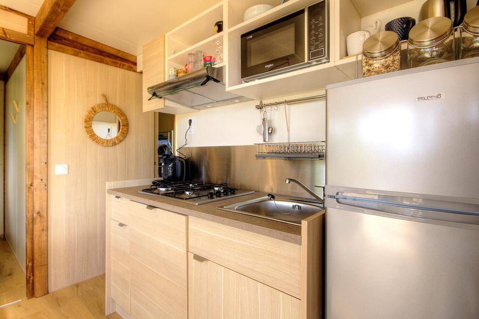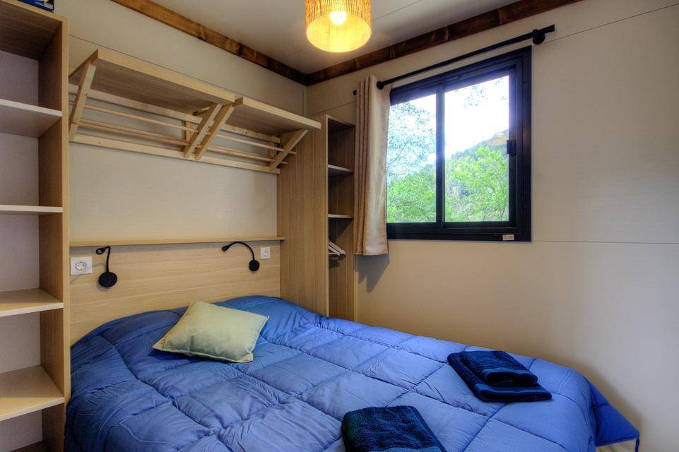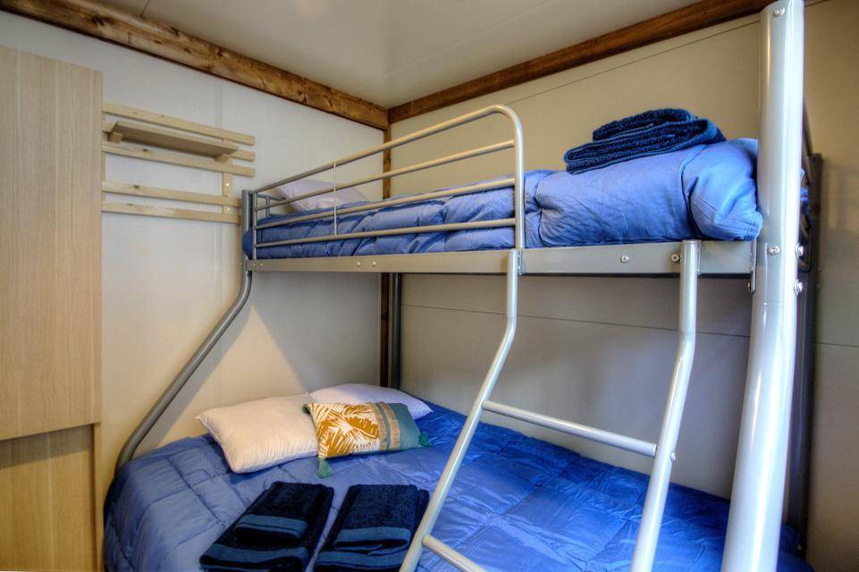 - 1 Zimmer mit einem Bett 140x190 cm und einem Etagenbett 90x190 cm (das obere Bett ist nicht für Kinder unter 6 Jahren geeignet).