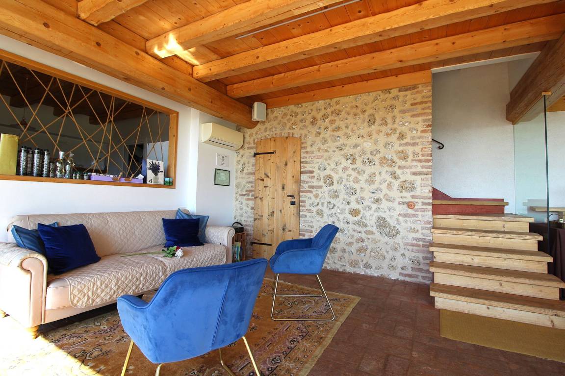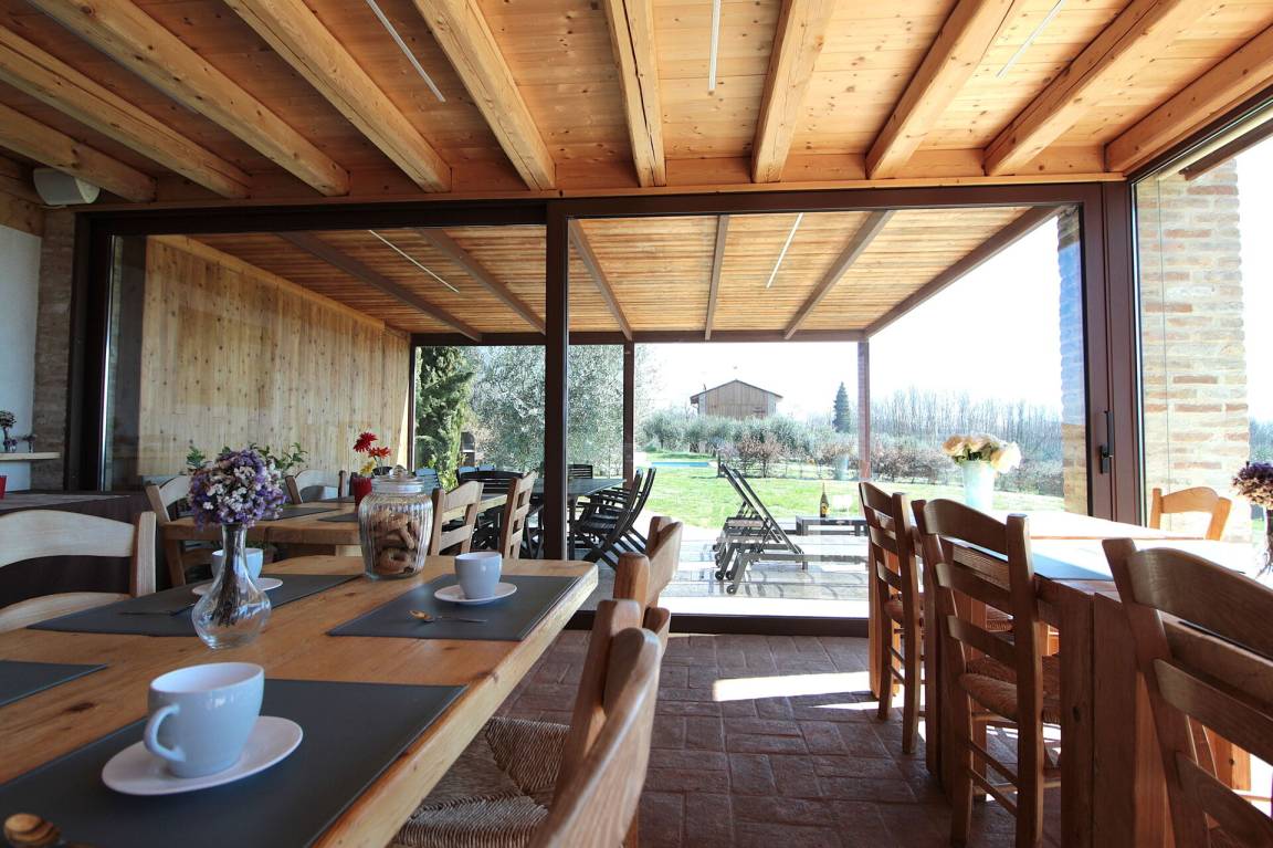 Esszimmer: drei Esstische, Sessel, Klimaanlage, WiFi Internet, Ausgang auf den Garten.