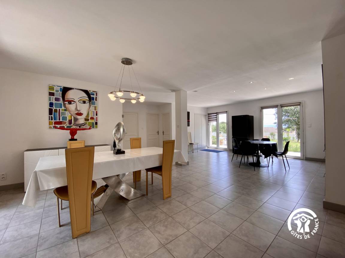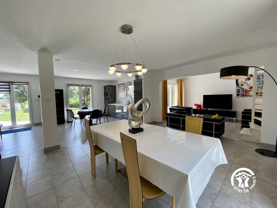 „TRES BEAU ET GRAND GITE AVEC UN GRAND ESPACE DE VIE. LA DECORATION EST TRES BELLE ET NOUS AVONS BEAUCOUP APPRECIE LE CALME ET LA TRANQUILITE DE L'ENDROIT MAIS PEUT ETRE UN PEU TROP ELOIGNE DE TOUS COMMERCES (PAS DE BOULANGERIE). LA PISCINE EST SUPERBE ET TRES GRANDE. LE PROPRIETAIRE EST TRES SYMPATHIQUE ET TRES ACCEUILLANT. NOUS AVONS BEAUCOUP APPRECIE NOTRE SEJOUR ET NOUS REVIENDRONS.“