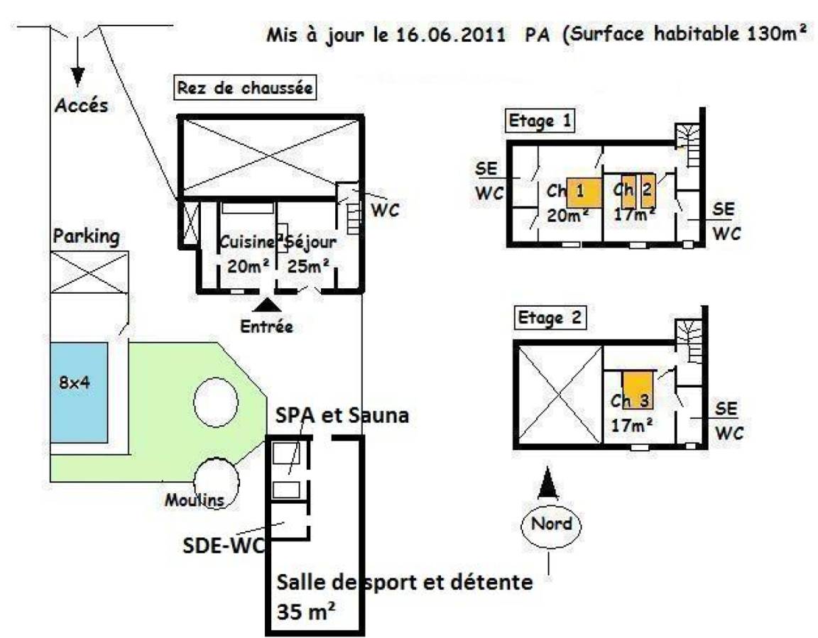Haus auf 3 Stockwerken: Wohnzimmer, Küche-Esszimmer, wc. Auf der 1st Betten 2 CH SE - WC mit SB - WC privat von CH, 1 Bett 160 und 2 90. Im 2. Stock, CH mit SE - WC, 1 Bett 160 cm. (Dvd) Satellitenfernsehen in allen Zimmern. Clim umschaltbar in alles inklusive teilen.