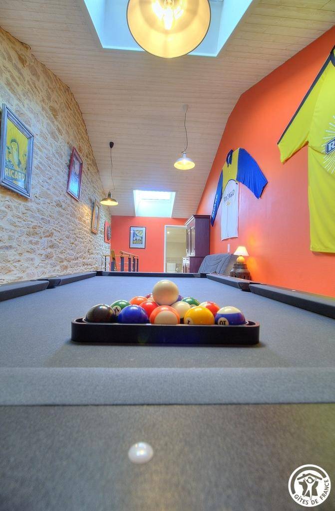 Vom Wohnzimmer aus (über eine Treppe erreichbar): eine Lounge mit Treppe zum Billardtisch und ein Badezimmer mit WC.