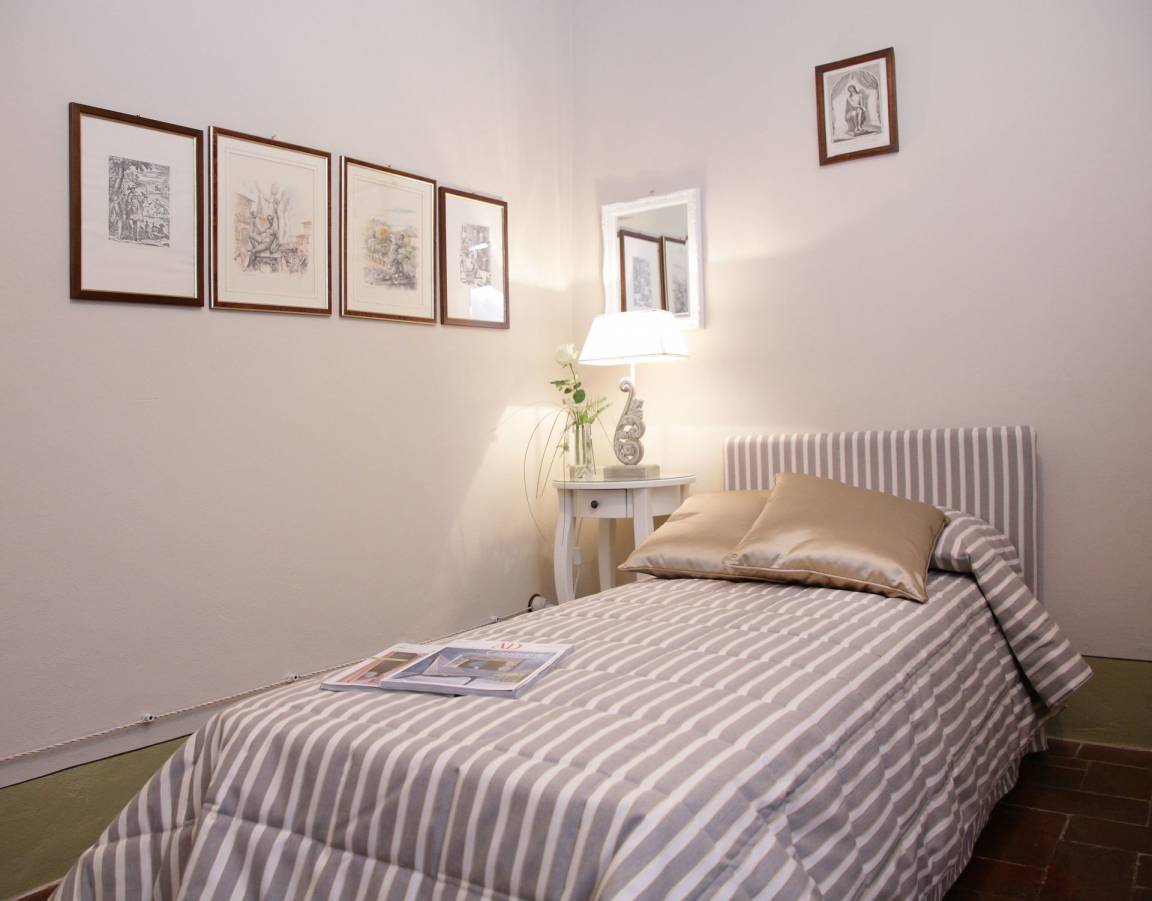 Schlafzimmer mit Bad 2: Einzelbett, WiFi Internet, Waschbecken, WC, Bidet, Dusche, Fön, Ausgang auf den Balkon.