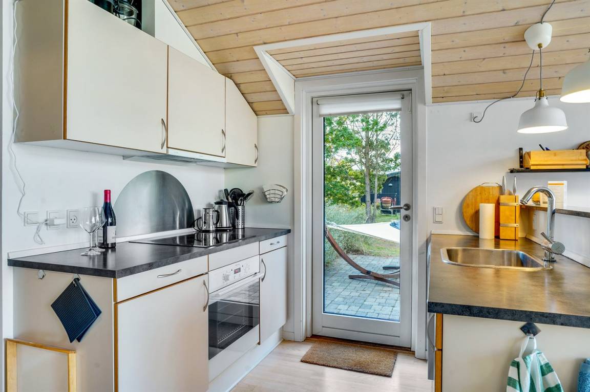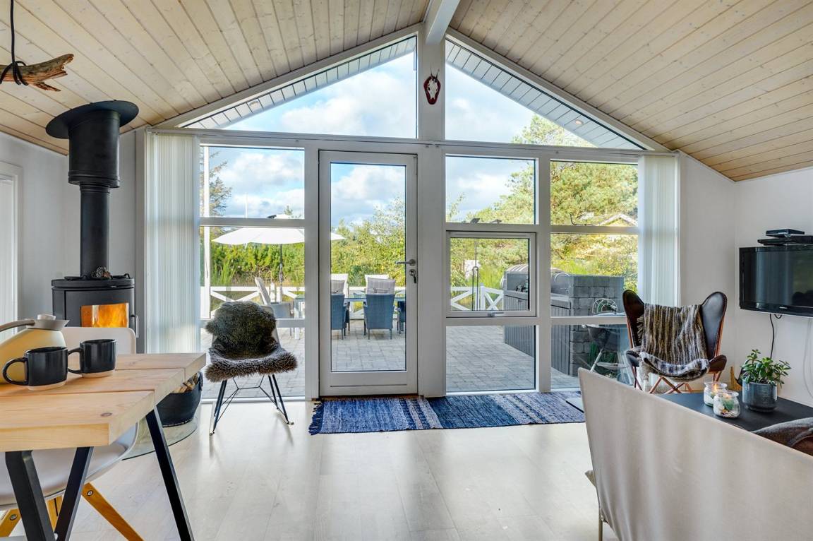 Das Ferienhaus ist für 4 Personen geeignet und verfügt über 2 Schlafzimmer, beide mit Doppelbetten. Sowohl aus der Küche als auch aus dem Wohnzimmer kannst du durch die großen Panoramafenster die Aussicht auf Strandwiese und Dünen genießen. An kühlen Abenden sorgt der Holzofen für Wärme und Gemütlichkeit.