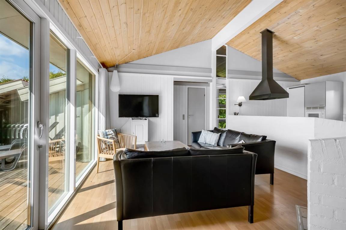Nicht weit vom Fjord entfernt liegt dieses schöne Ferienhaus in einem Ferienhausgebiet, das von schöner Natur mit Wald, Seen und großen Feldern umgeben ist. Von den großen Fensterfronten im Wohnzimmer können Sie die Aussicht auf den Fjord genießen.