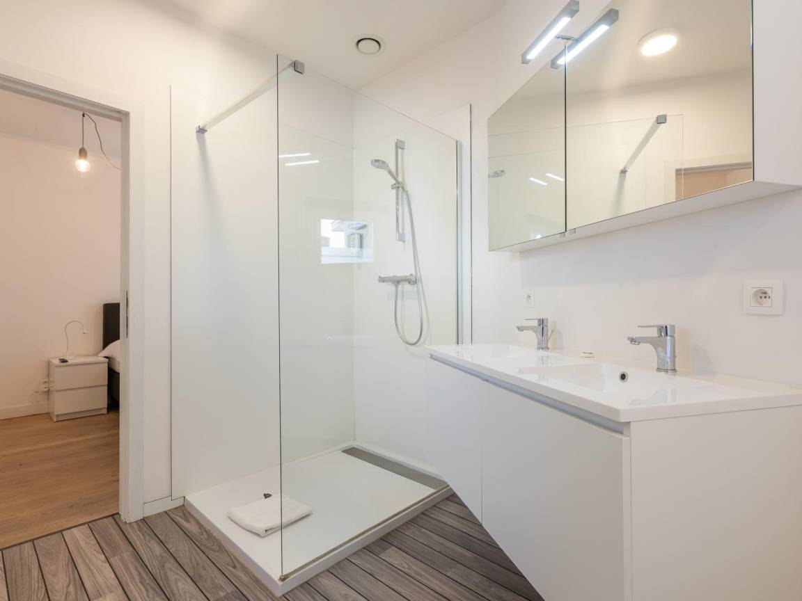 In der 1. Etage: Schlafzimmer mit Doppelbett, TV(smart TV) , Schlafzimmer mit Badezimmer mit Doppelbett(180 x 200 cm), TV(smart TV), Badewanne, Dusche, 2x Waschbecken, Toilette , Dachterasse, 2x Kinderbett (inklusive Bettwäsche)