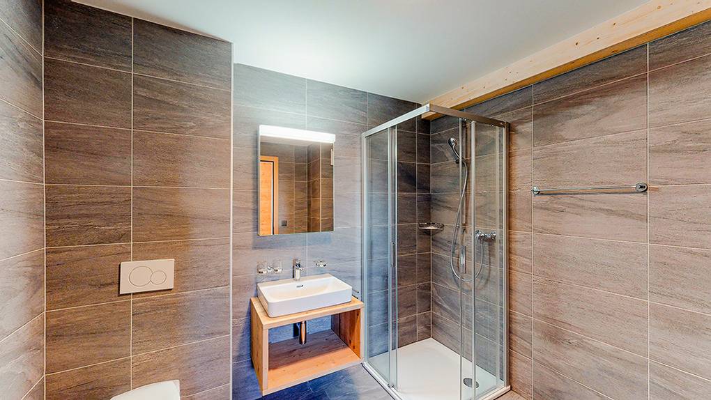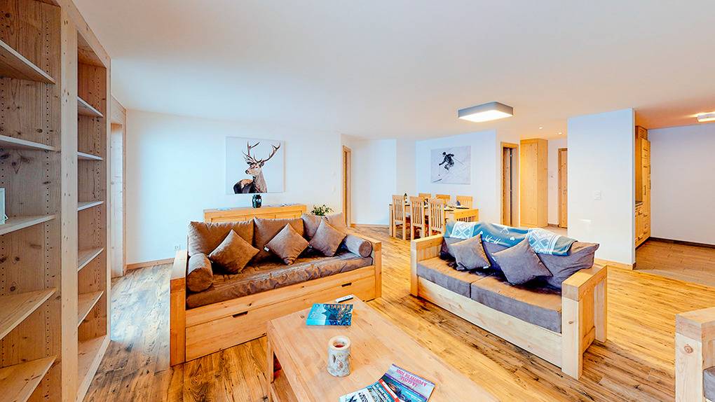 CH 385.44 Wohnung 8-14 Pers.: 6 Zimmer, 195 qm über zwei Etagen. Großer Wohnraum mit Sitzgruppe (Schlafsofa 2 Pers.), TV, Esstisch, Küchenzeile. Galerie, offen zum Wohnraum mit weiterer Sitzecke (Schlafsofa 2 Pers.). Vier Doppelzimmer. Kleines 2-Bettzimmer mit Etagenbett (ohne Fenster). Fünf Bäder: je Du oder Bw, Wb, WC.